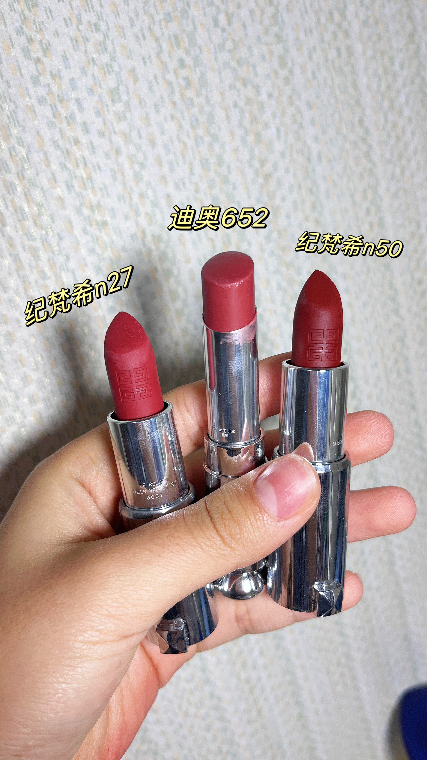 1⃣️纪梵希n27少女感白桃奶盖! 上嘴超轻薄,一点不拔干! 超级日常百搭,素颜涂完全OK 2⃣️纪梵希n50 复古华丽 以茶棕为底,浓郁显白 丝滑好上色,秋冬必备! 3⃣️迪奥652 清透水光感! 超级润,可甜可清冷的颜色 上嘴轻薄,素颜通勤完全可以!