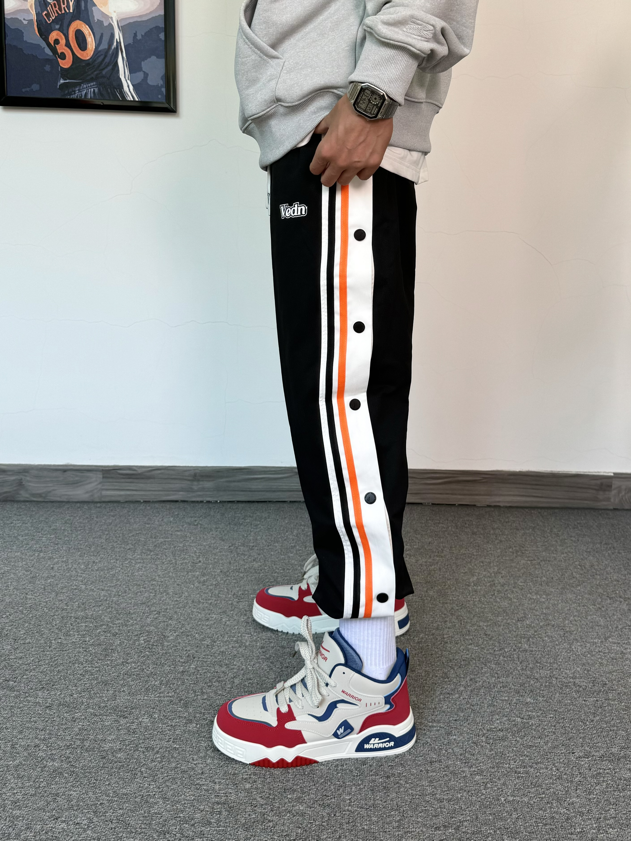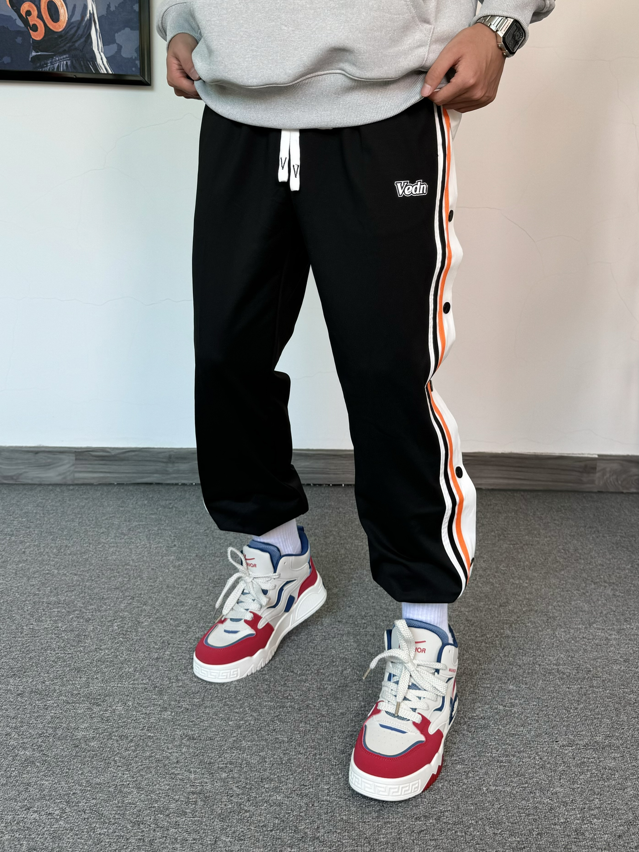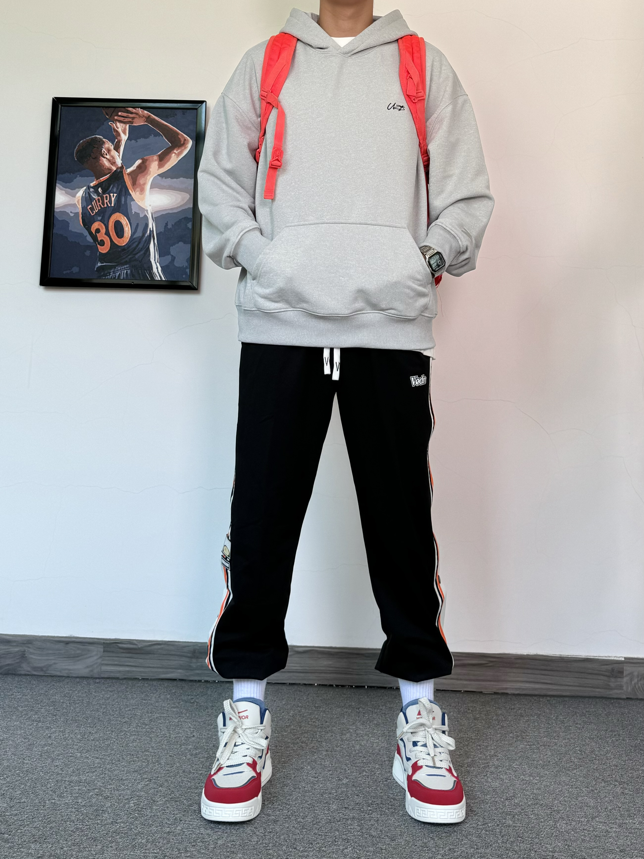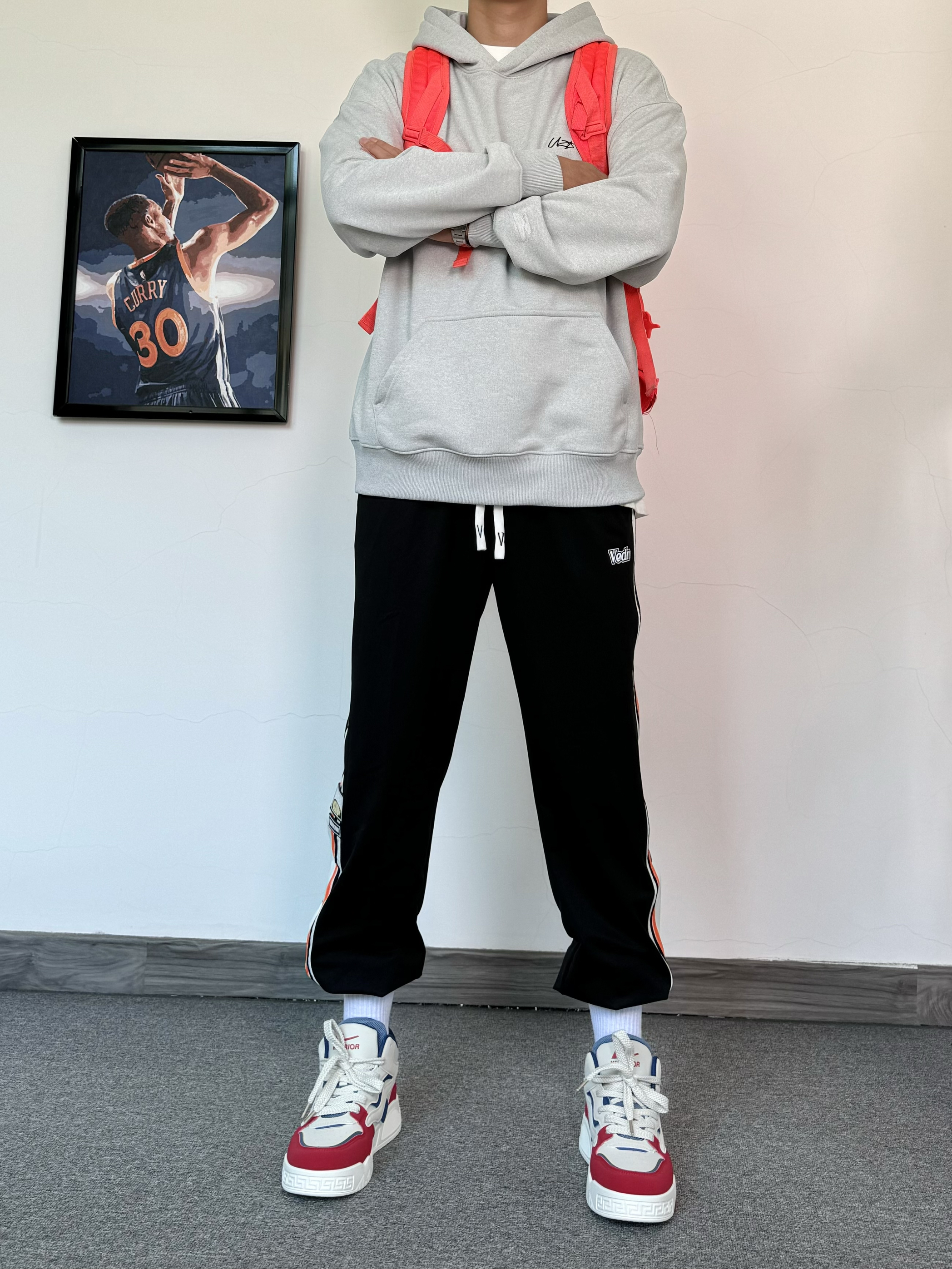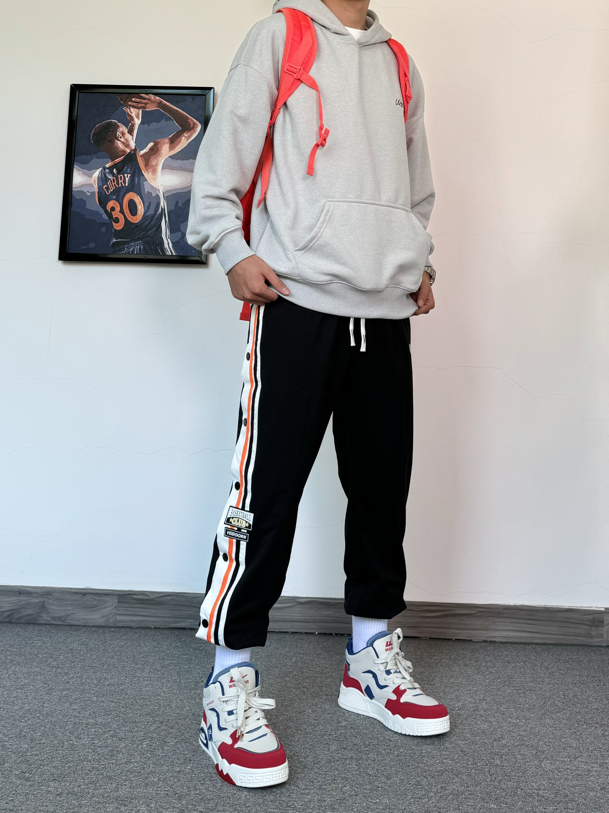 入冬还得是美式风格穿搭~ 上身一件重磅连帽卫衣 搭配束脚排扣裤 运动感十足 在脚下一双美式板鞋 高帮设计更有包裹感✨ 配色与今日穿搭也太配了吧