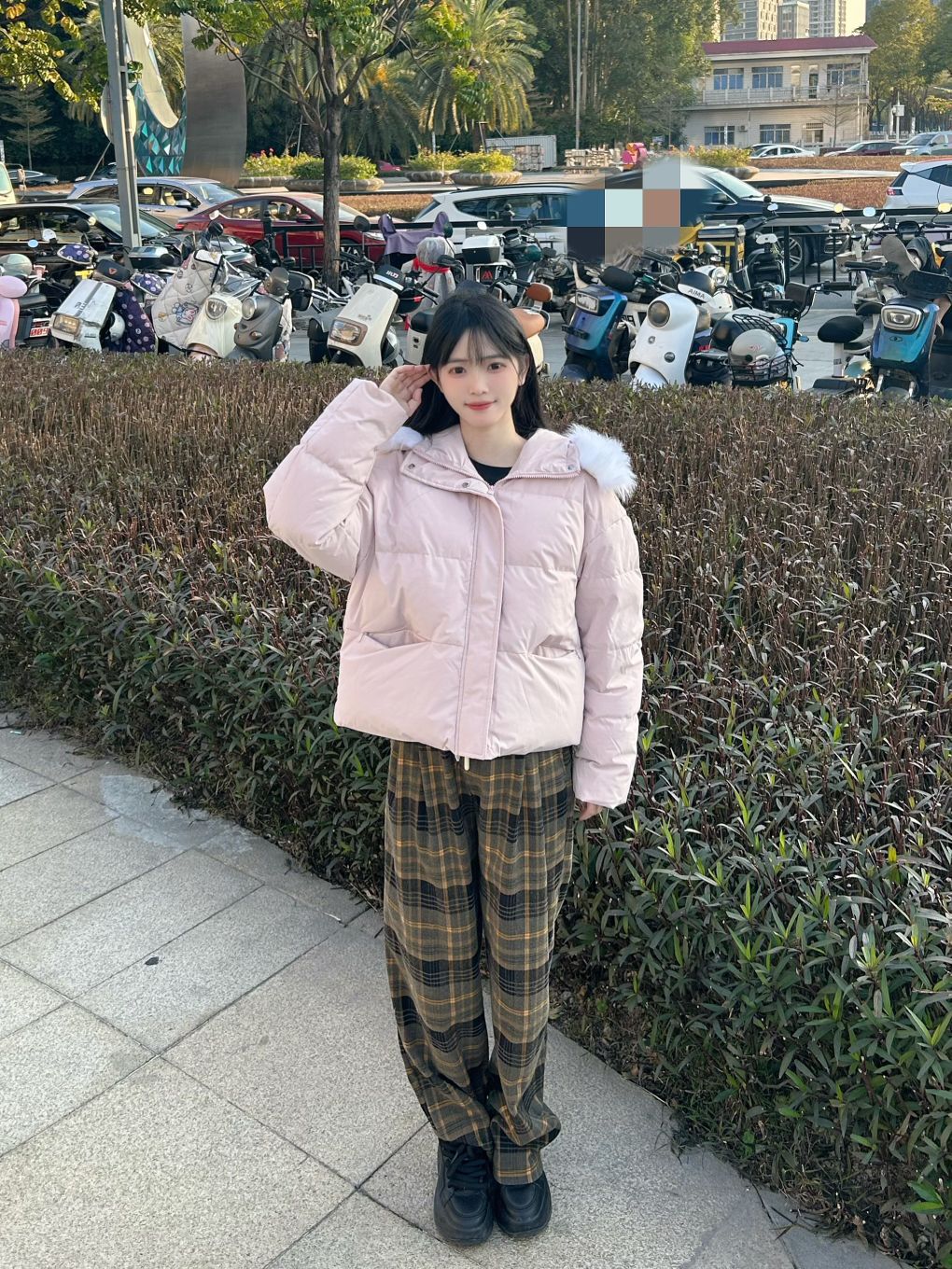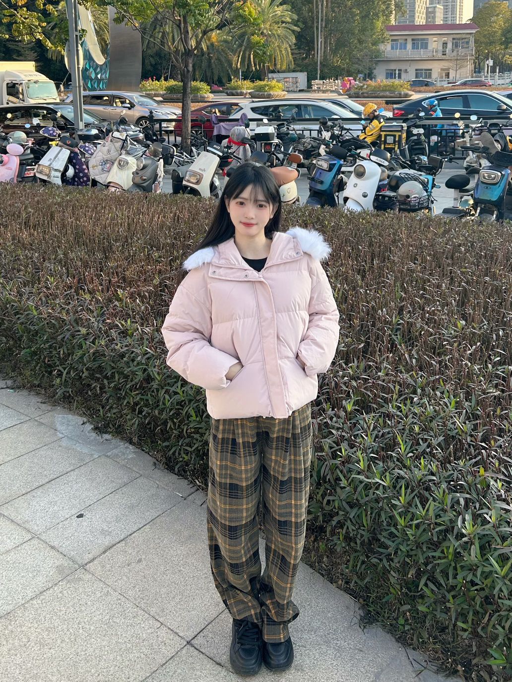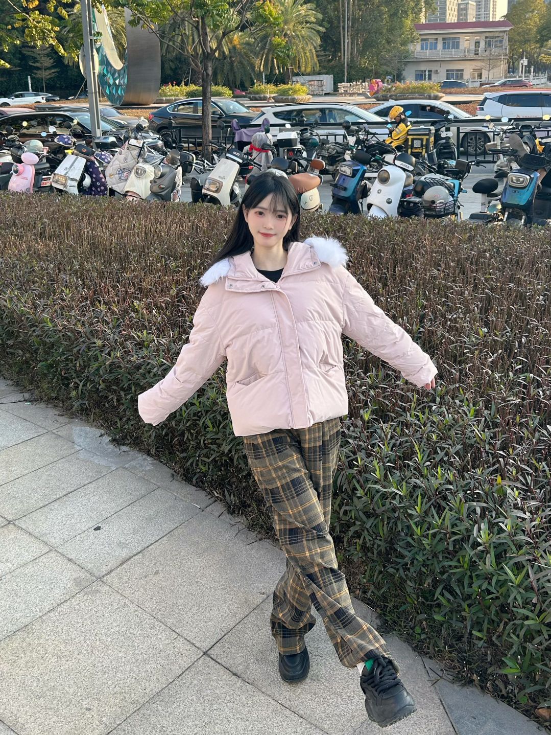 哈喽,家人们,今天的穿搭分享来啦,是一套我的秋冬少女感羽绒服穿搭分享~ 粉色连帽毛领羽绒服+格子直筒阔腿裤+黑色高帮板鞋 一整套我的秋冬少女感羽绒服穿搭get~ 尺码参考: 身高、体重:160、95 衣服:m裤子:s鞋子:36