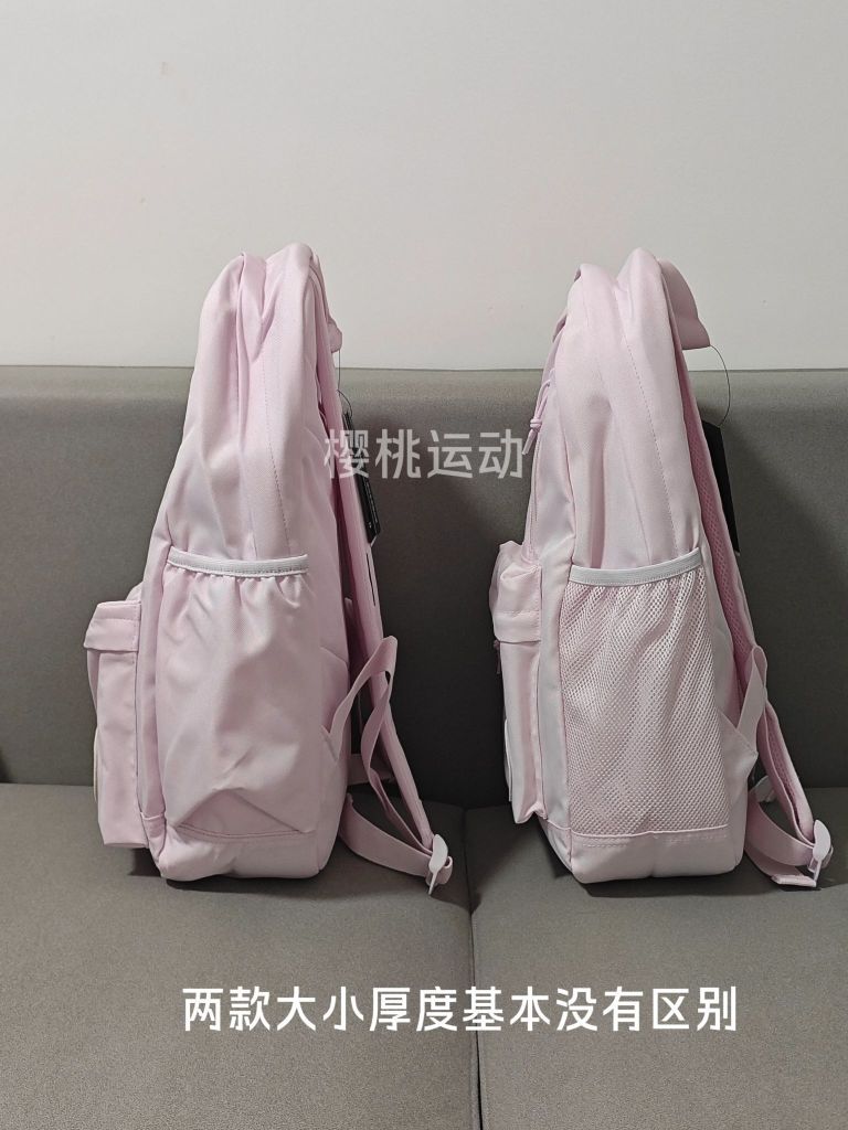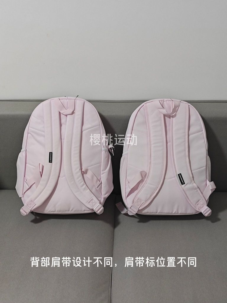 颜色:首先两款目前我拿到的颜色是有轻微出入的,老款稍微紫一点点,但是后续批次不同,不能确定,但是基本相差不大 区别:拉链,背带,外兜内里,侧面水杯兜,隔层 相同:大小相同,容量相同,款式基本没啥区别