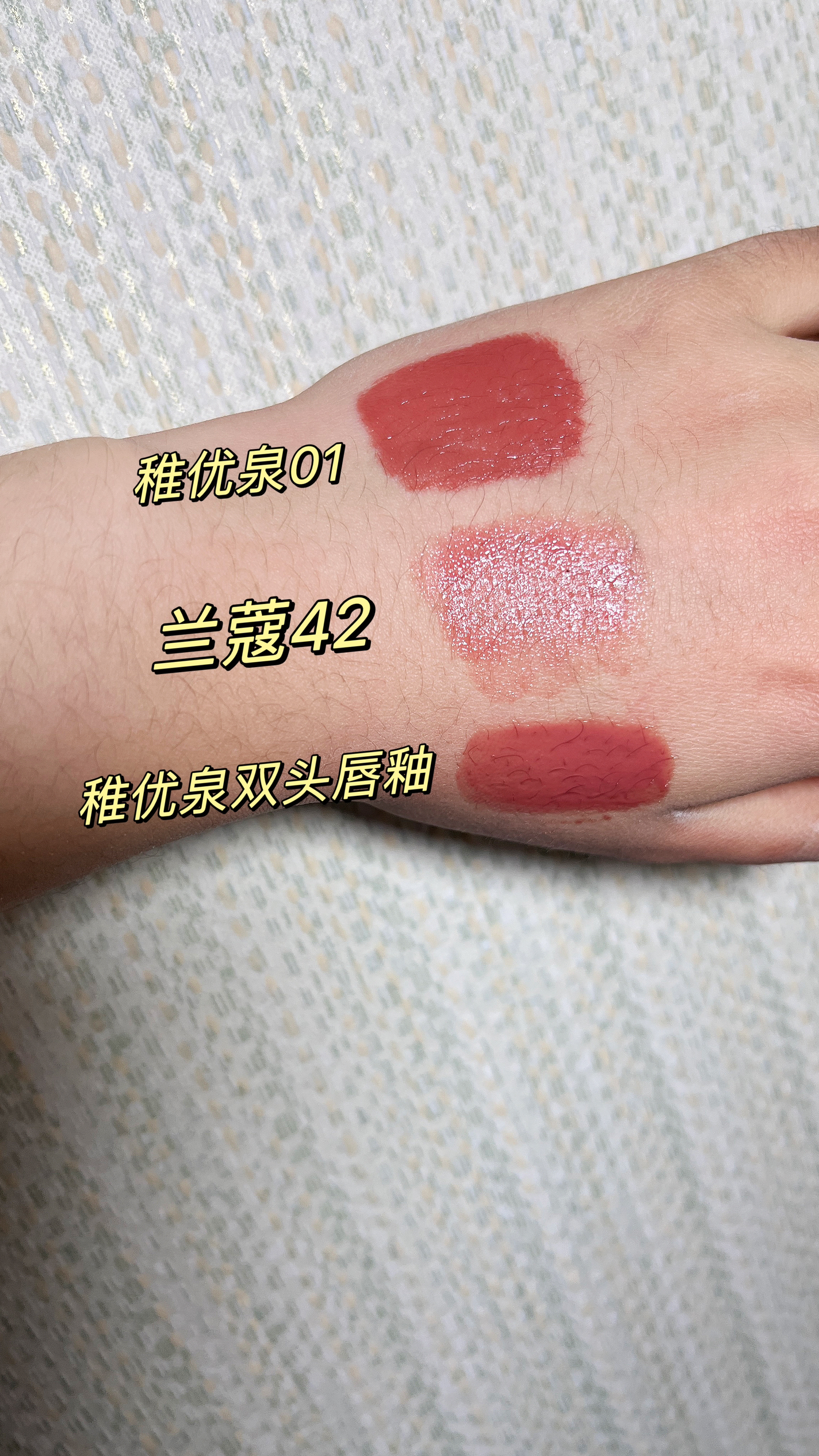 1⃣️兰蔻42 这支就是为素颜准备的!润唇膏一样的质地! 温柔豆沙!提气色! 2⃣️稚优泉01 闻起来想一口吃掉!这只素颜涂很OK! 3⃣️稚优泉双头唇釉! 真的很爱稚优泉的双头唇釉! 可以叠涂!叠涂完就是镜面唇釉的效果!