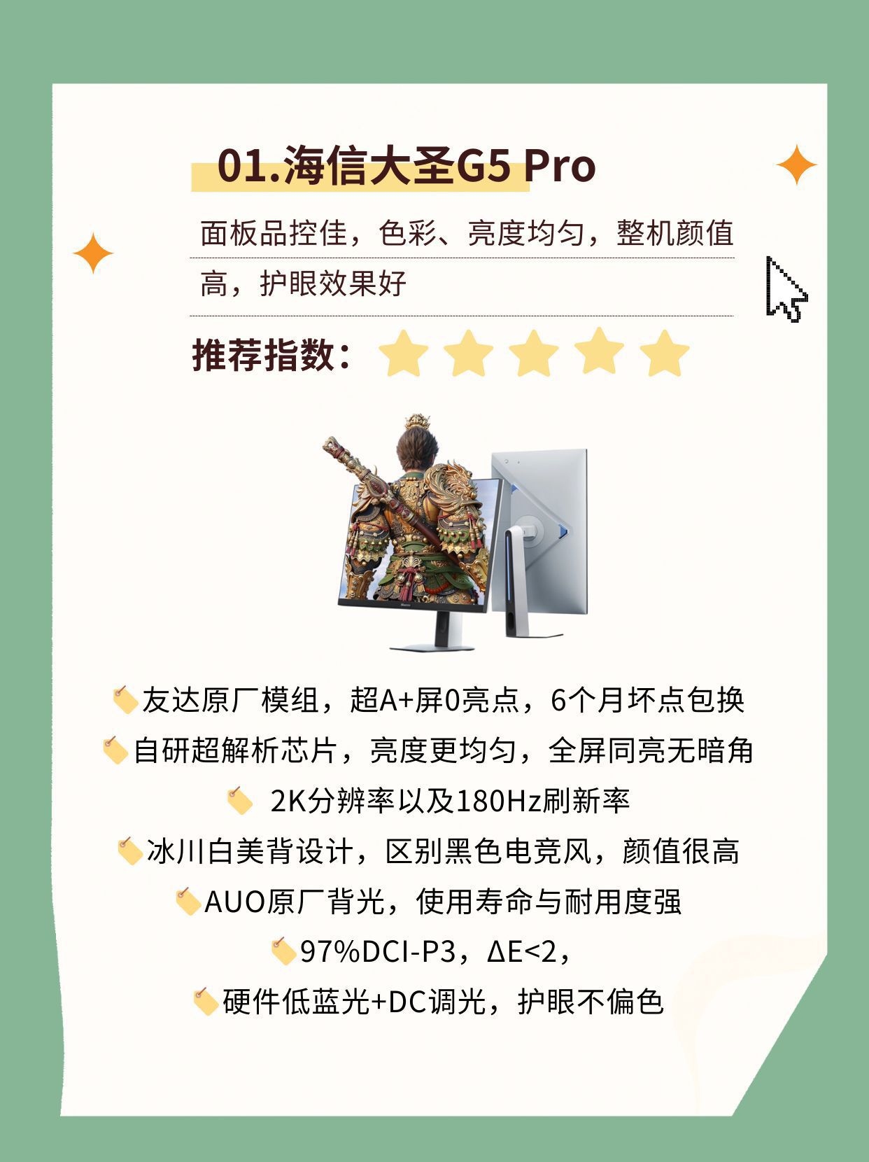 预算在千元左右,平时喜欢玩FPS游戏,对画质还有一定要求 显示器到底怎么选?🖥️ 小白别纠结,我已经给大家准备了三款千元价位2K 180Hz显示器的详细参数 大家可以参考一下,干货不少,可以先点赞收藏👍 一、显示器选购指南(p2) 1️⃣ 显示器尺寸 2️⃣ 刷新率&分辨率 3️⃣ 面板品控 4️⃣ 灰阶响应时间 5️⃣ 色域、色准 二、热门千元显示器参数解析 1️⃣海信大圣G5 Pro ...