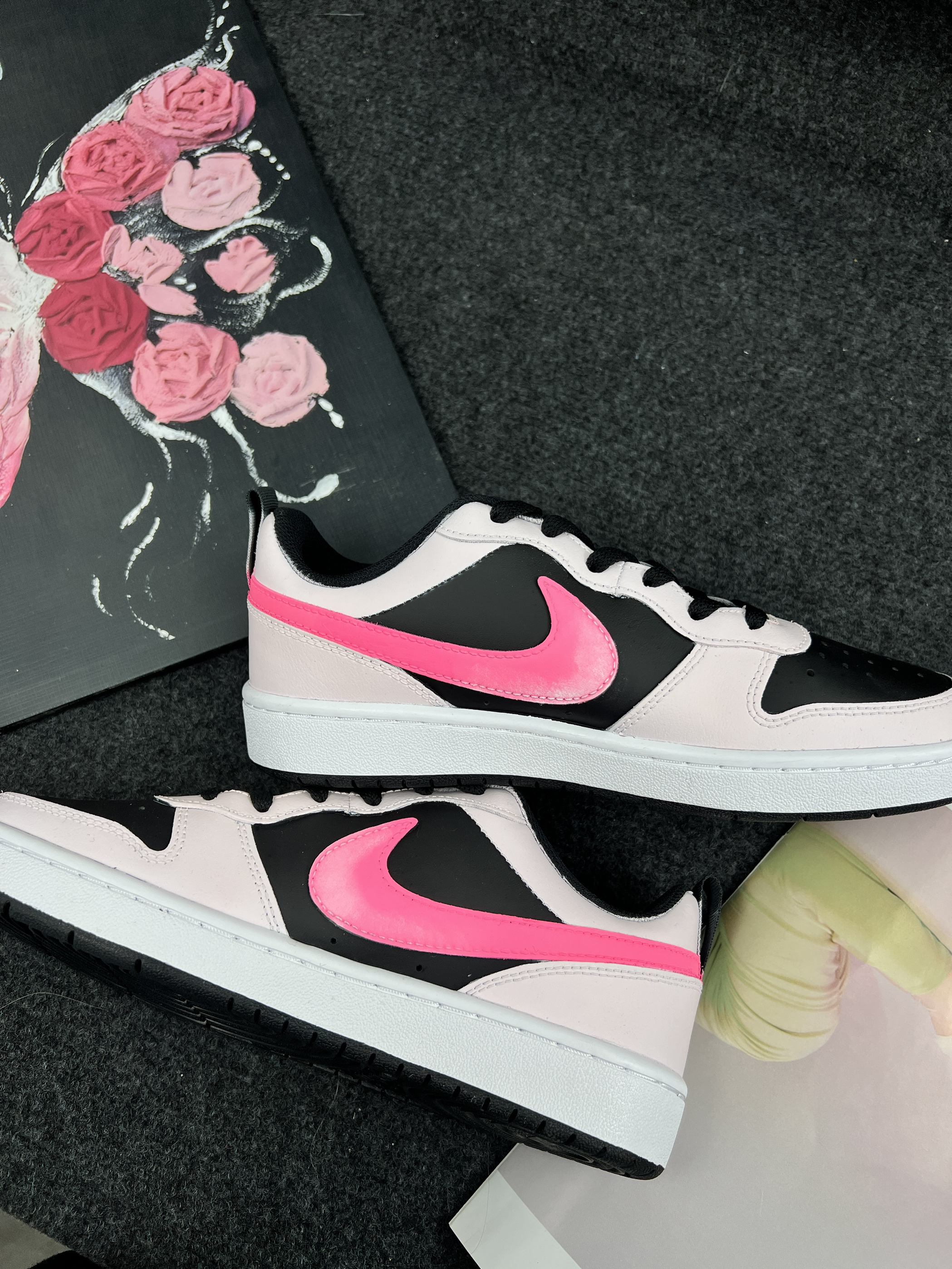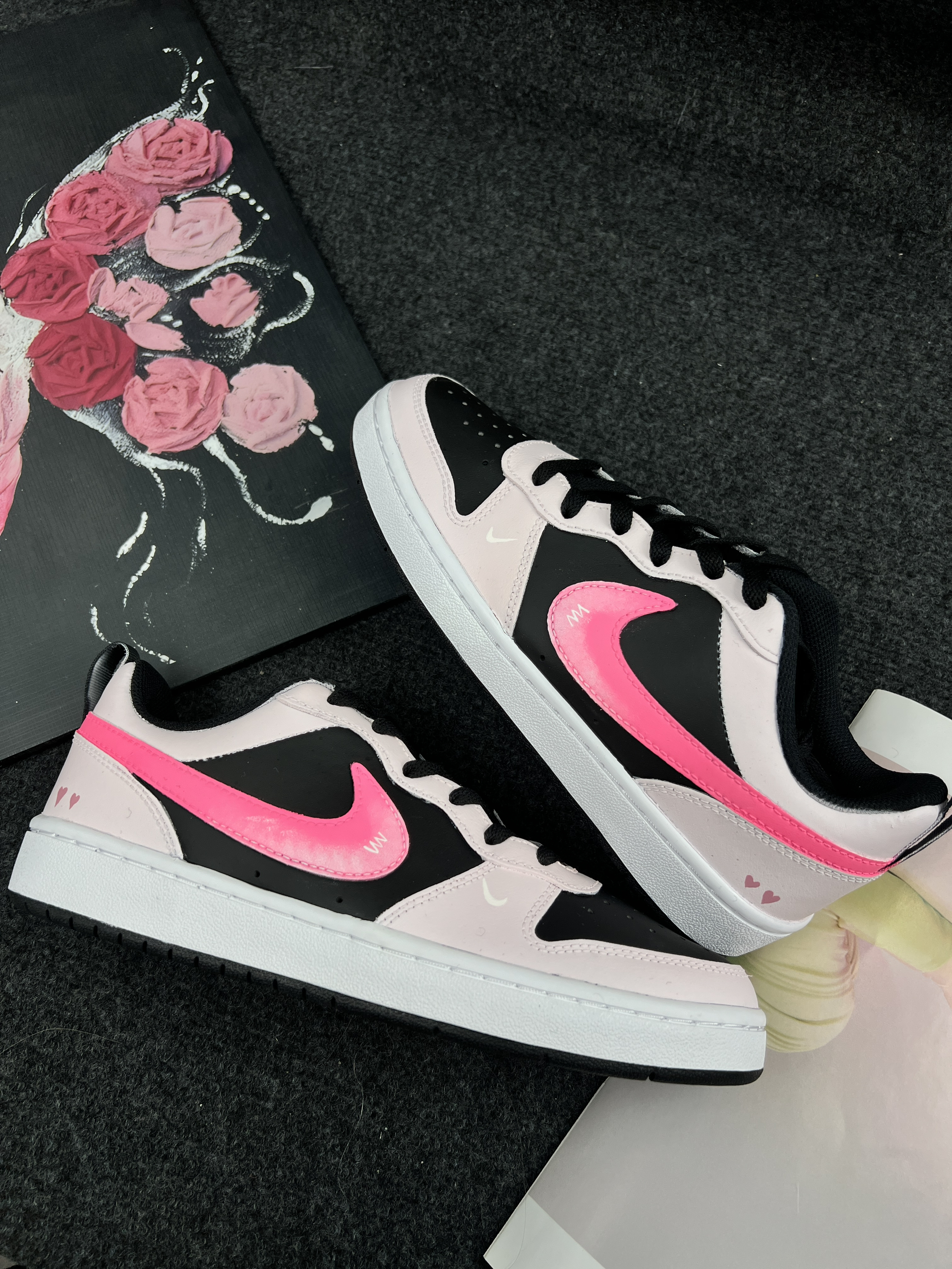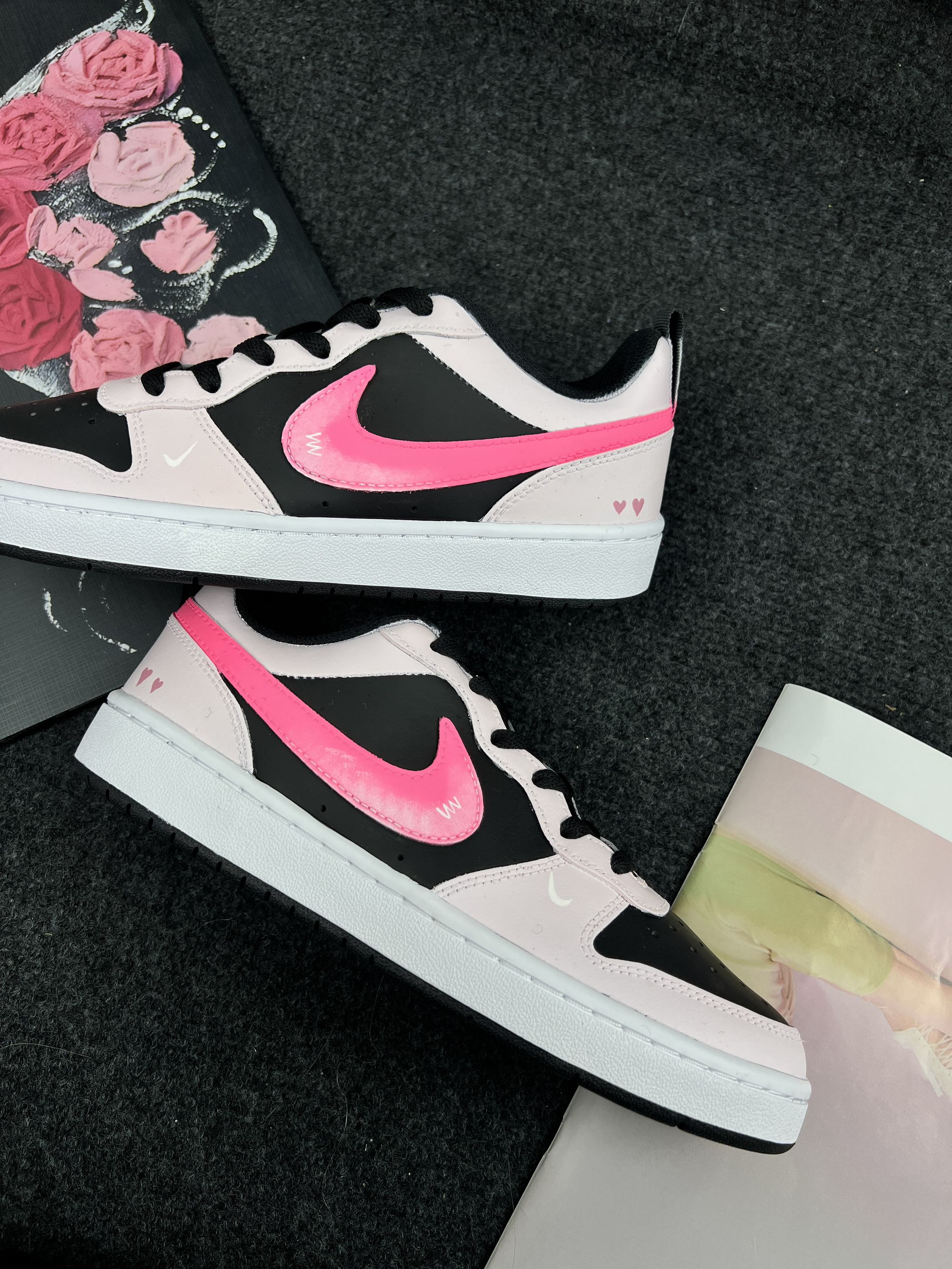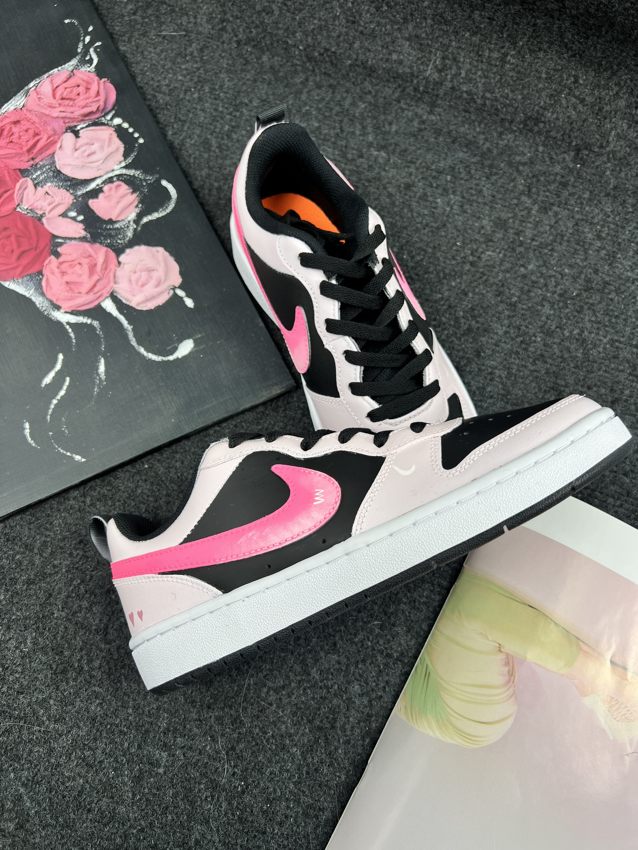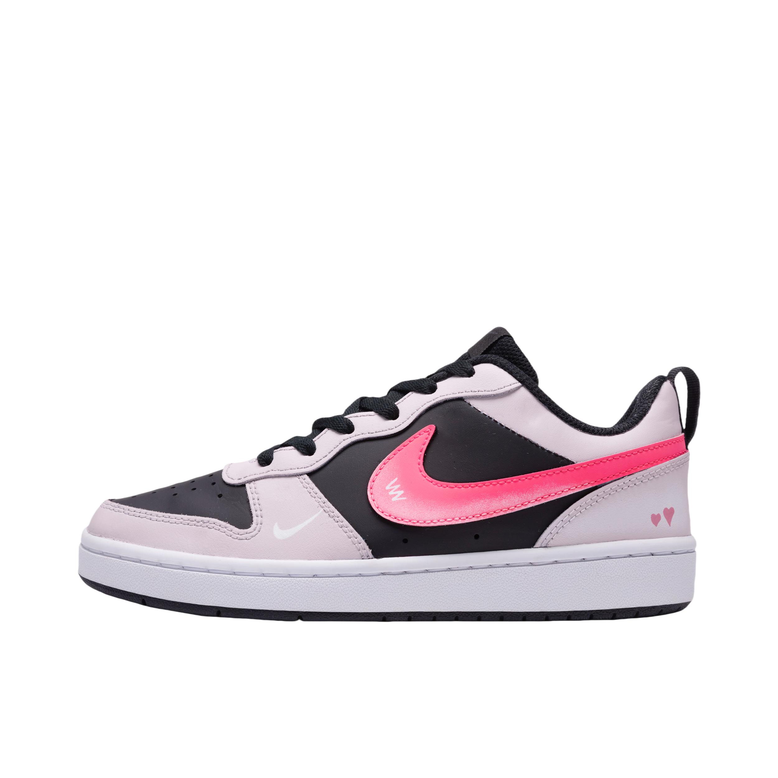 它具有复古的外观设计,融合了简洁与时尚元素。从图片中可以看到,这款定制的Nike Court Borough在基础款上加入了个性化的元素,如粉色的Nike标志和心形图案,使其更加独特和美观。鞋面通常采用皮革或合成材料,提供耐用性和一定的支撑性。内部可能有舒适的鞋垫,以增加穿着的舒适度由于其时尚的外观和舒适的穿着体验,Nike Court Borough非常适合在日常生活中搭配各种休闲服装,如牛仔裤...