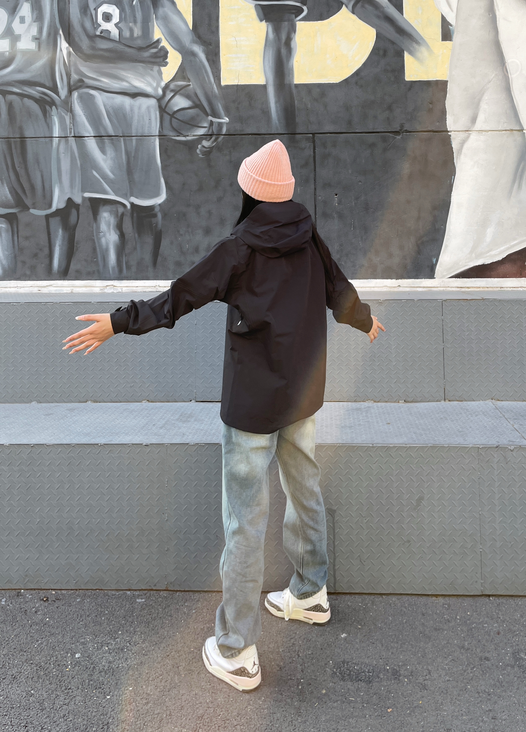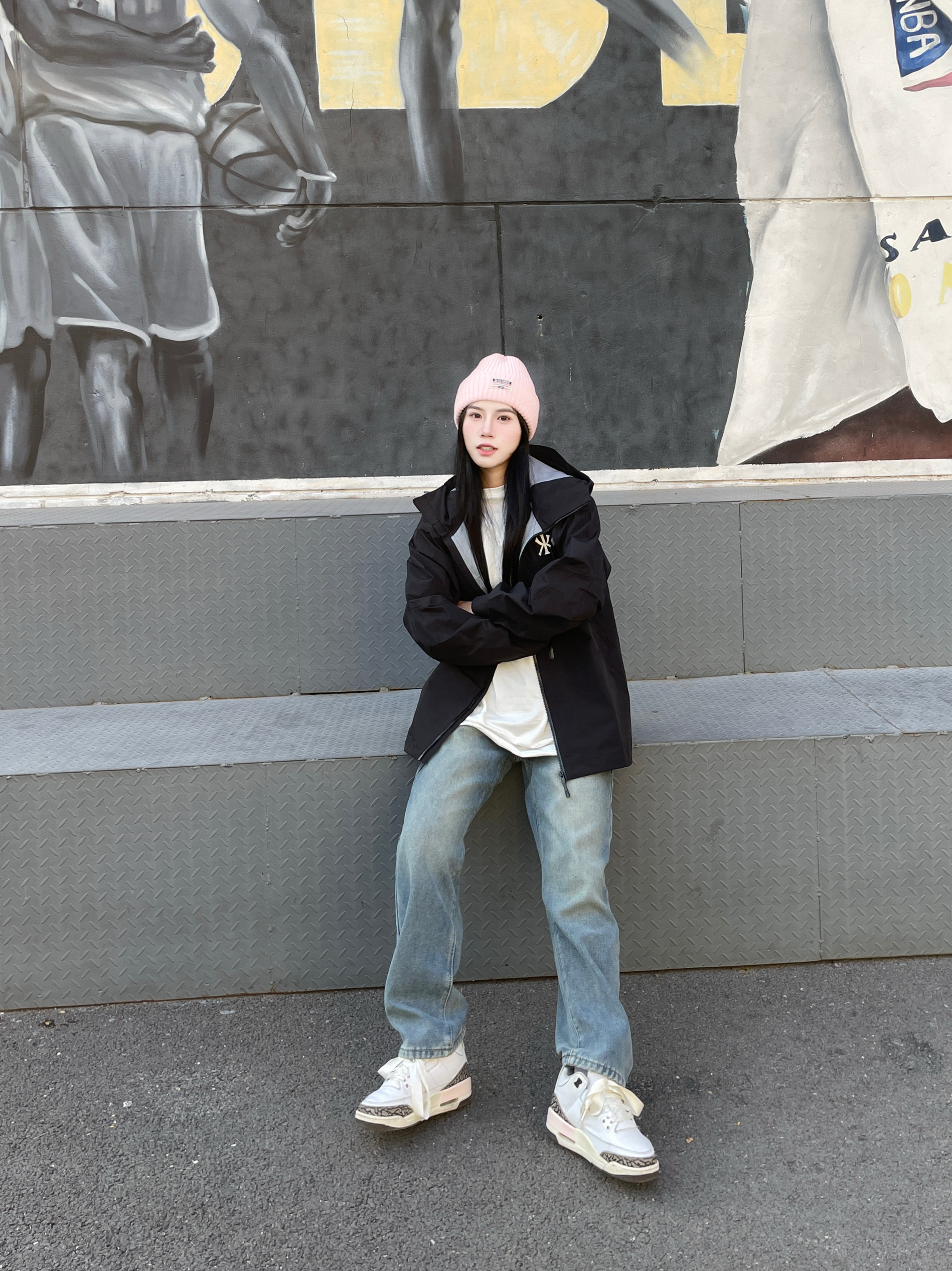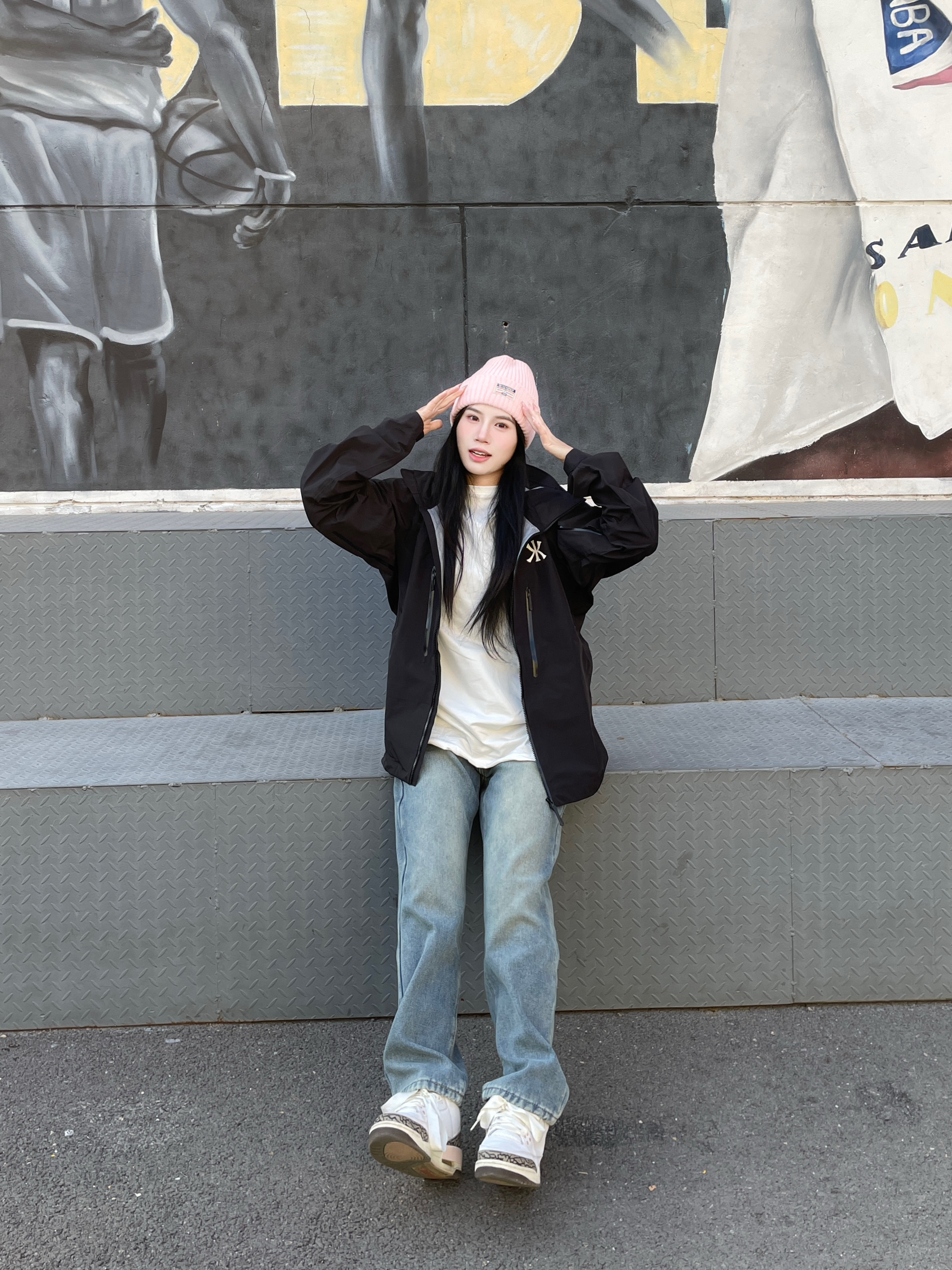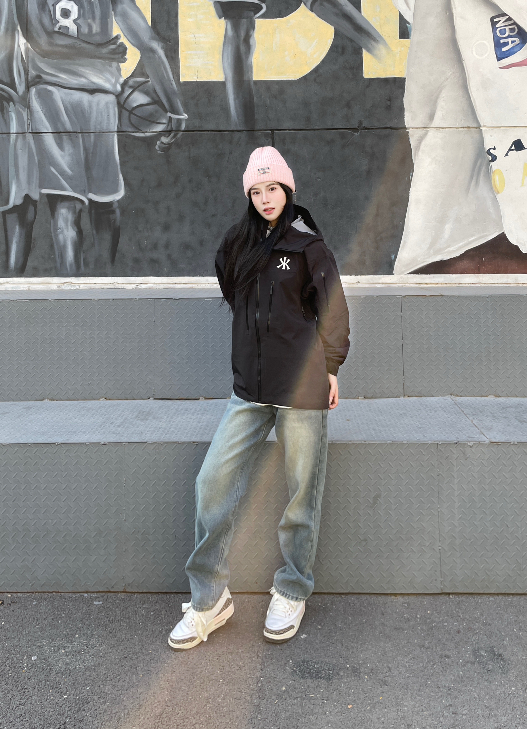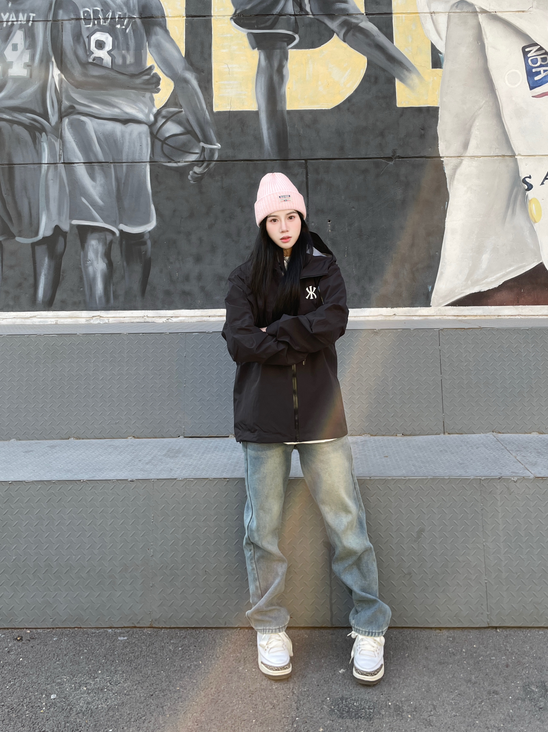 这么穿随手一拍就是大帅哥 黑色的三防外套搭配牛仔裤 这一套很有户外机能风的帅气感 多口袋的设计就很独特 Logo印花还可以反光 做的很细节 搭配一双aj 超帅气
