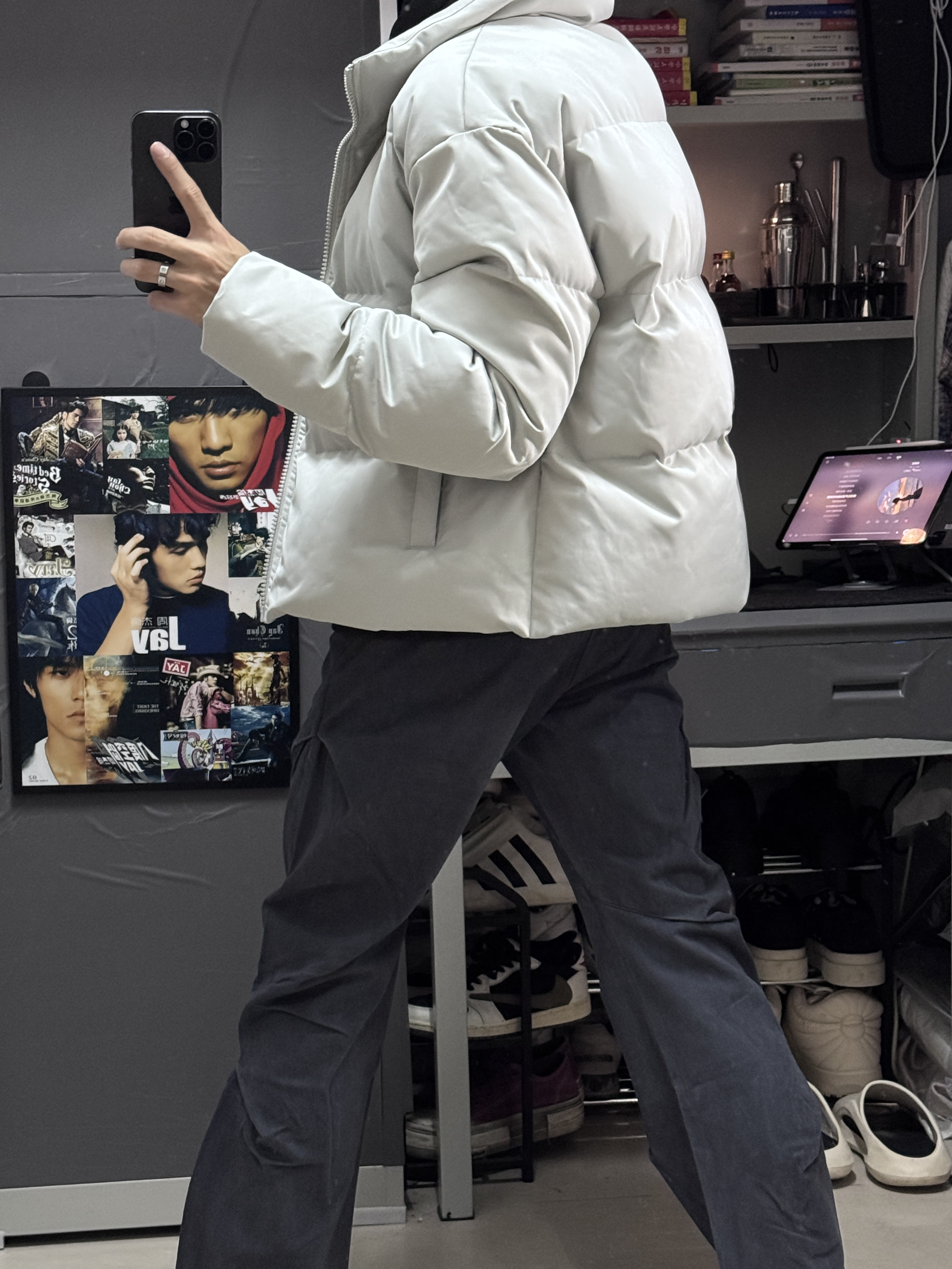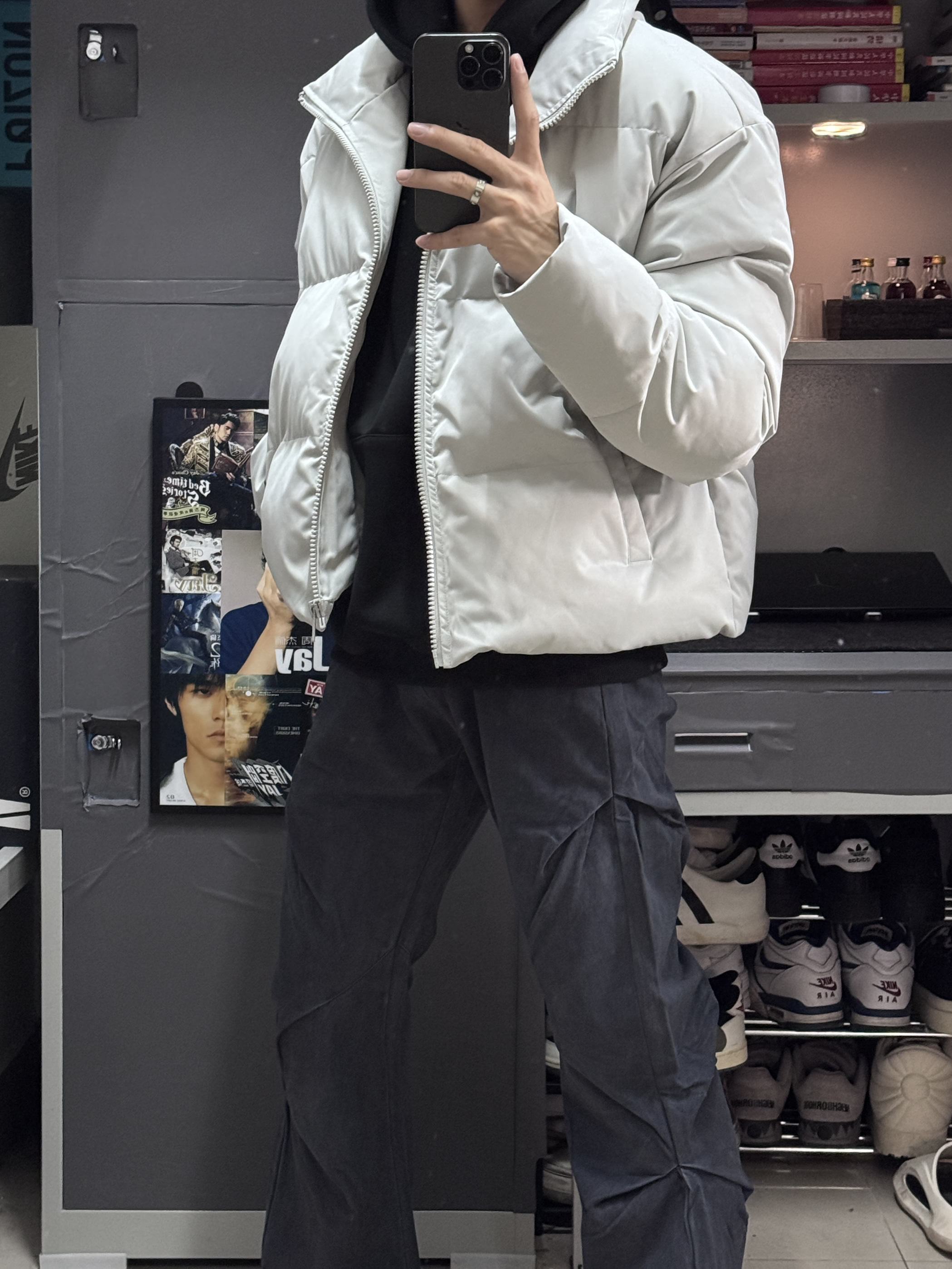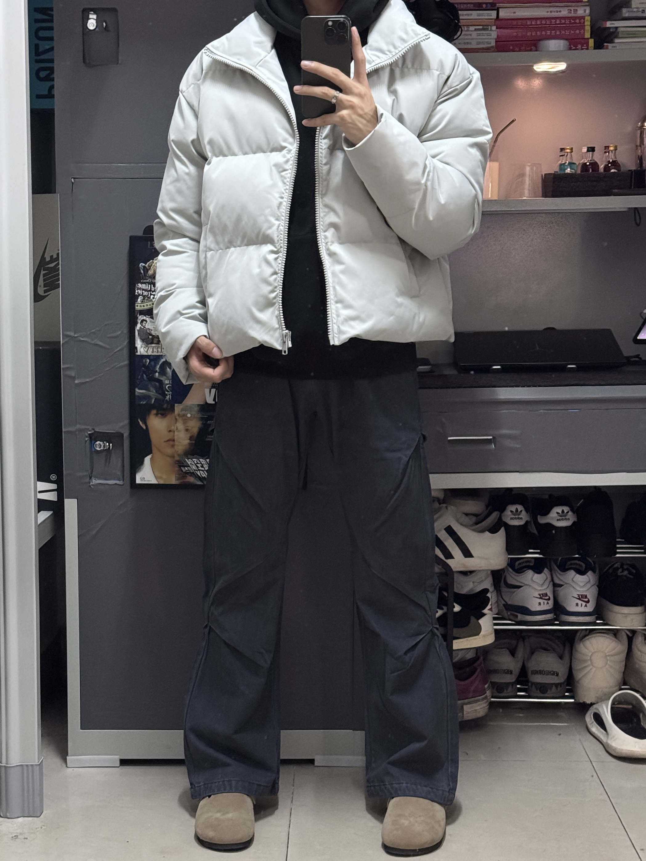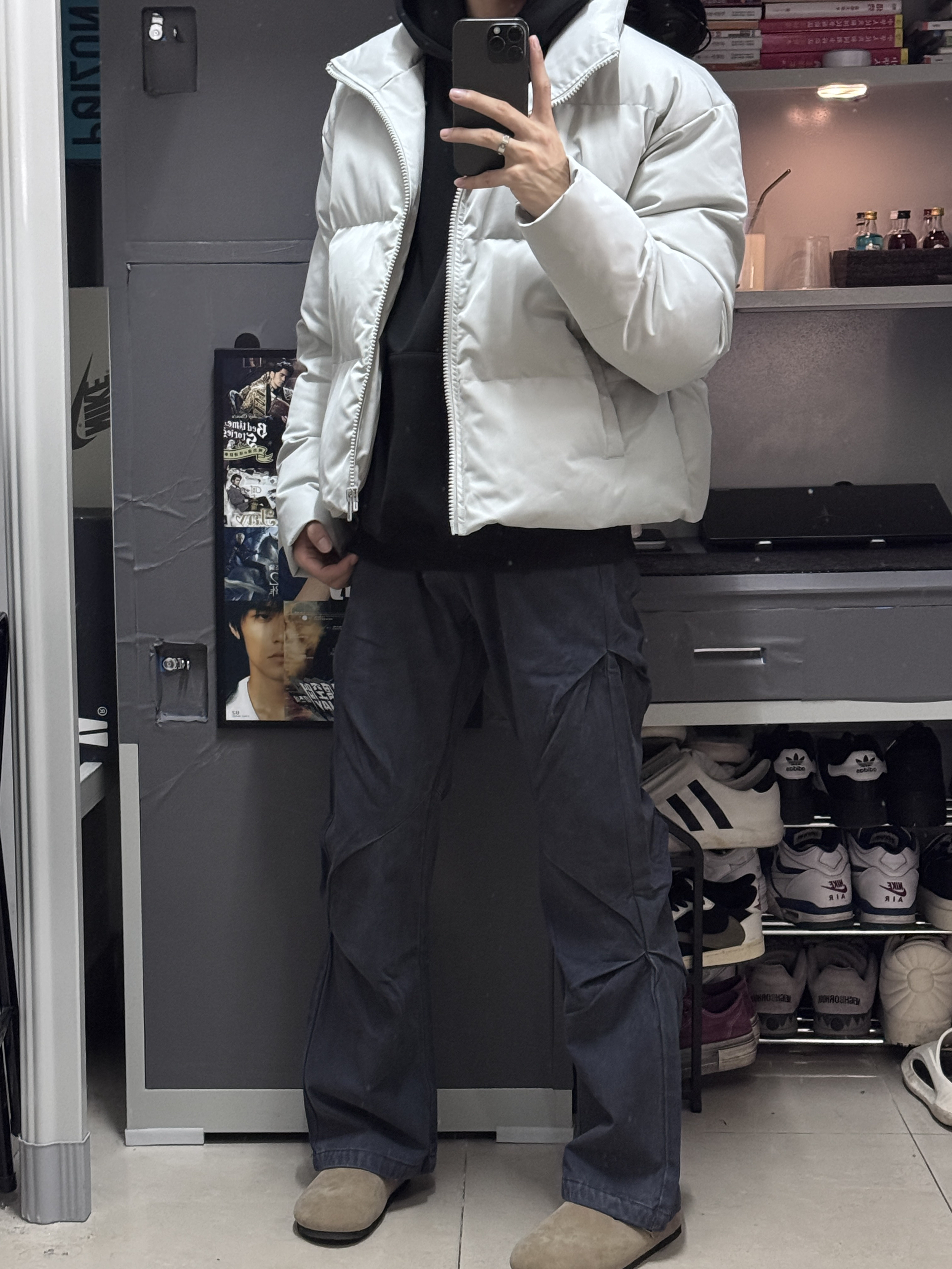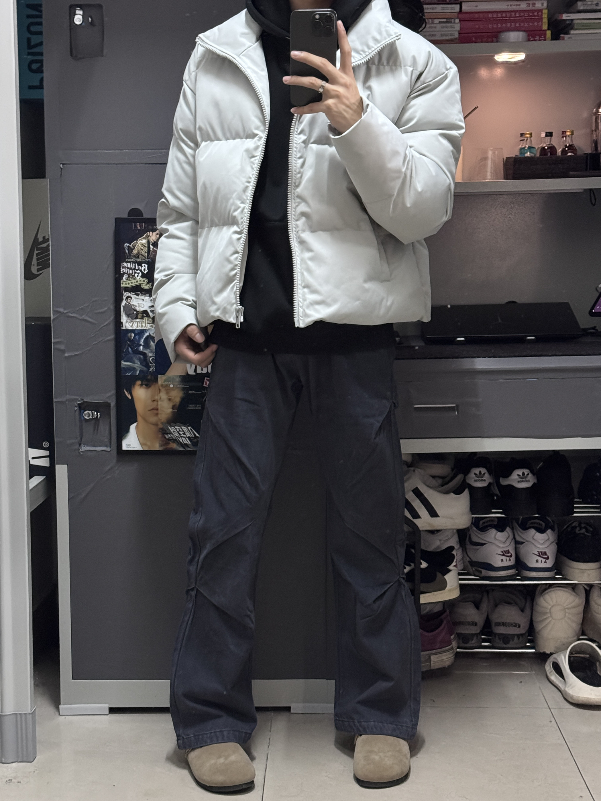 今天这一套很显高,是我喜欢的风格。 面包服棉服外套,短版纯色。(衣长62) 做旧褶皱工装裤,显高显瘦。(裤长104) 以上是今天的OOTD,希望对大家有帮助!