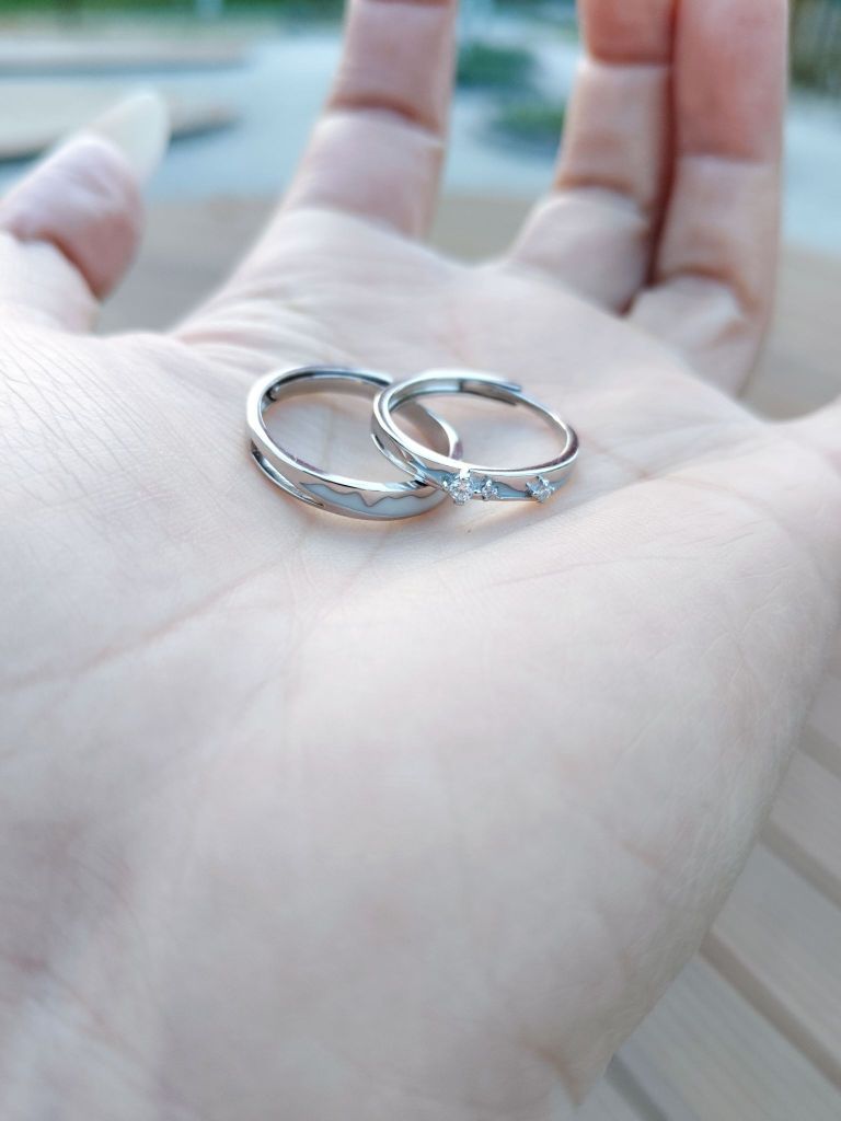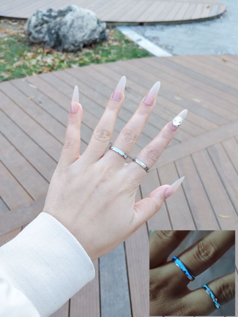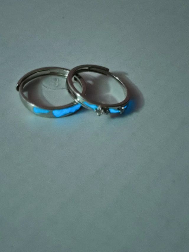 集美们,最近频繁刷到晚上发光的情侣对戒,看起来很有氛围感,想着和男朋友也戴夜光情侣戒指就选了这款,白天晚上的氛围感都给了,白天自然光线下中间的钻bulingbuling✨✨的闪,晚上发夜光真的情绪拉🈵。 男朋友也很喜欢,晚上戴着很有氛围感,关键是很有质感,不掉钻,也不变色,戴了好几周佩戴起来很舒服,现在完全舍不得摘啦