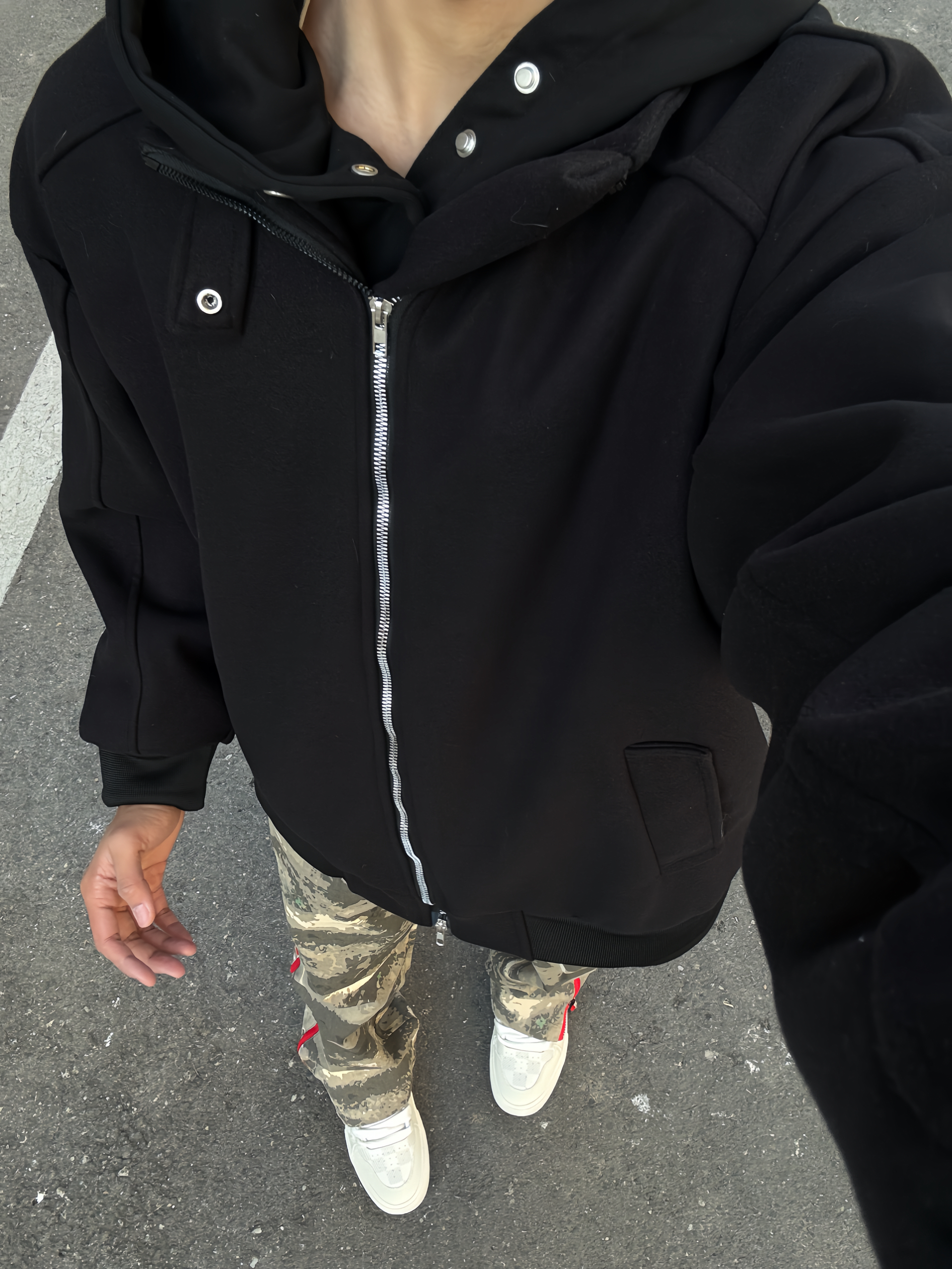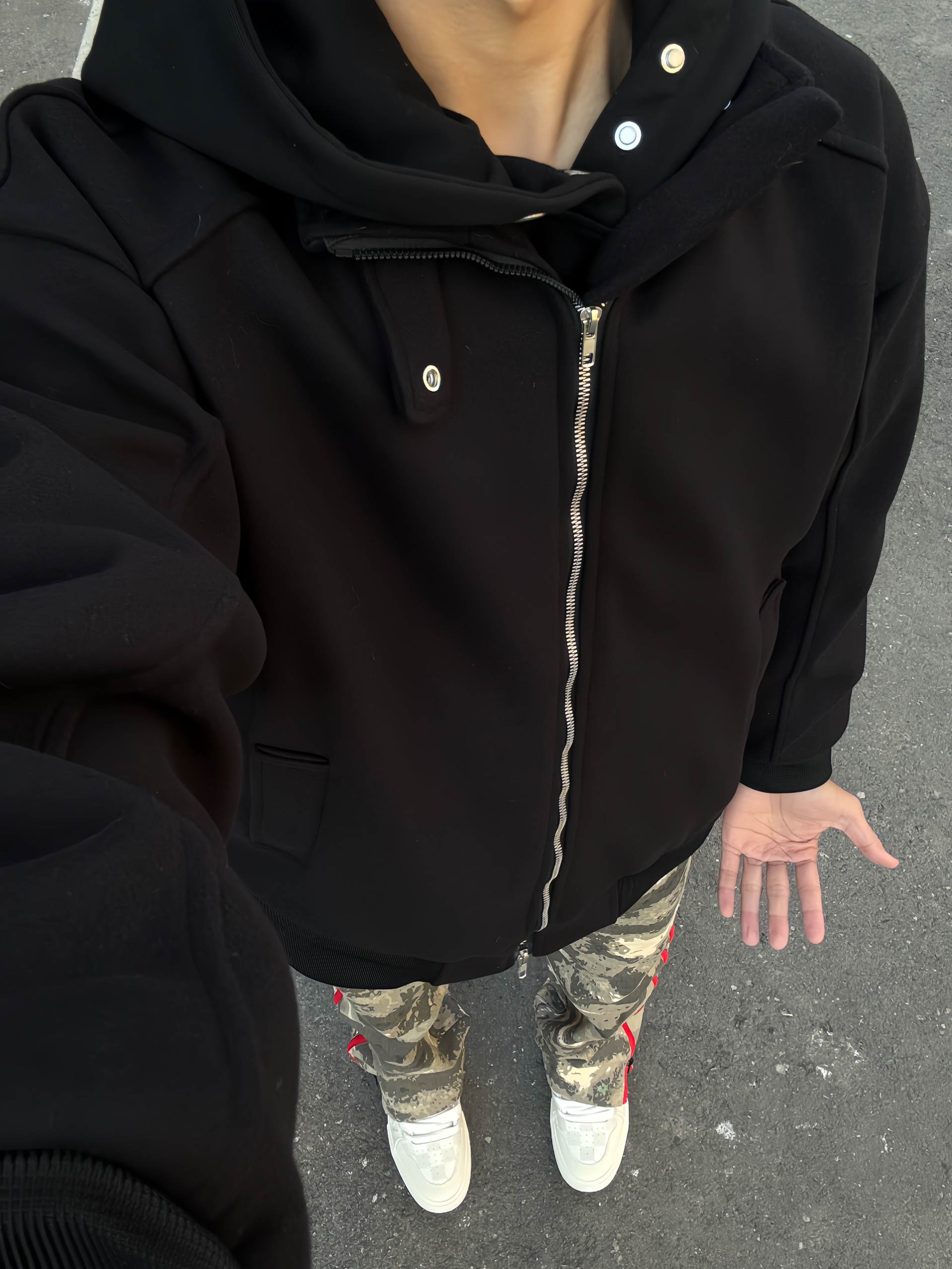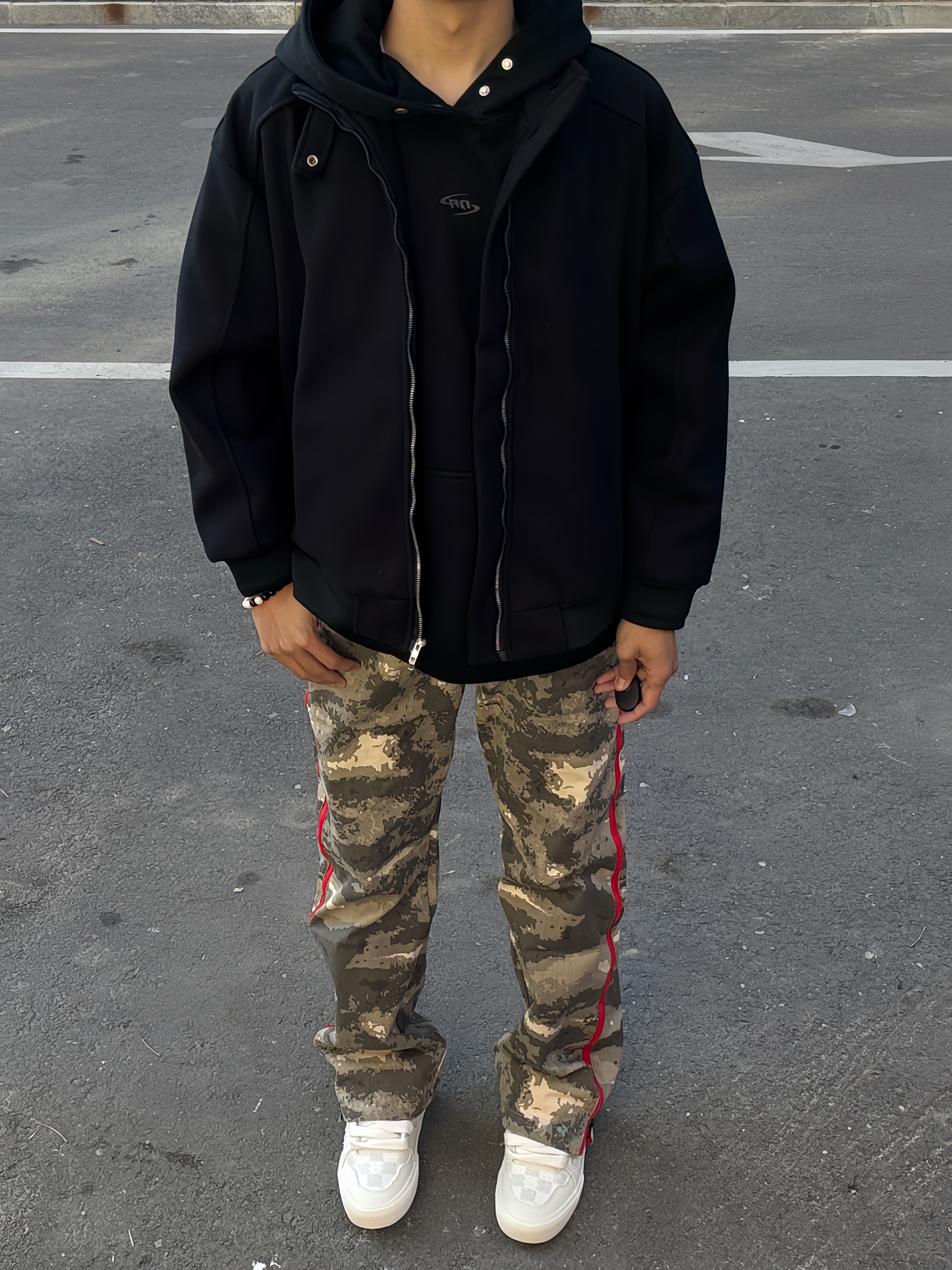 180 130 | OOTD穿搭分享哈喽 这里是发型~ 👔|巨帅的飞行员拉链夹克呀,铆钉翻领设计好适合叠穿,我好喜欢这类的衣服,搭配起来真的好看~ 👖|谁能拒绝迷彩裤! 👟|MINISO百搭面包鞋,很舒服的上脚感,里面的面料也是软软的,米白色也很百搭呀~