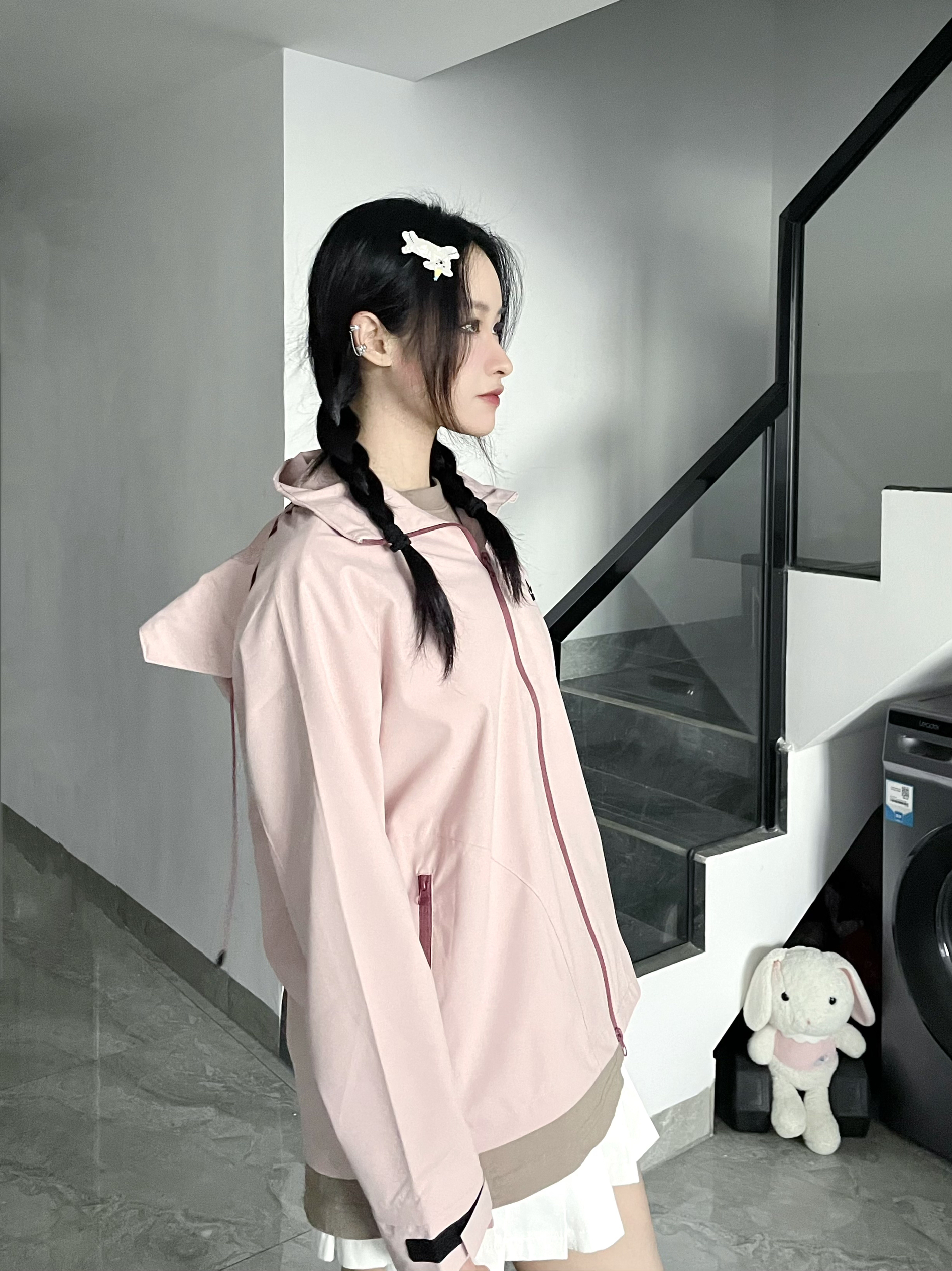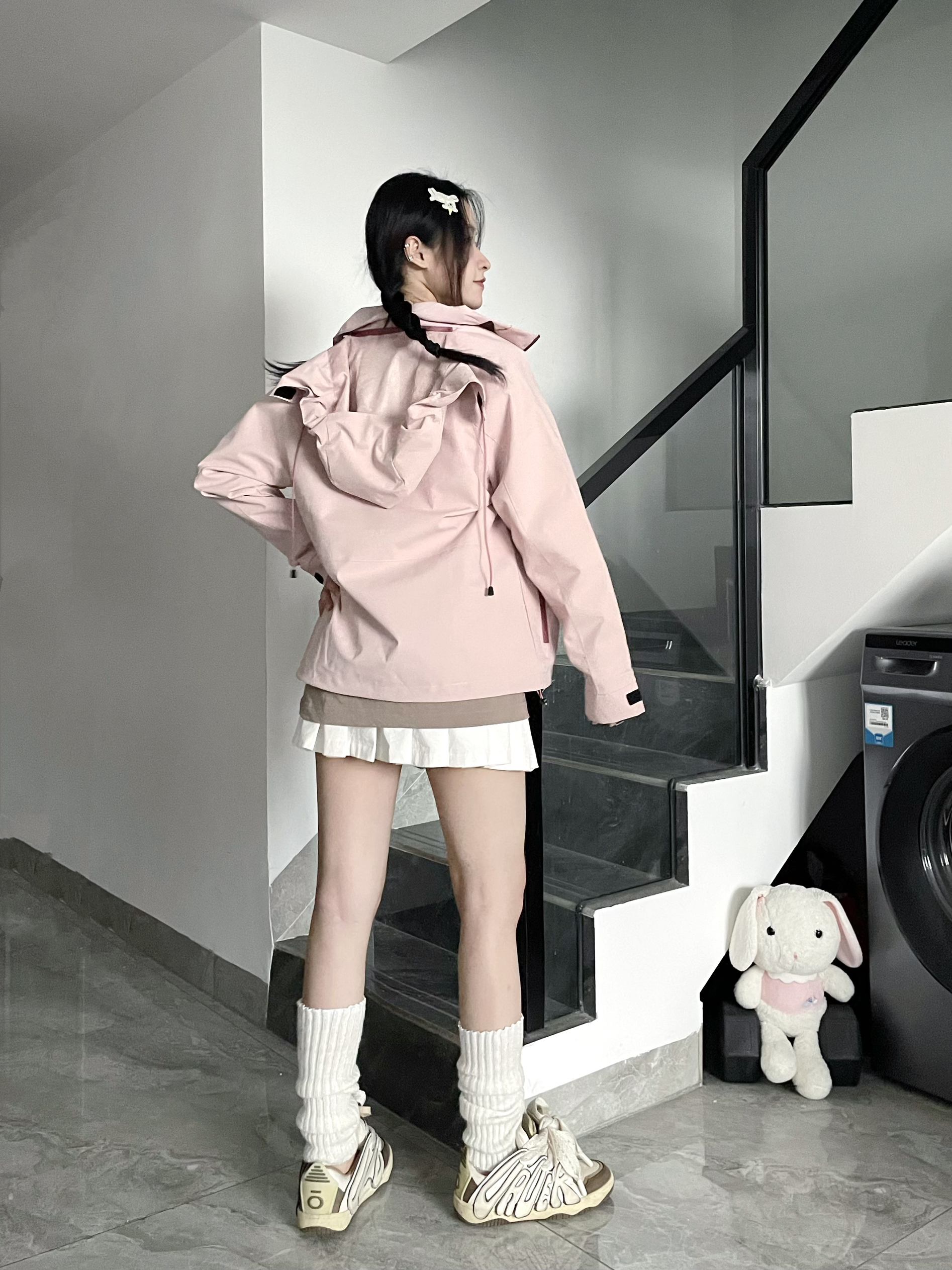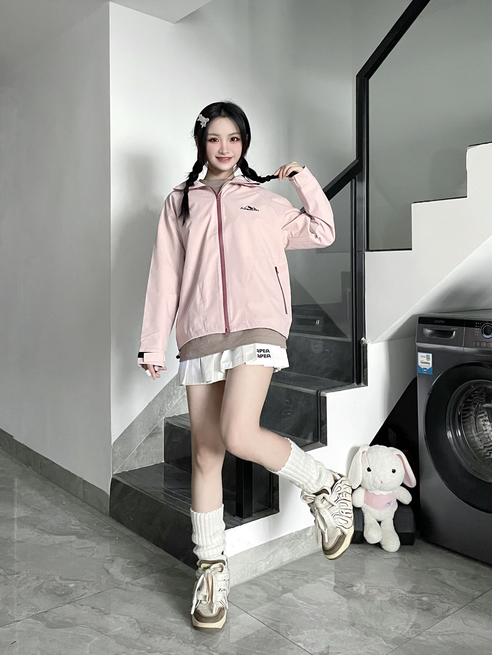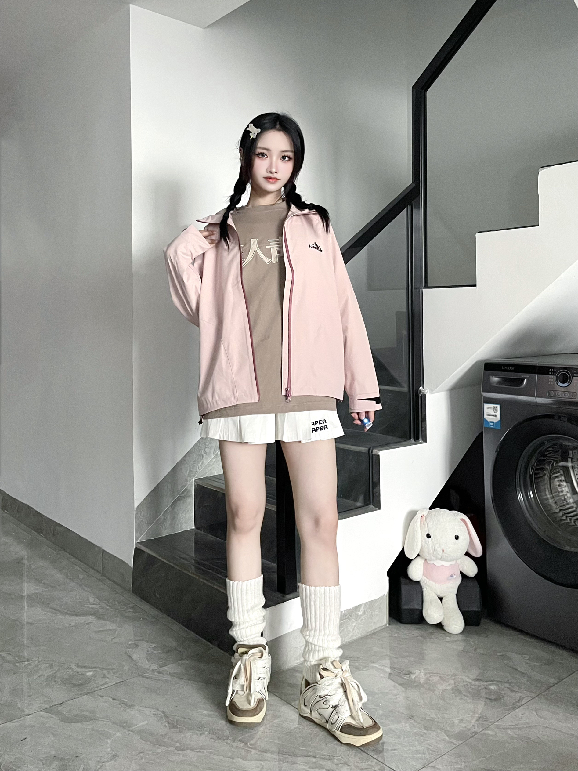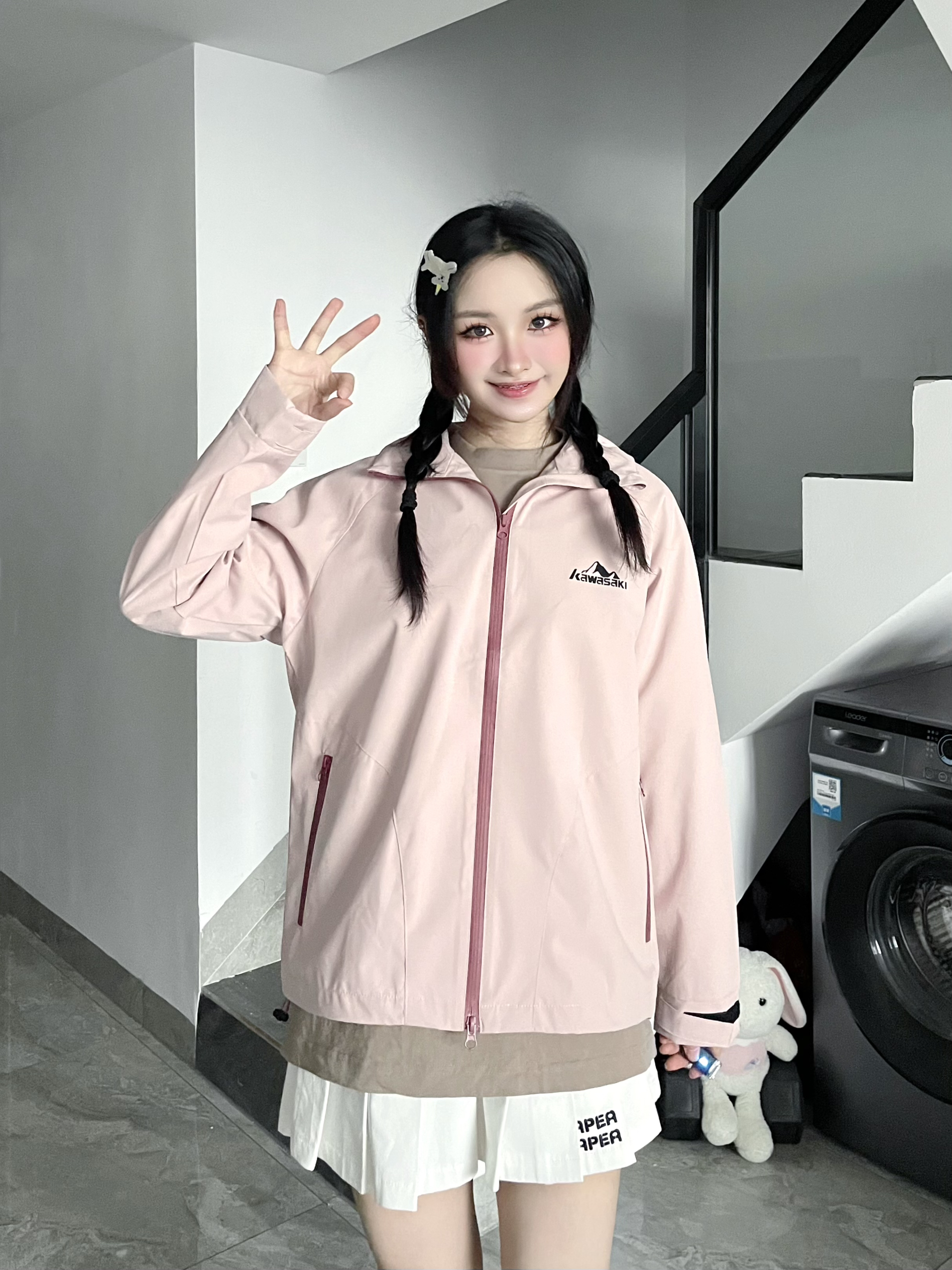 穿惯了黑白灰👀 偶尔穿点粉粉嫩嫩滴 淡淡的橡皮粉色甜美天菜呀 这件 Kawasaki川崎 冲锋衣 日常穿搭配小短裙没想到还挺甜! 轻防水面料可以扛住毛毛雨哦🌧️ 整体上身微宽松效果很轻便~ 叠穿件卡其色内搭➕小裙子 很有运动氧气感哦