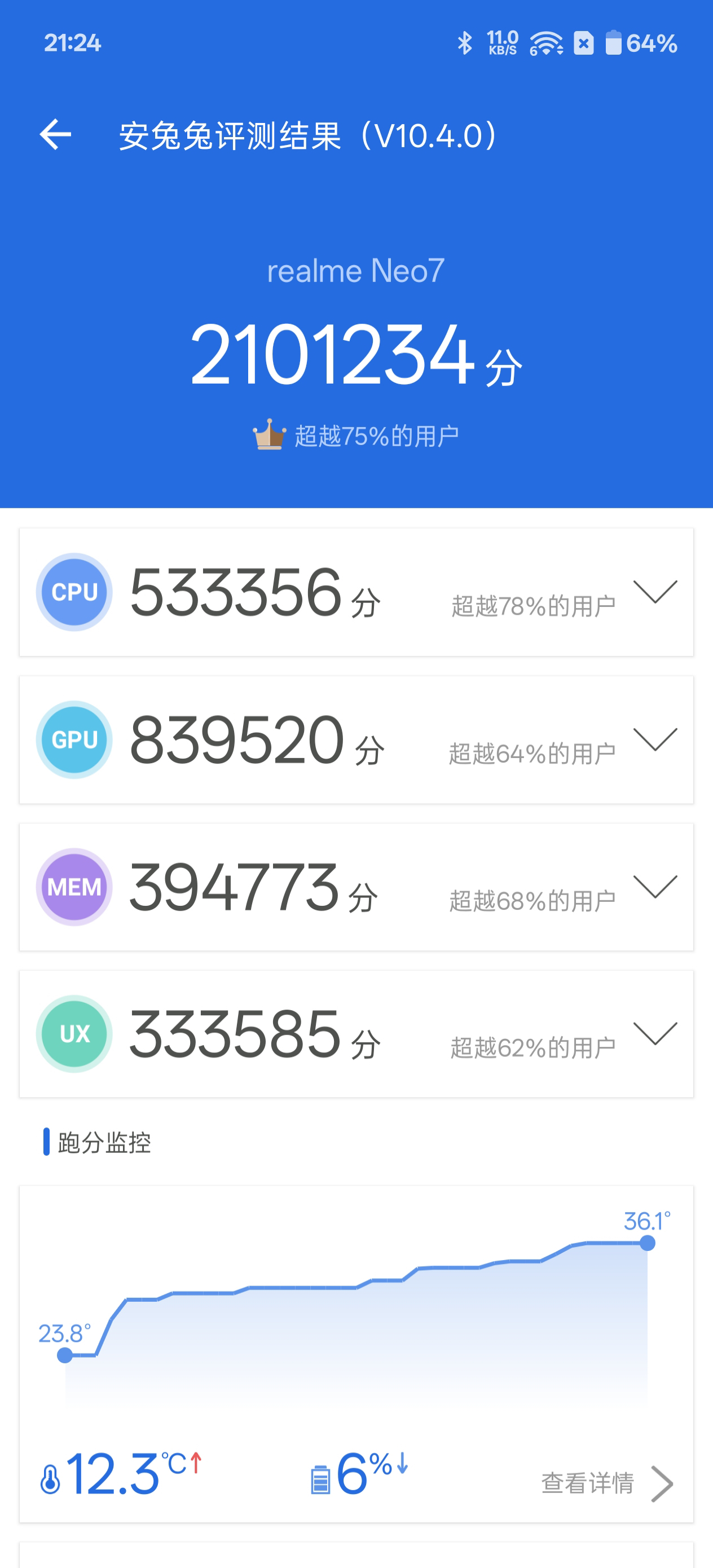 知道今年的中高端机型会把大电池卷起来,但是没想到真我Neo7能在这个节骨眼把电池🔋做到7000mAh,厚度却依旧维持在8.5mm,而且1,800次循环后也能保证电池健康度大于80%,还给五年的电池保,配合80W的闪充,补能迅速、电池持久,双向增益。 芯片用了天玑9300+平台,我用娱乐兔兔跑分轻松210万分以上,玩游戏的时候配合行业最大7,700mm²单体VC散热,性能释放更稳定,且具备芯片级的...