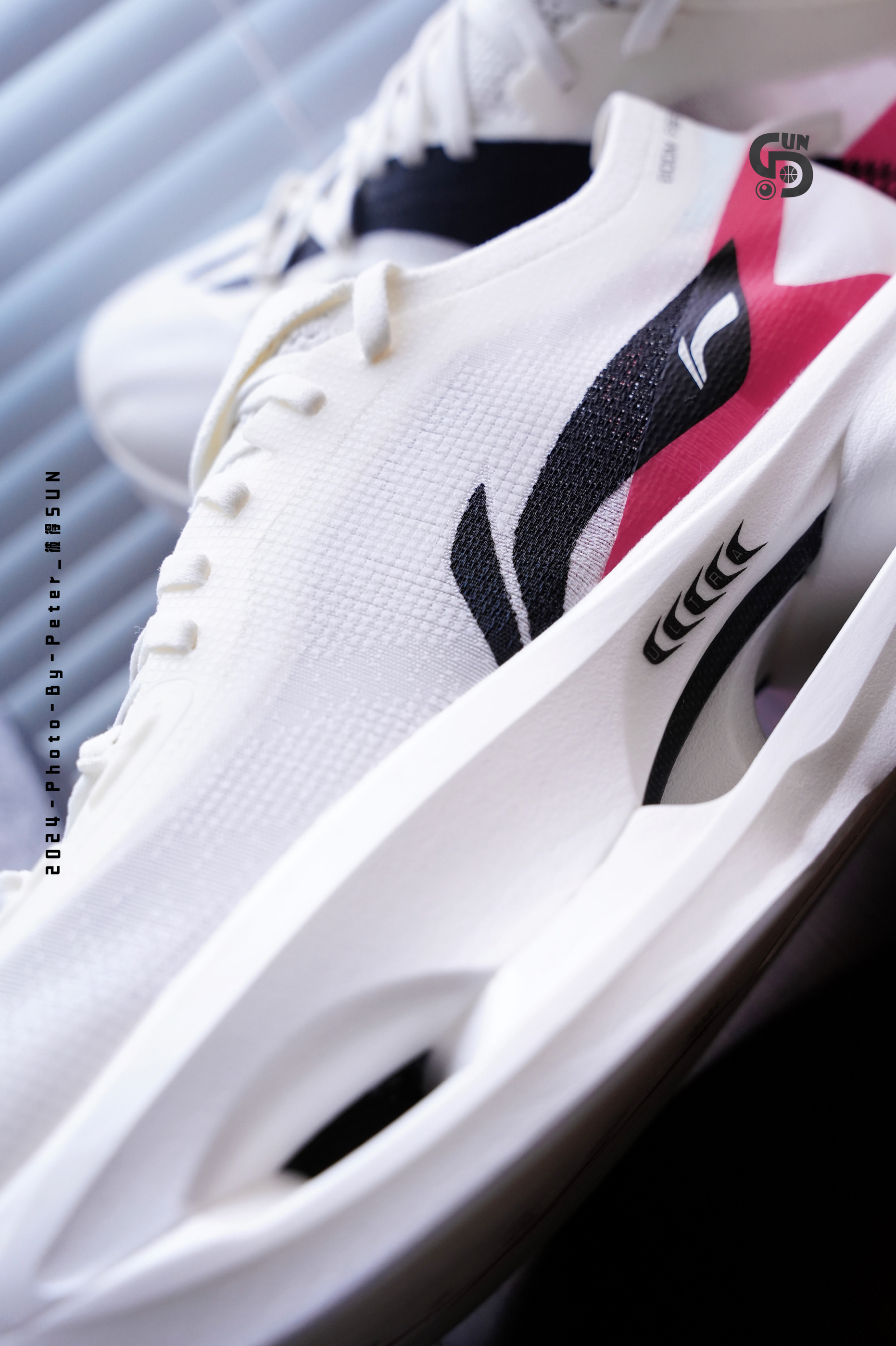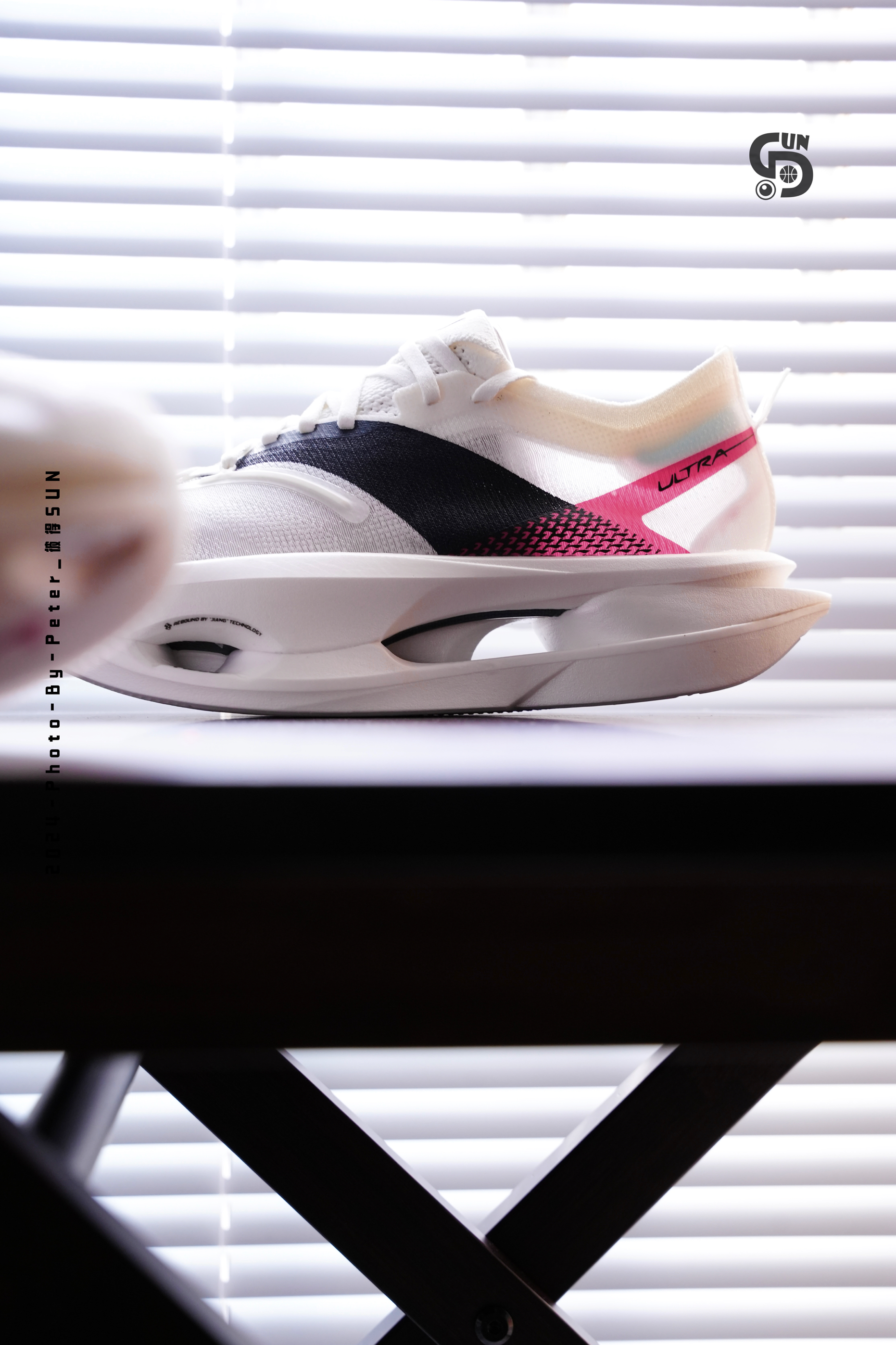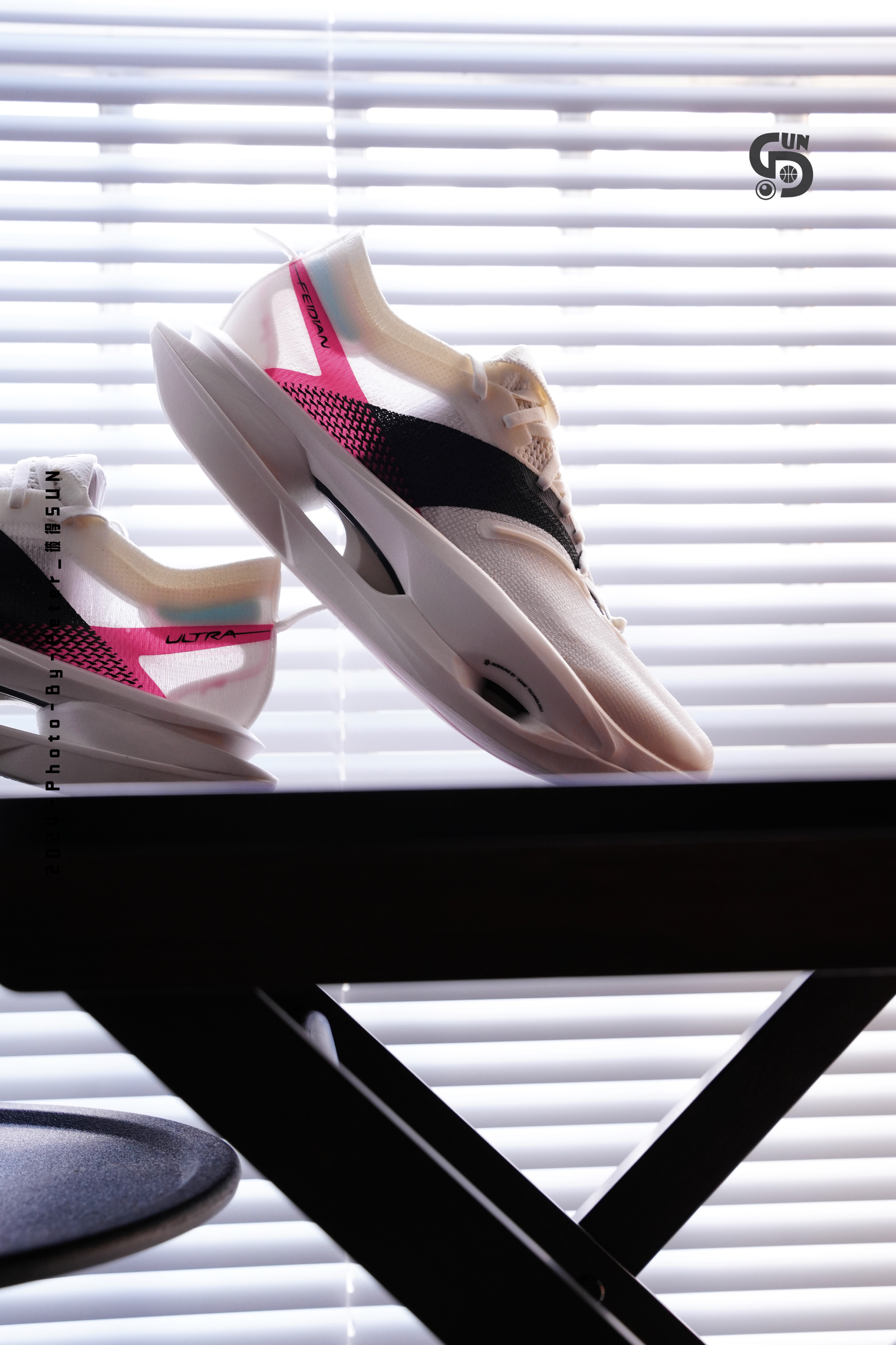第一次见到飞电5Ultra是在上海超䨻的快闪活动 这个因为设计理念太先进 而被称为<违规鞋>的跑鞋可能也可算作禁穿了 性能配置确实有点高 T1000超大碳板加上超䨻科技 还有中底看似复杂的穿插镂空设计 鞋子非常轻 透过光线其实就能看出来