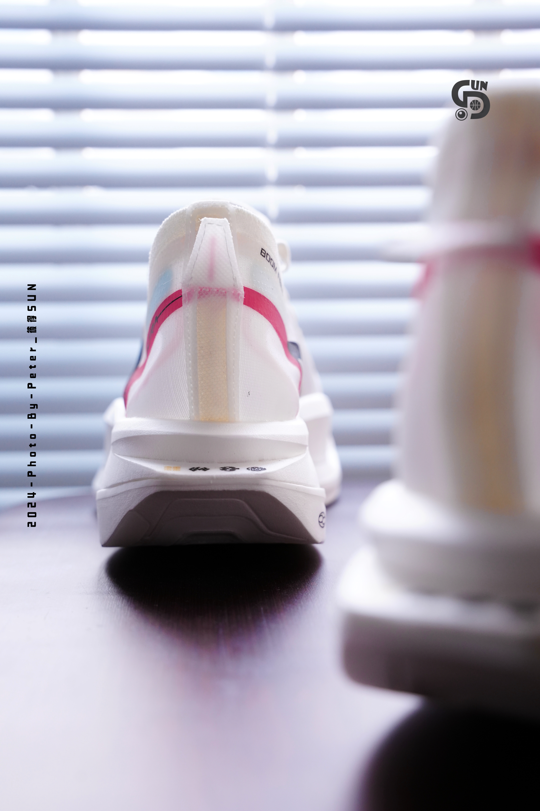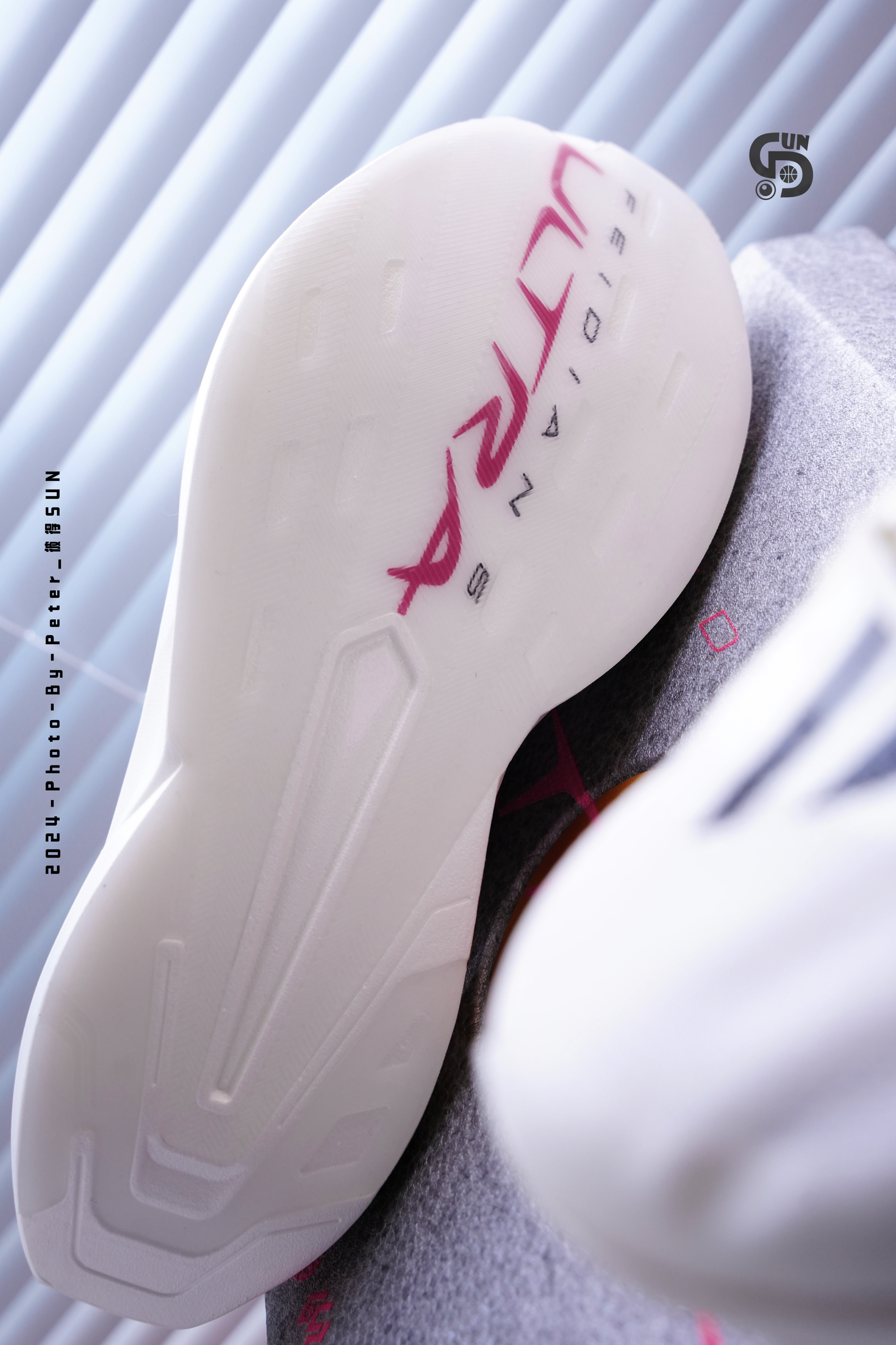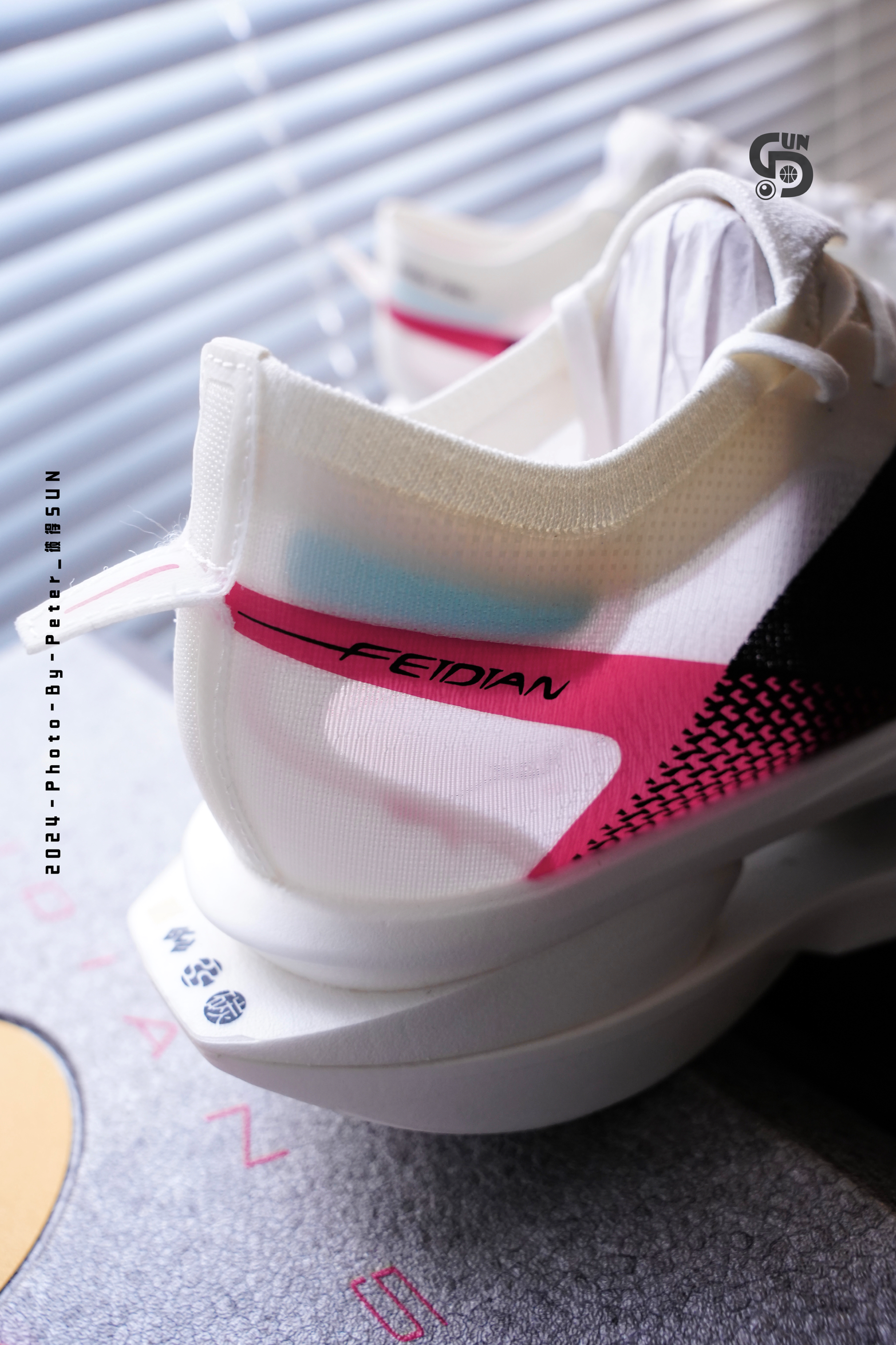第一次见到飞电5Ultra是在上海超䨻的快闪活动 这个因为设计理念太先进 而被称为<违规鞋>的跑鞋可能也可算作禁穿了 性能配置确实有点高 T1000超大碳板加上超䨻科技 还有中底看似复杂的穿插镂空设计 鞋子非常轻 透过光线其实就能看出来