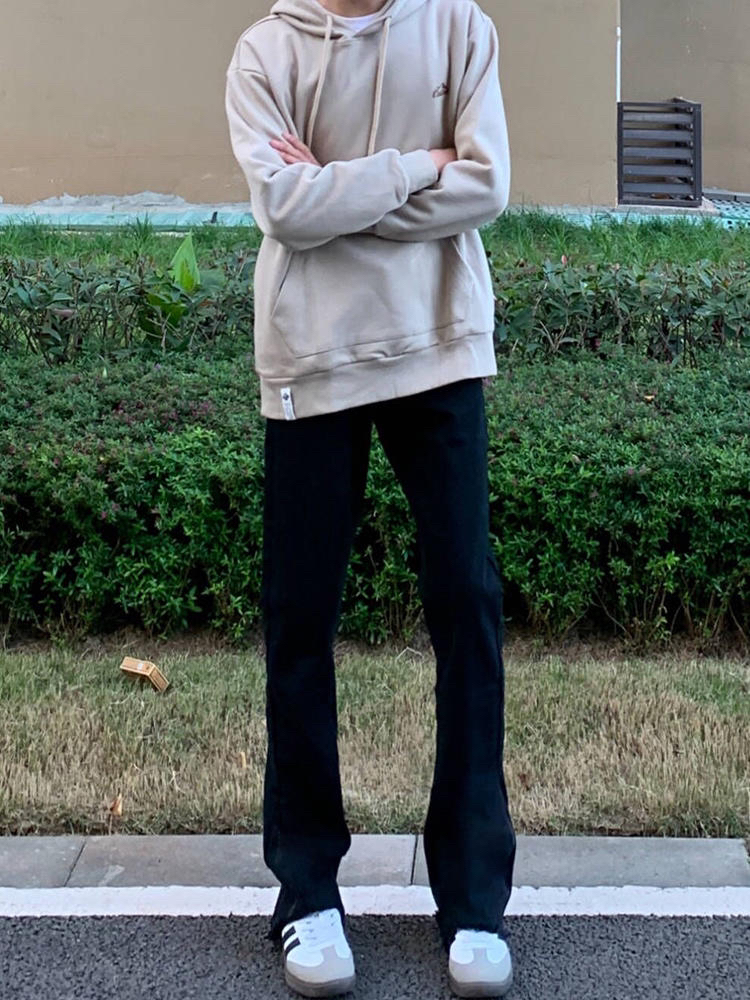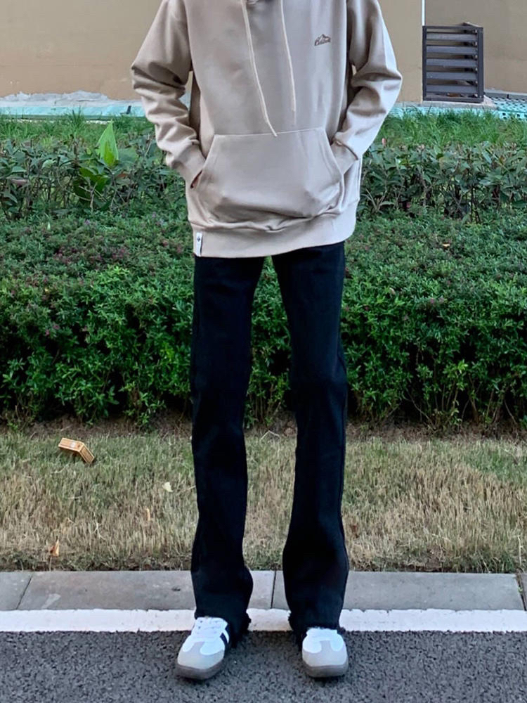 好显瘦的一条黑色直筒牛仔裤啊!直筒微喇版型,显高显瘦显腿长~裤脚毛边设计,敲好看~面料有弹力,穿着很舒服,男女同款~简直太好穿啦啦!