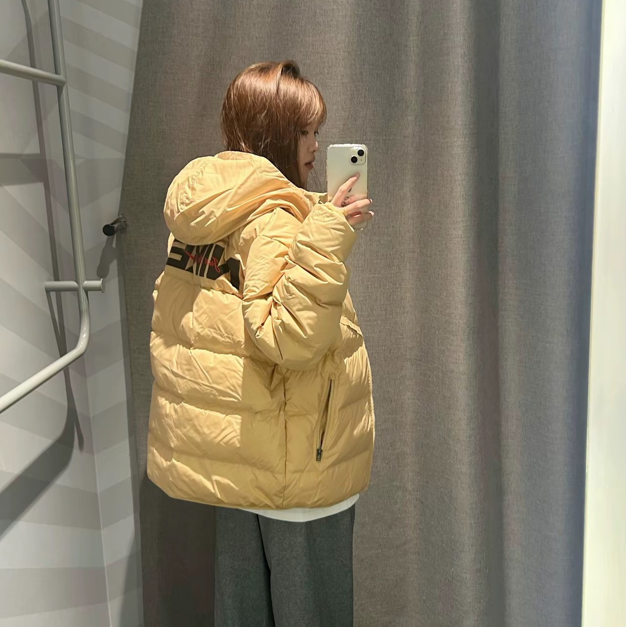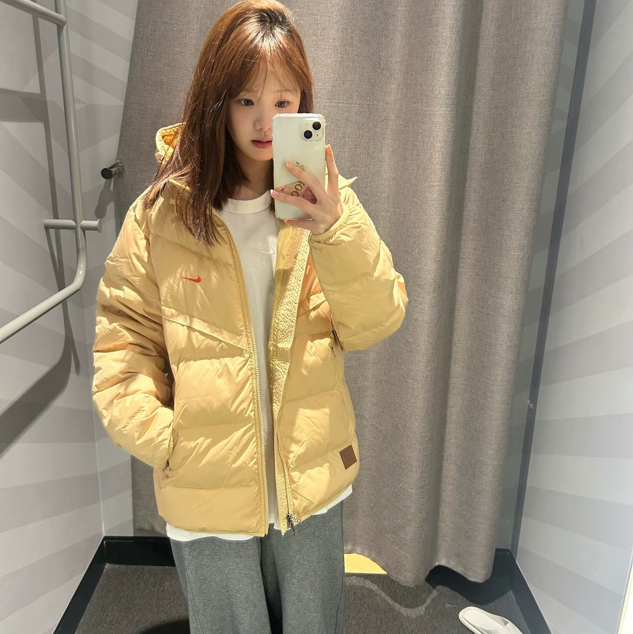 冬天羽绒服穿搭作业图,真的很简单,上衣耐克羽绒服,淡黄色的配色也是复古气息满满,鸭绒充绒量也是85%,保暖性能也是不错,同时加了拒水功能,应对对个天气,内衬浅色打底,裤子同时也搭配浅色,配上面板鞋,冬天的氛围感也是满满了! 图片来源于@小八今天吃饱了吗