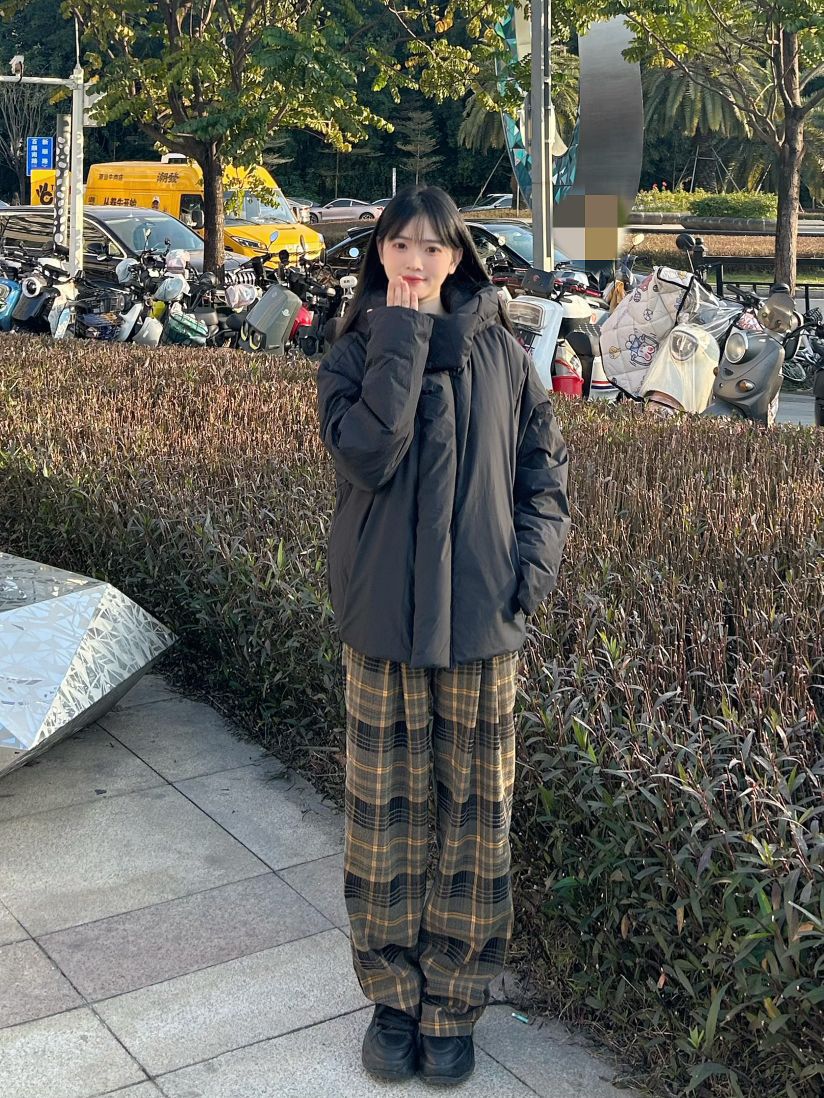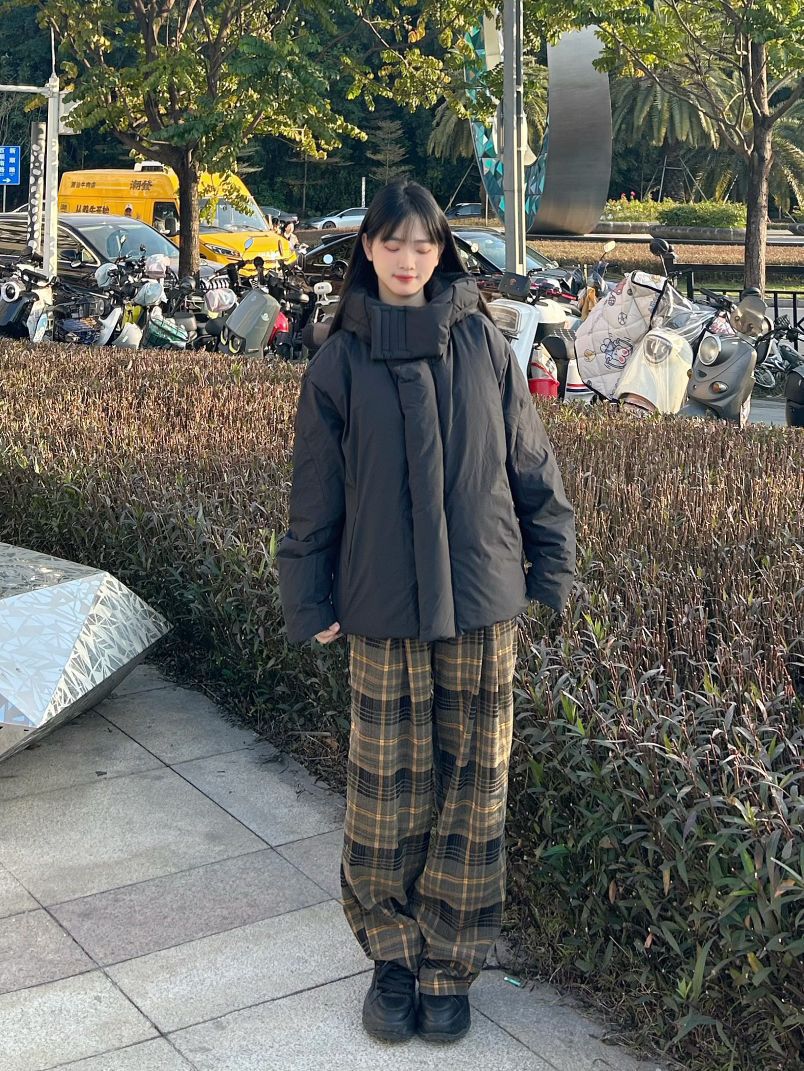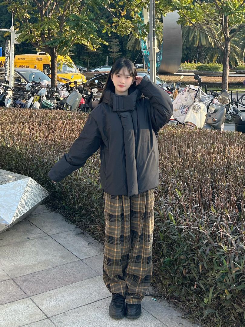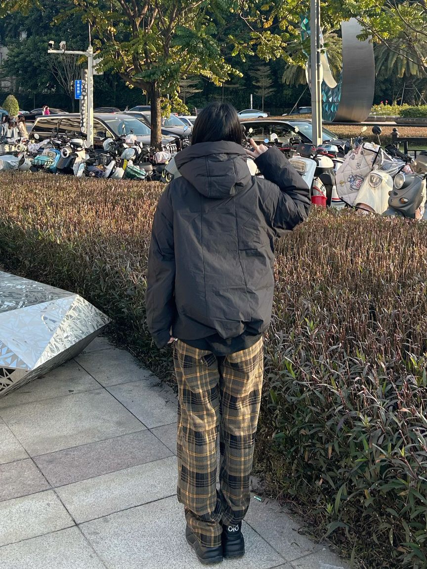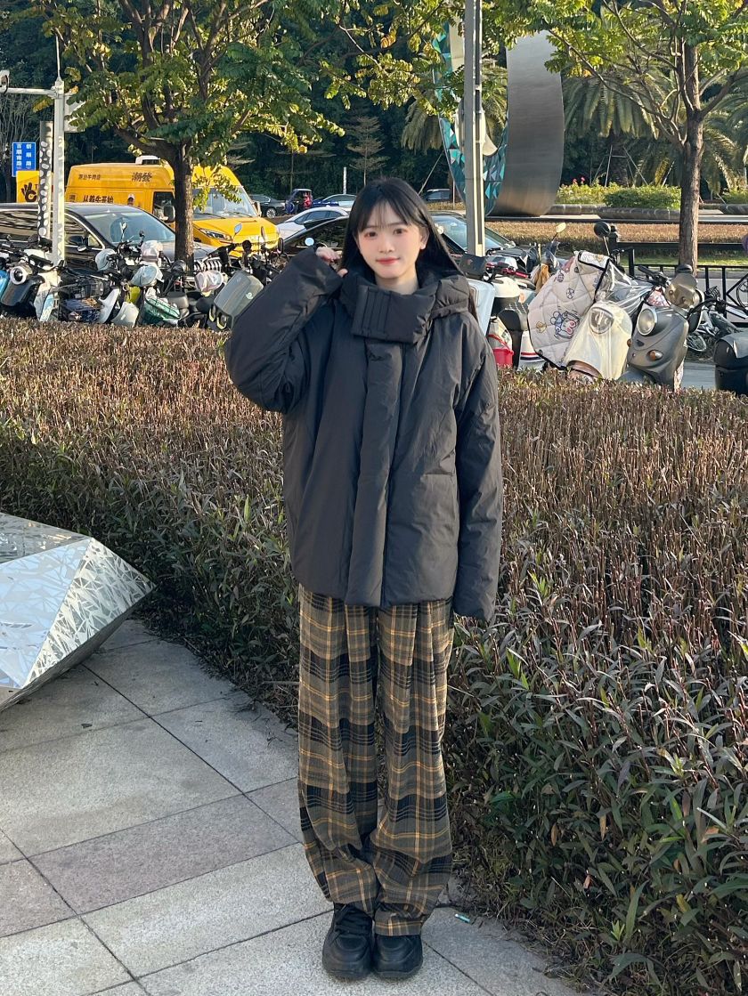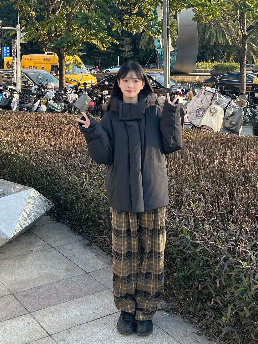 哈喽,家人们,今天的穿搭分享来啦,是一套冬日早八羽绒服穿搭分享~ 纯黑色鸭绒连帽羽绒服+棕绿色格子阔腿裤+黑色高帮百搭板鞋 一整套冬日早八羽绒服穿搭get~ 尺码参考: 身高、体重:160、95 衣服:m裤子:s鞋子:36
