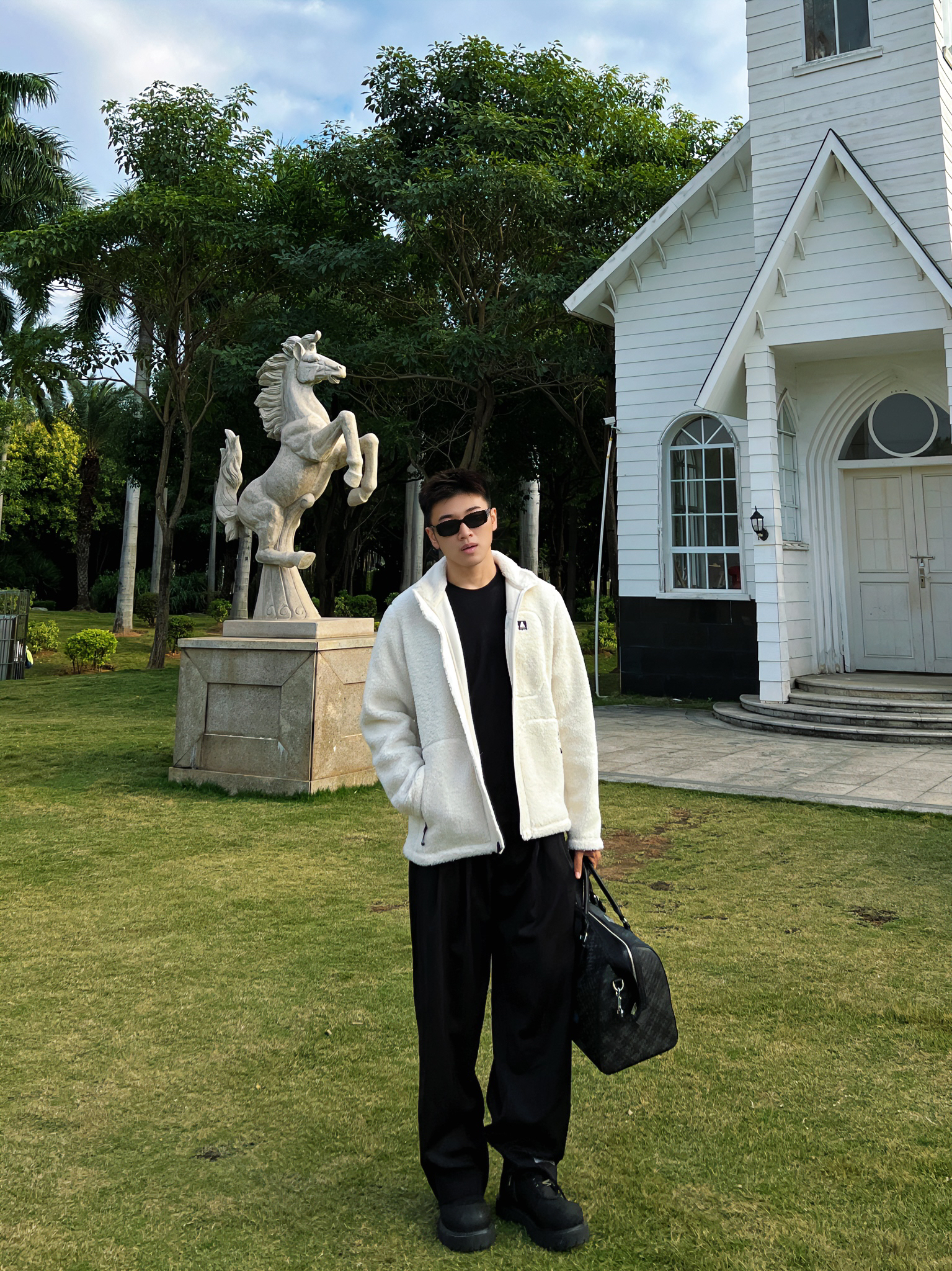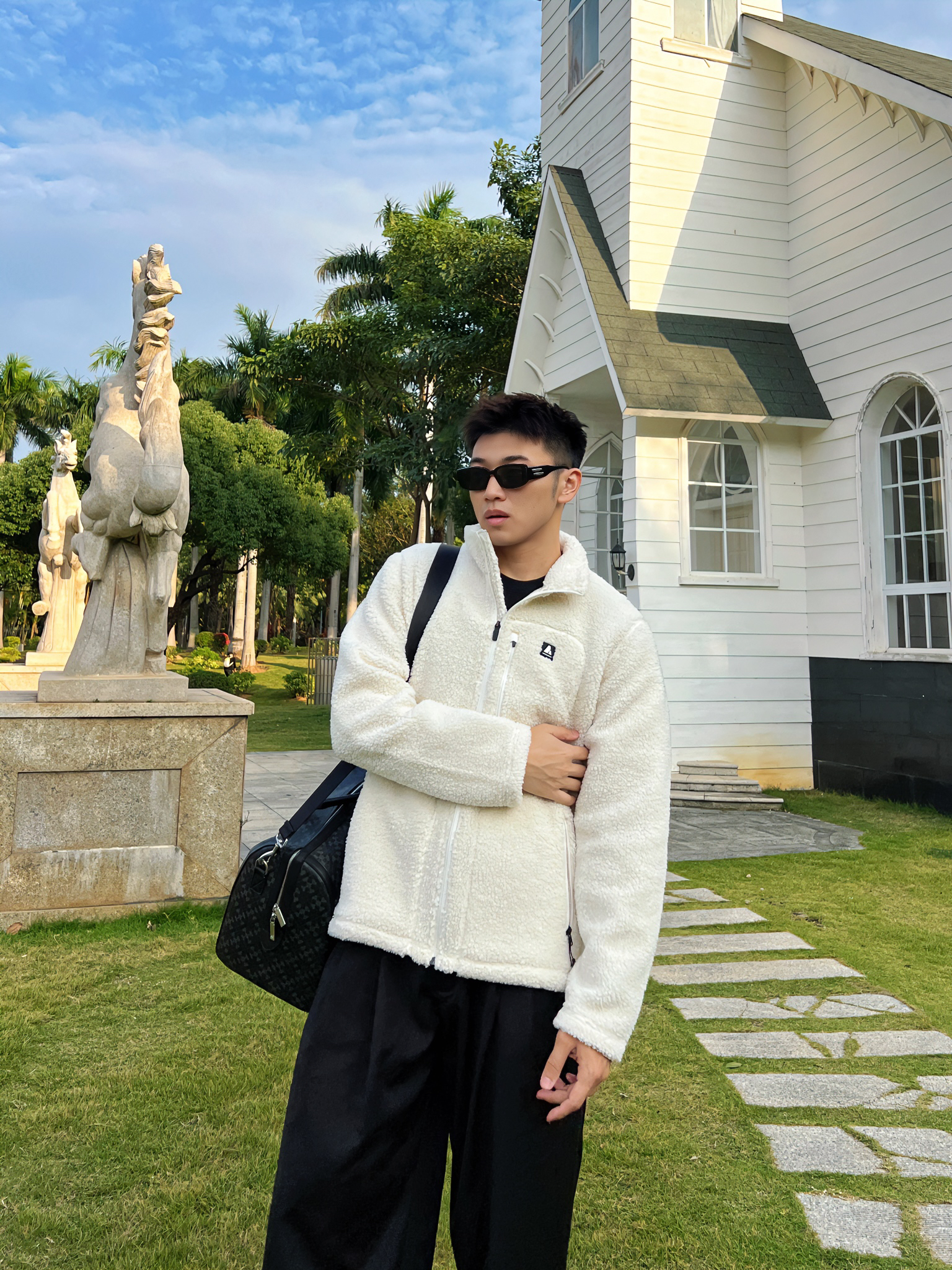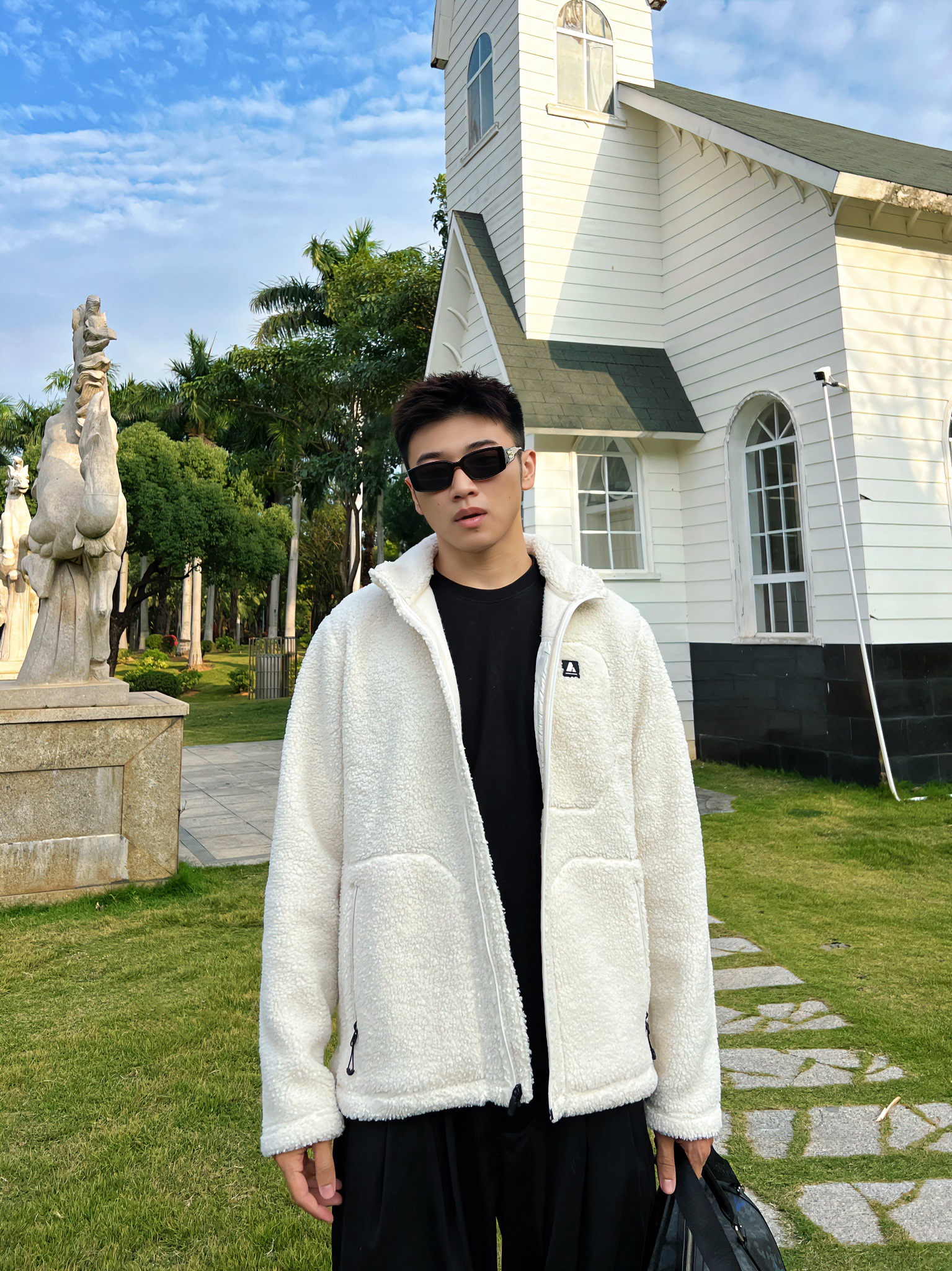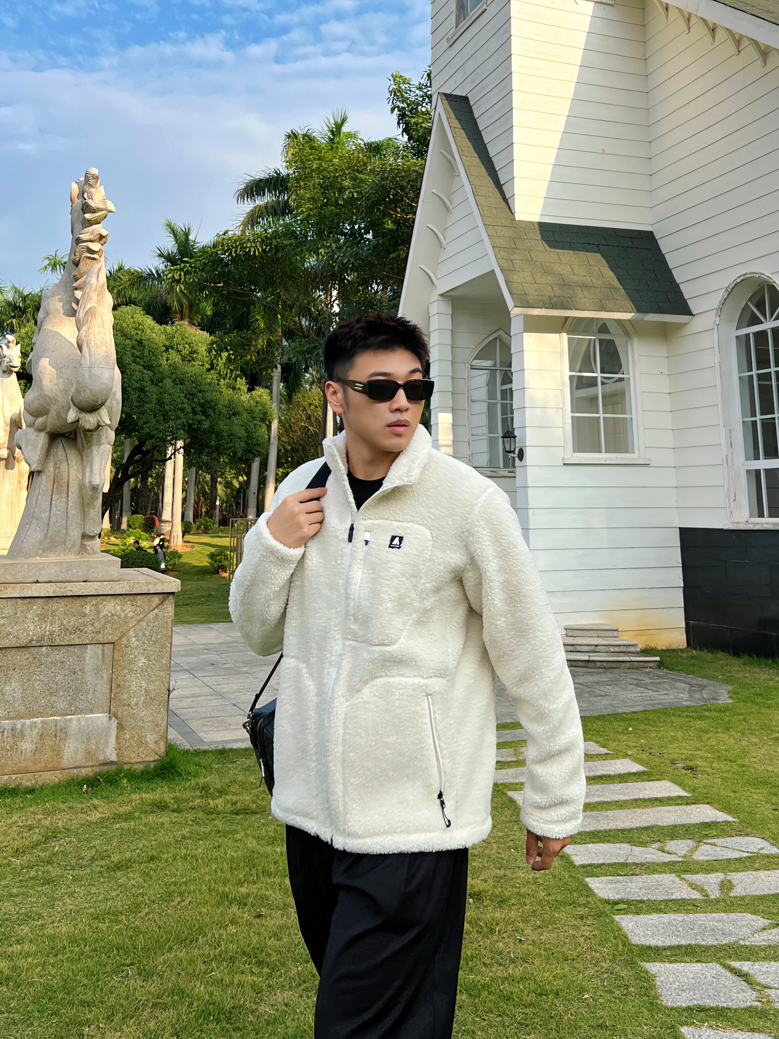 哈咯大家 这里是章鱼哥 今天章鱼给大家分享一套 冬日夹克衫穿搭 来看看我的搭配吧 上身一件白色抓绒工装夹克 简约的款式搭配ykk拉链的细节 羊羔绒做外穿内搭都合适 搭配一身西裤马丁靴 最后再搭配一个星球包