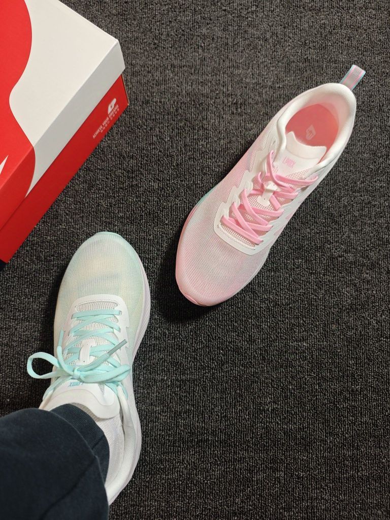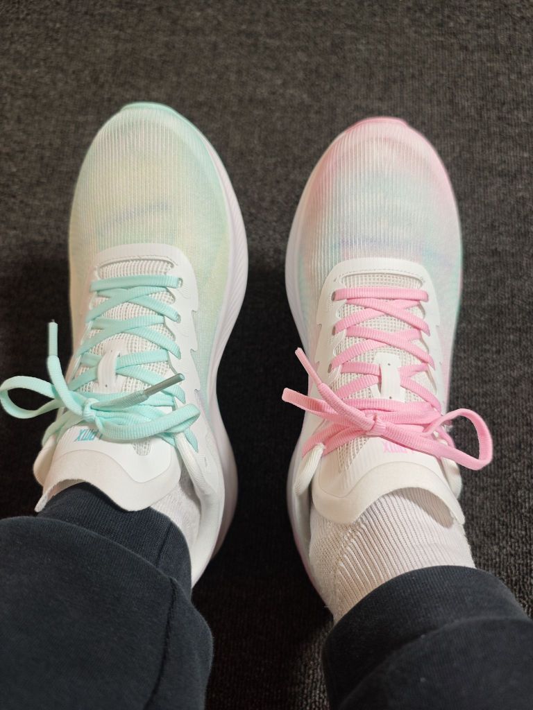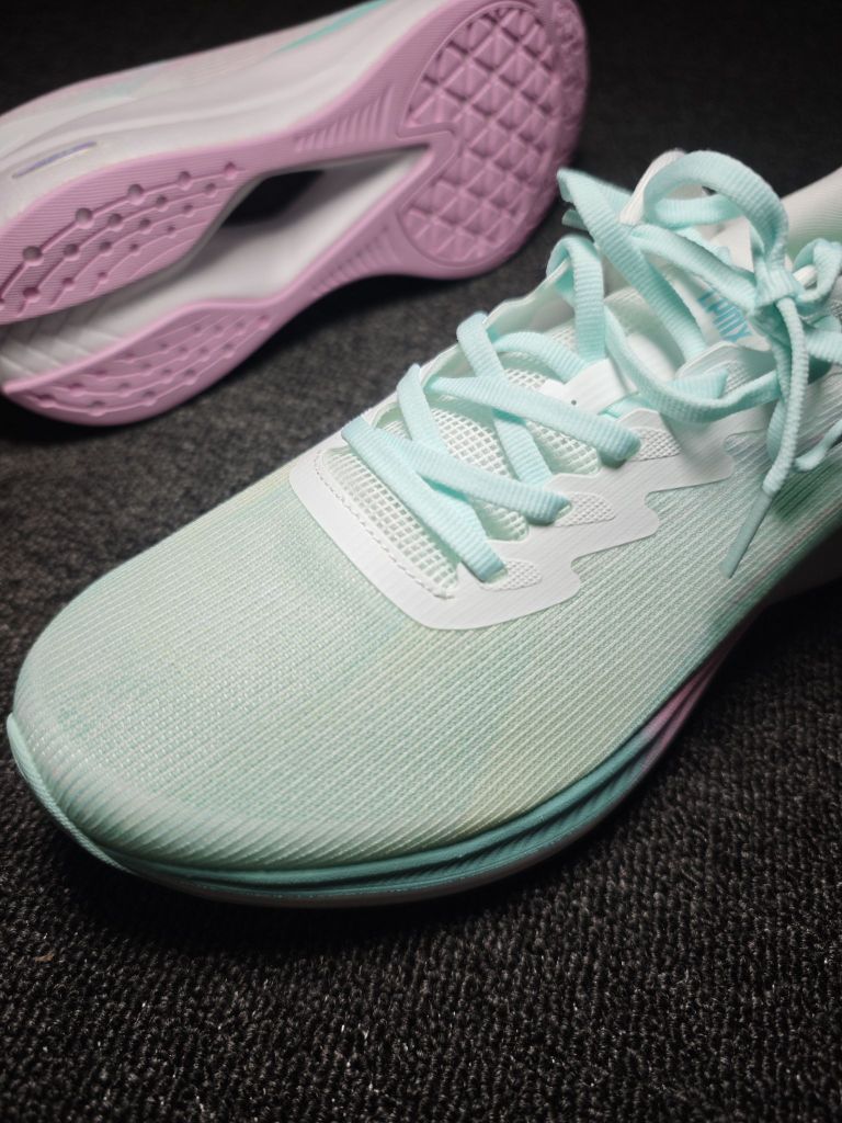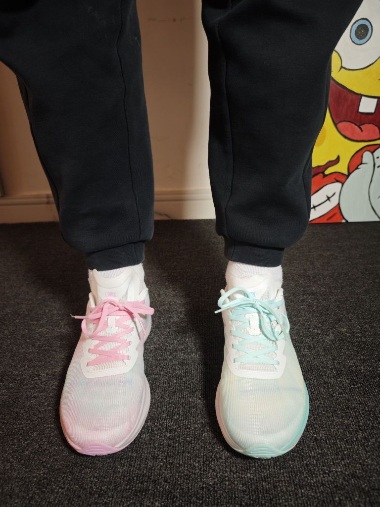 👨🏻本人数据:183cm 85kg 43码 👟今天跟大家一起看下领跑梦想,飞飞飞、飝翼! 😍这鞋子吸引我的第一点就是这个颜值,粉绿鸳鸯配色,很亮眼,够sao气。这就是青春的气息😆? 👟性能方面: 👟透气和包裹:这双鞋鞋面材质做的很透气,打灯可以轻易的穿过,不用担心闷脚。鞋面包裹没有那么极致,更适合20km以内的中距离或者日常通勤慢跑穿。 👟缓震:后掌3cm多的发泡中底,我85kg的体重作为参考,中...