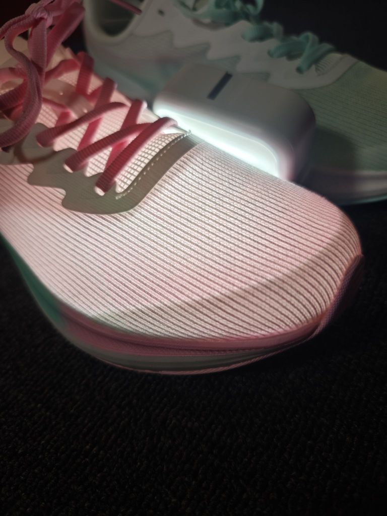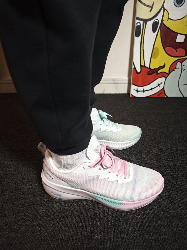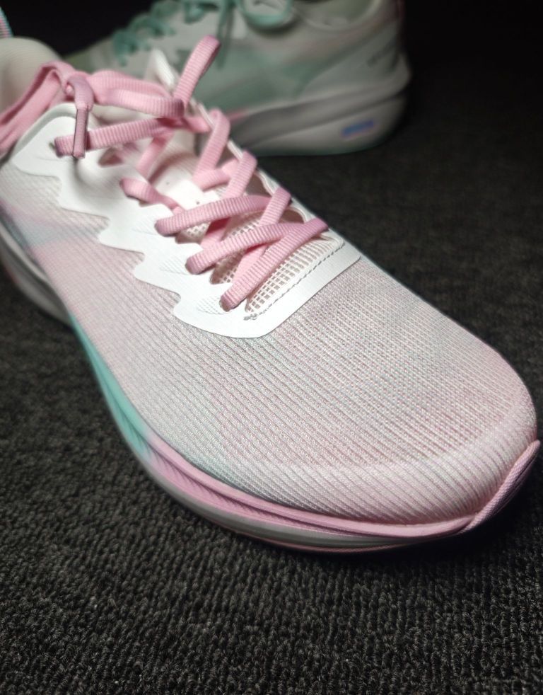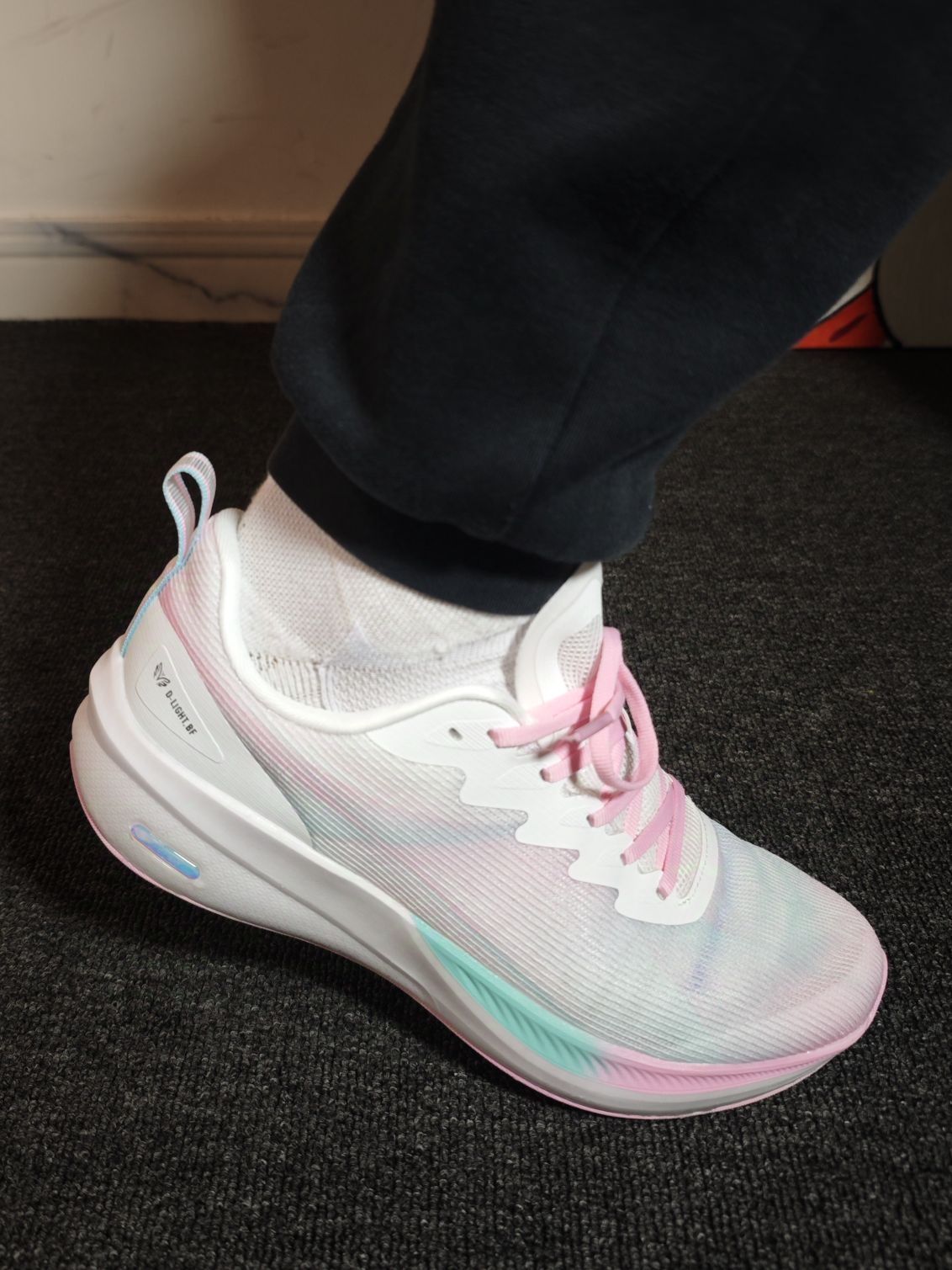 👨🏻本人数据:183cm 85kg 43码 👟今天跟大家一起看下领跑梦想,飞飞飞、飝翼! 😍这鞋子吸引我的第一点就是这个颜值,粉绿鸳鸯配色,很亮眼,够sao气。这就是青春的气息😆? 👟性能方面: 👟透气和包裹:这双鞋鞋面材质做的很透气,打灯可以轻易的穿过,不用担心闷脚。鞋面包裹没有那么极致,更适合20km以内的中距离或者日常通勤慢跑穿。 👟缓震:后掌3cm多的发泡中底,我85kg的体重作为参考,中...