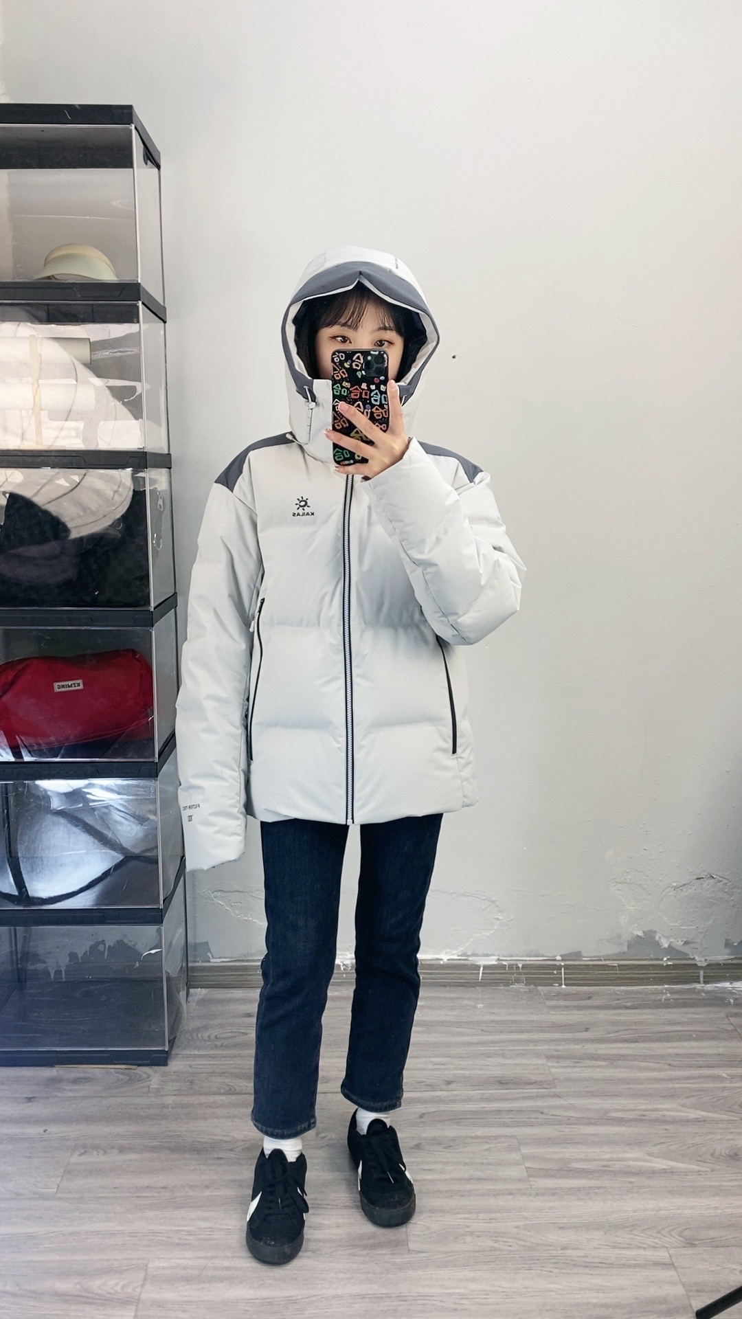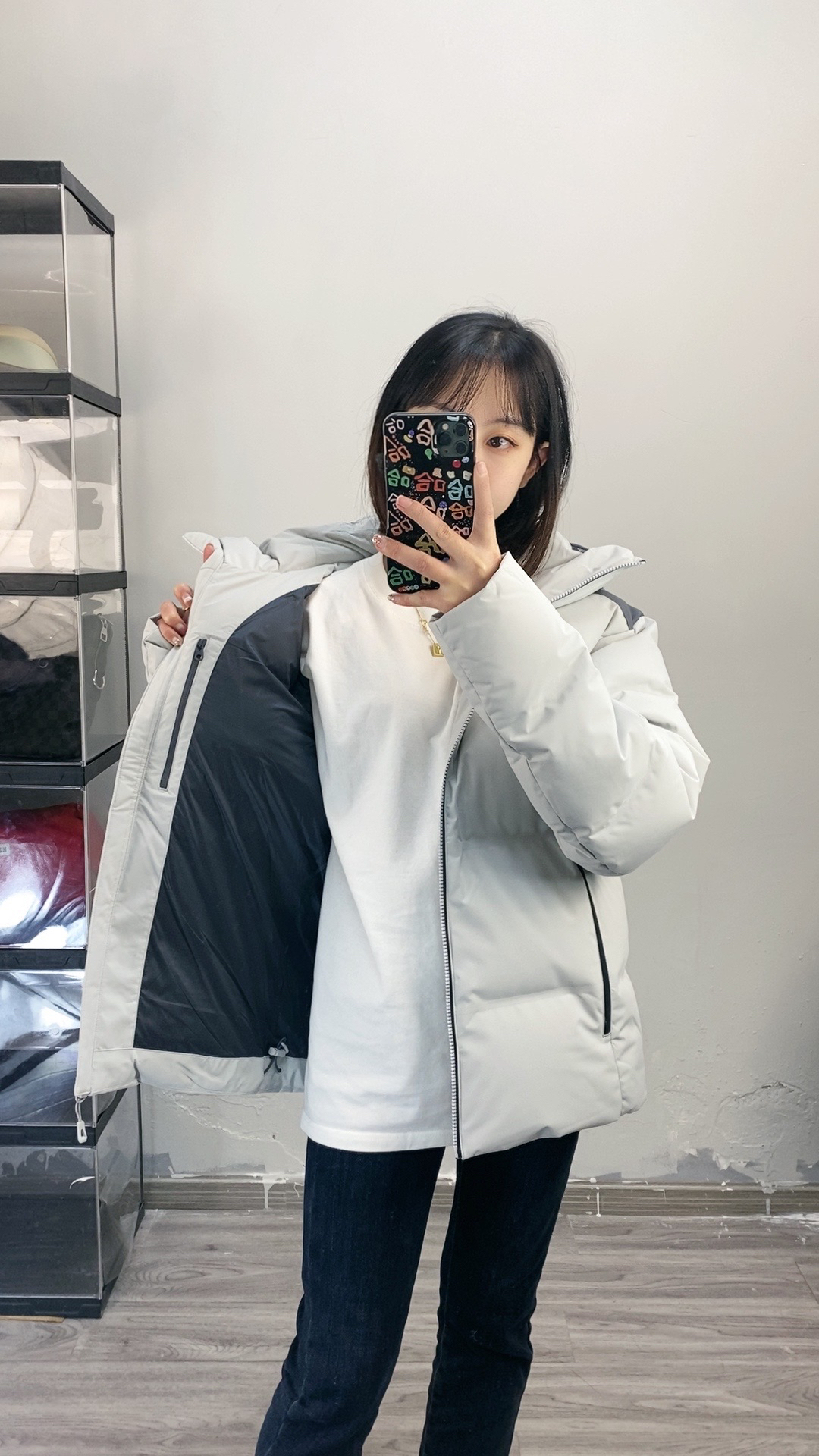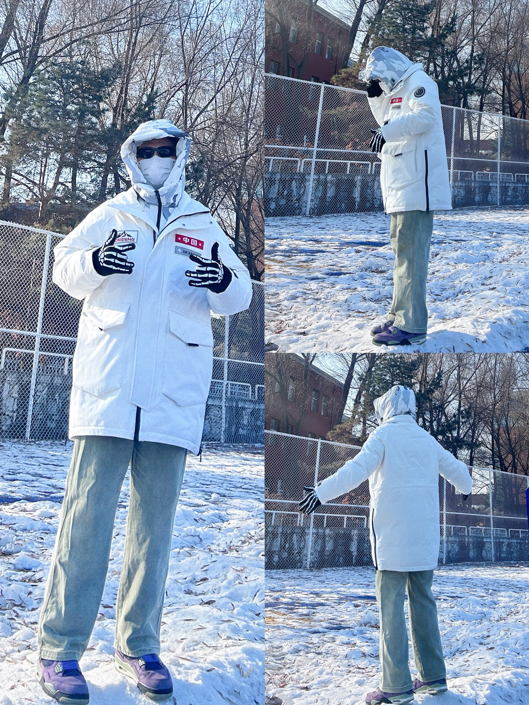 155,86斤穿的xs码,我穿这个码偏宽松一些,袖子也长一些 面料硬壳面料防泼水,也比较耐刮耐磨,而且拉链都是做的压胶防水拉链,700蓬超蓬松,充绒量也是90%,保暖效果绝对是赞的 上身轻盈不厚重,颜色低调大气很好搭!