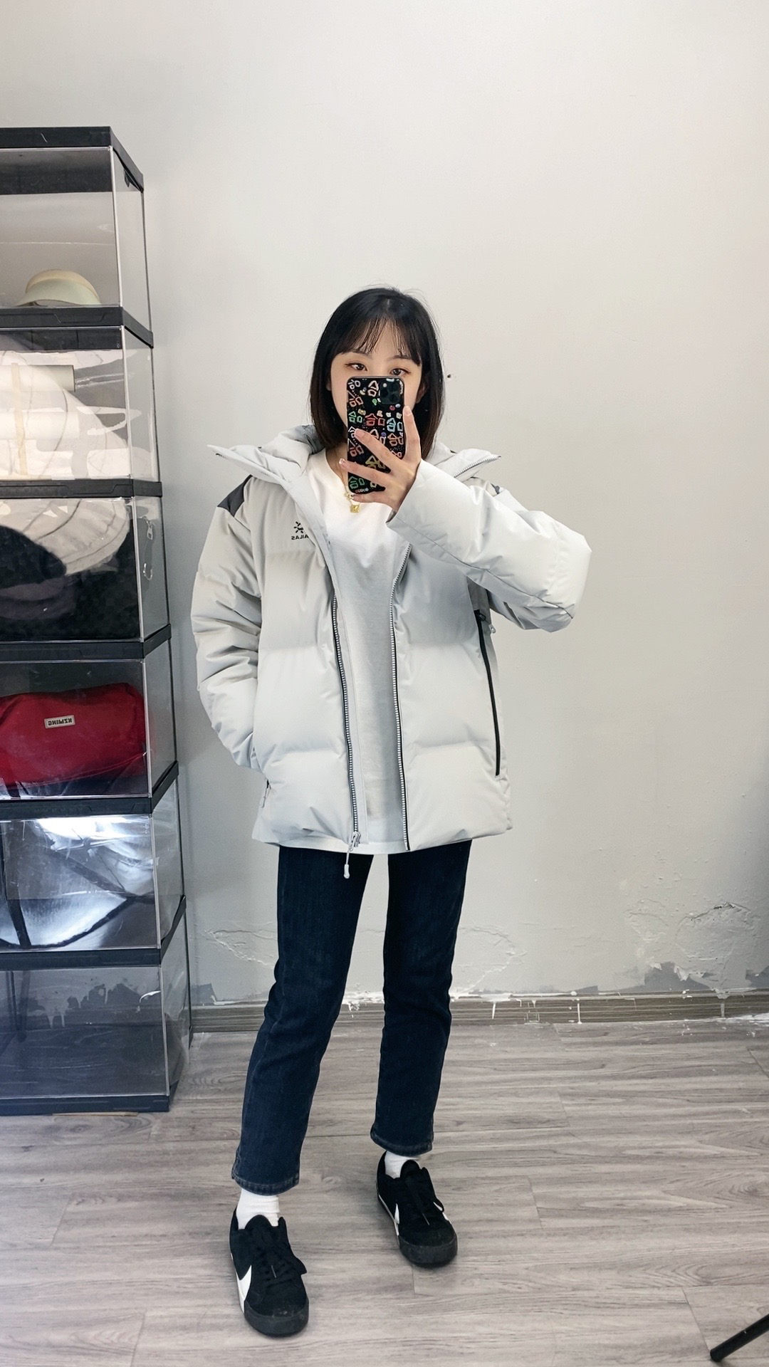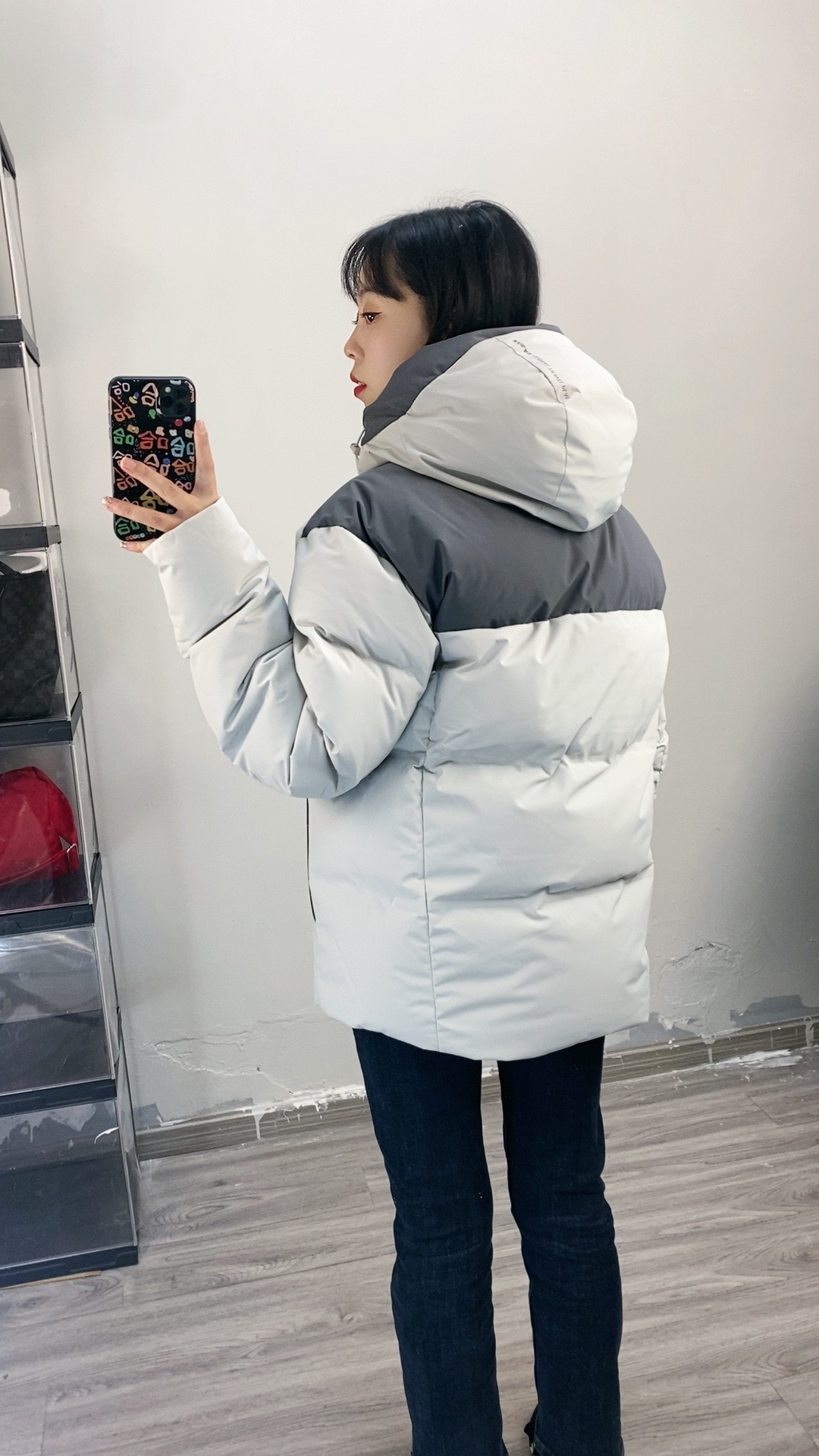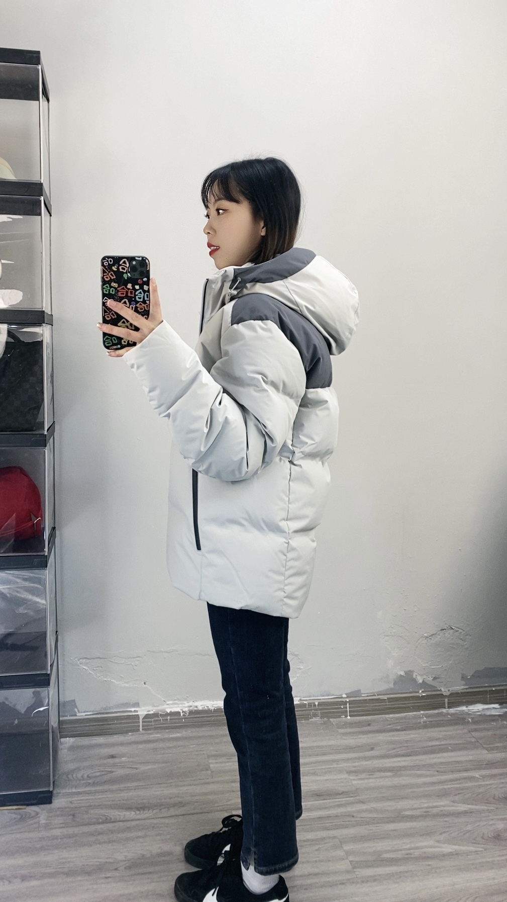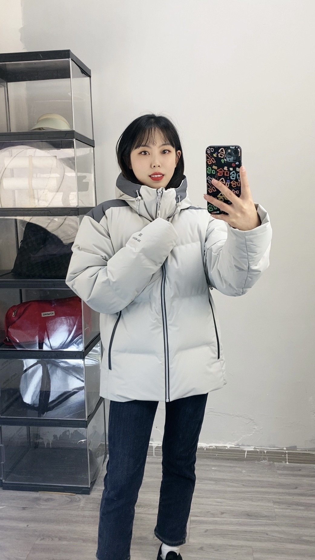 155,86斤穿的xs码,我穿这个码偏宽松一些,袖子也长一些 面料硬壳面料防泼水,也比较耐刮耐磨,而且拉链都是做的压胶防水拉链,700蓬超蓬松,充绒量也是90%,保暖效果绝对是赞的 上身轻盈不厚重,颜色低调大气很好搭!