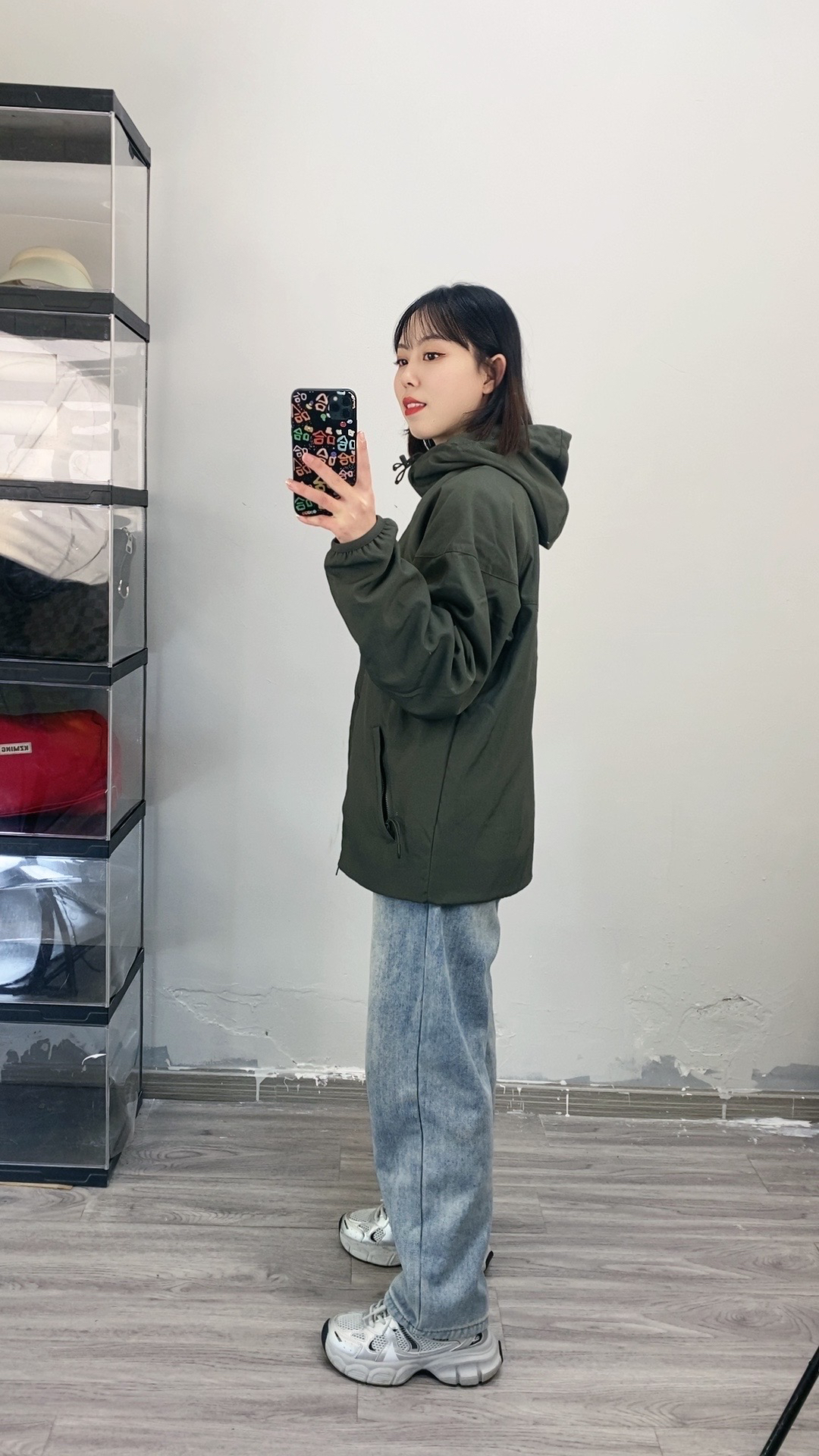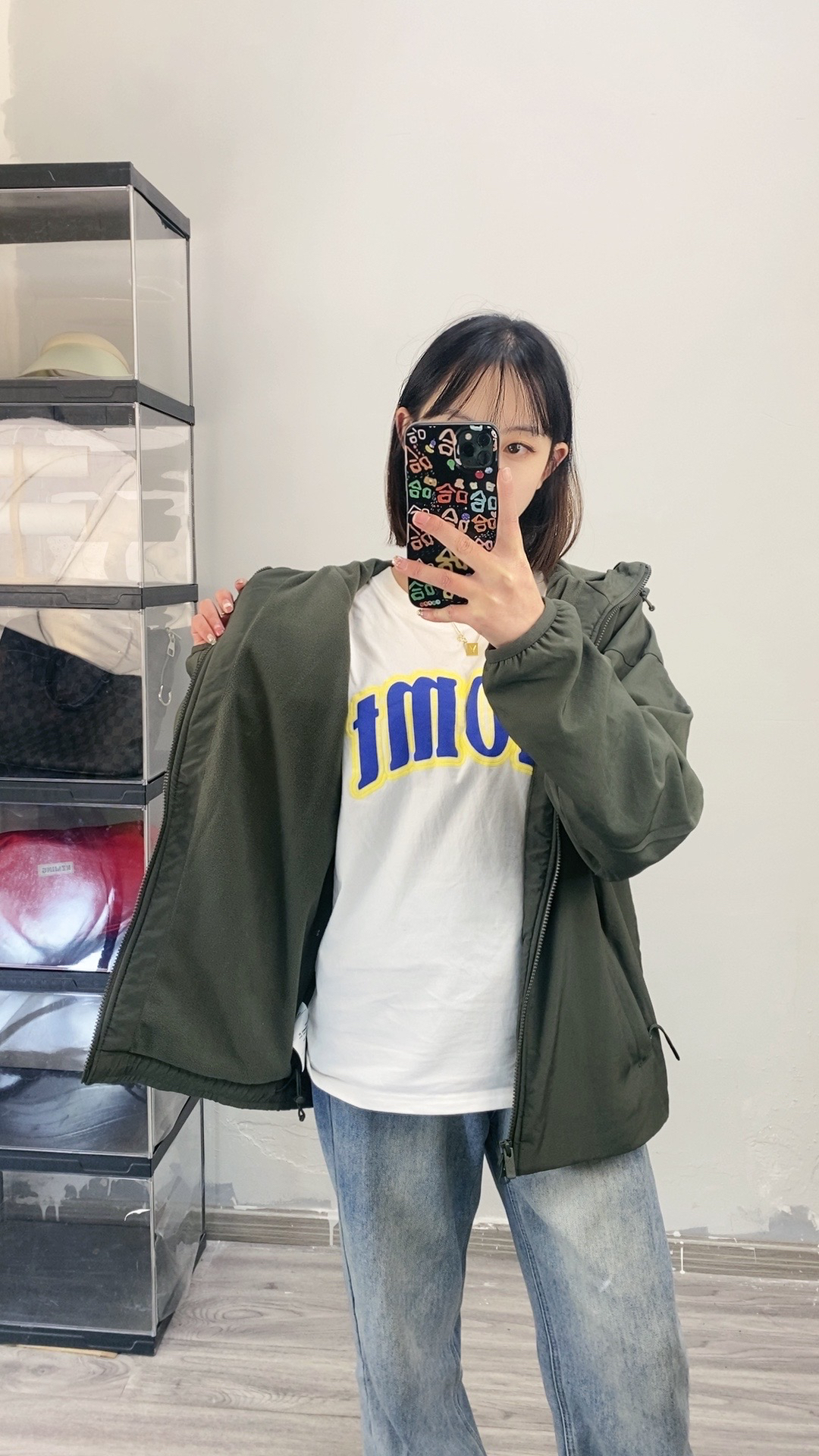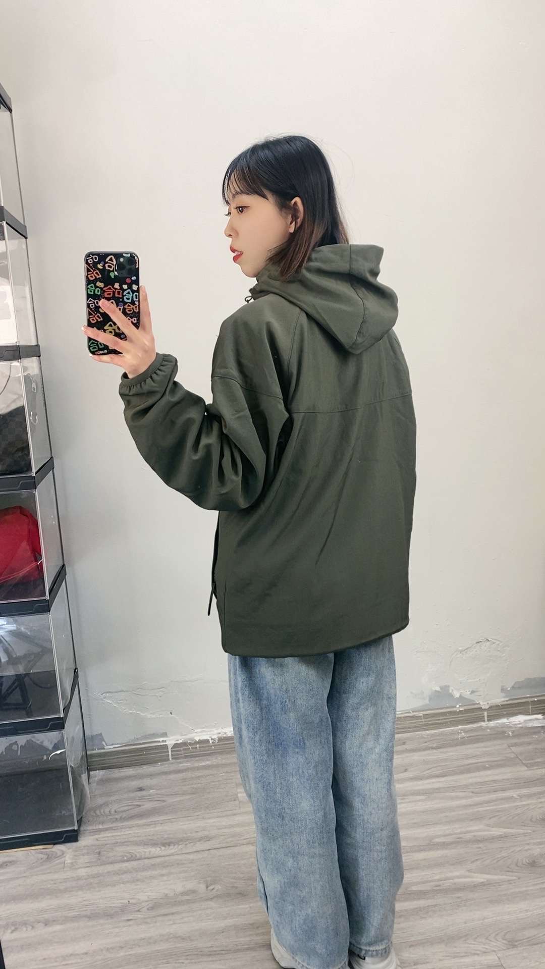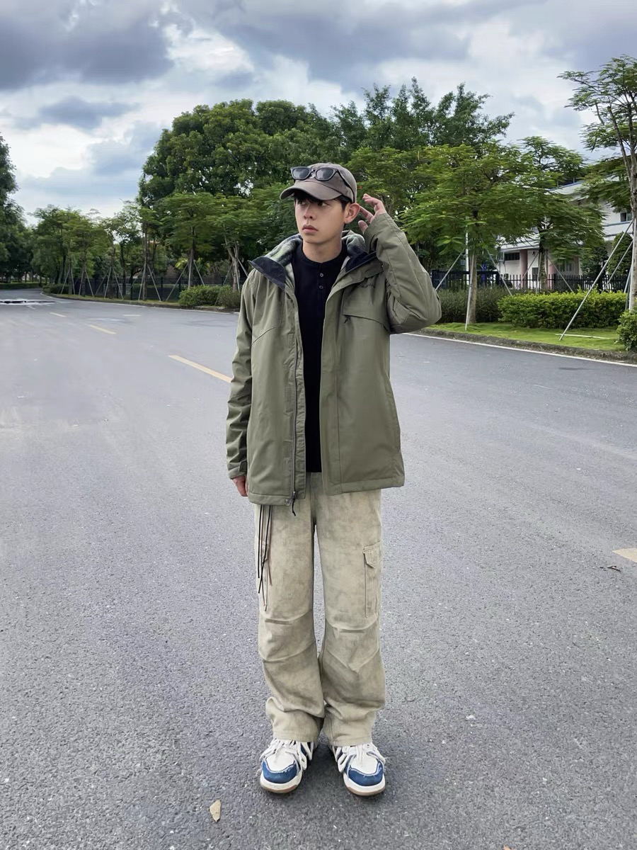 155,86斤穿的s码,我穿这个码还是很宽松的,袖子会长一些,不过很喜欢这个s码的上身效果 面料垂感度比较好,不容易皱,摸上去也有质感,内里也是双层的有摇粒绒,看着很薄拿到手还挺重的,面料也是防风防水的,女生穿这个颜色也好酷✌️