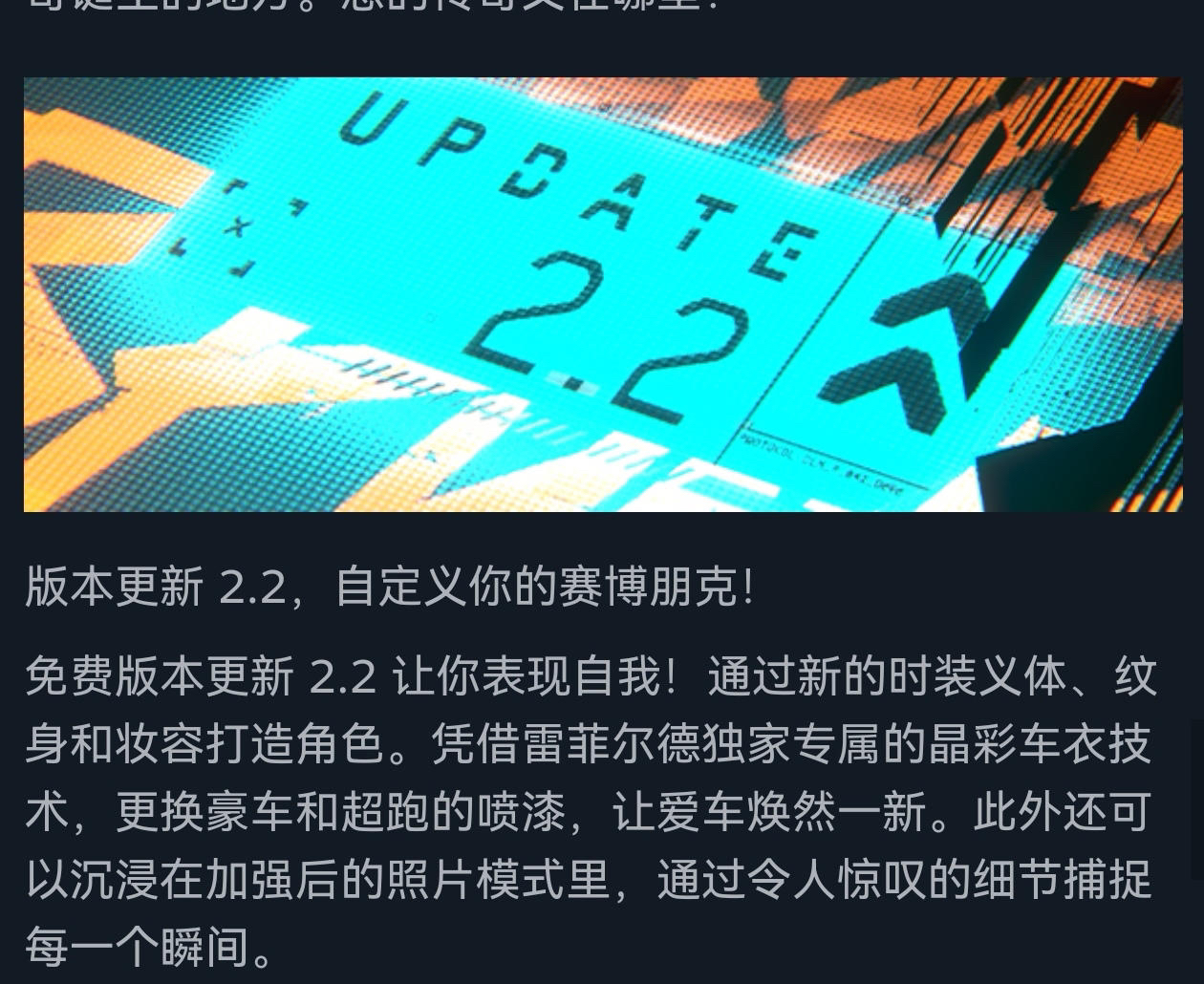 今天凌晨两点,《赛博朋克2077》再次迎来史低,因为就在今天,游戏已经推出了2.2的版本更新,诚意满满。 在本次更新的版本中,你将以前所未有的方式表达自我—包括V 的100多个全新自定义选项,部分品牌载具兼容了晶彩车衣,为兼容晶彩车衣™的载具开放全新的调色通配色方案功能等等!照片模式全面重做,新的镜头选项、宽高比、光源以及可以摆姿势的 NPC,这些还只是其中的一部分! 新功能: 雷菲尔德的晶彩车衣...