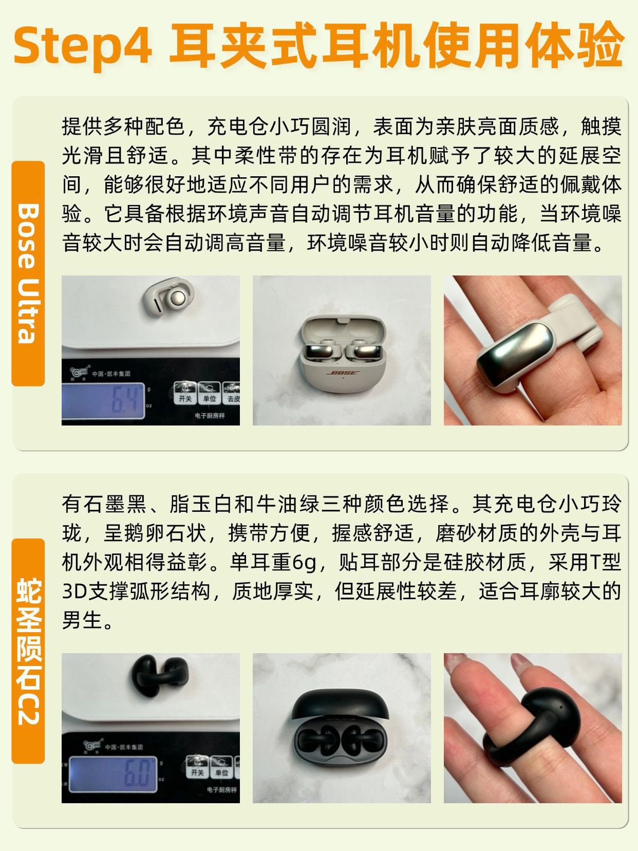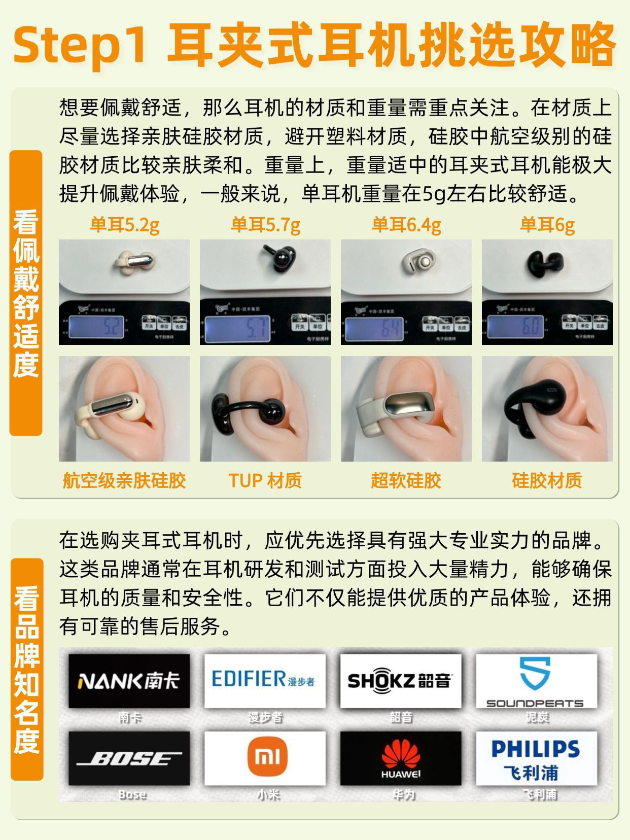 开放式耳夹耳机怎么选?速看详细讲解! 想要入手一款开放式耳夹耳机但又不知道怎么选的朋友们,可以来看看这篇详细讲解。我研究了好久,结合声学知识和实际使用心得,给大家整理了这份攻略👇 纯分享无广,放心抄作业~ ✅佩戴体验:想要佩戴舒适,那么耳机的材质和重量需重点留意。在材质上尽量选择亲肤硅胶材质,避开塑料材质,硅胶中航空级别的硅胶材质比较亲肤柔和。重量上,重量适中的耳夹式耳机能极大提升佩戴体验,...