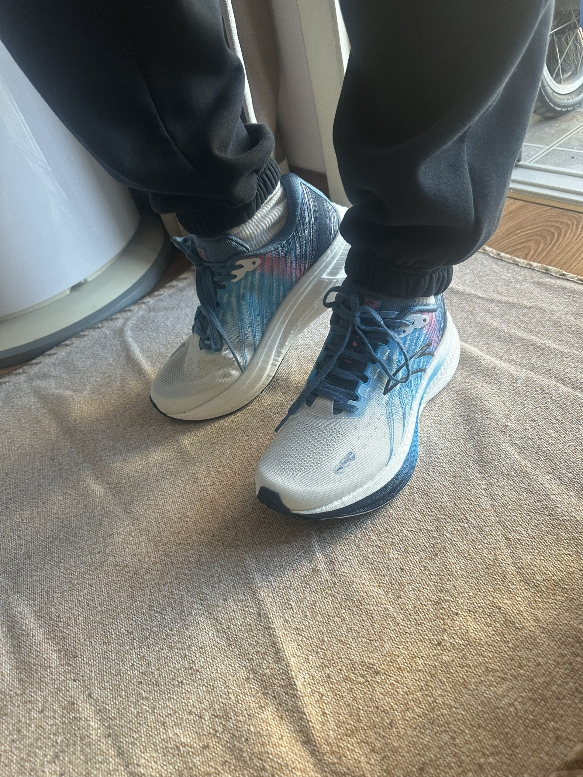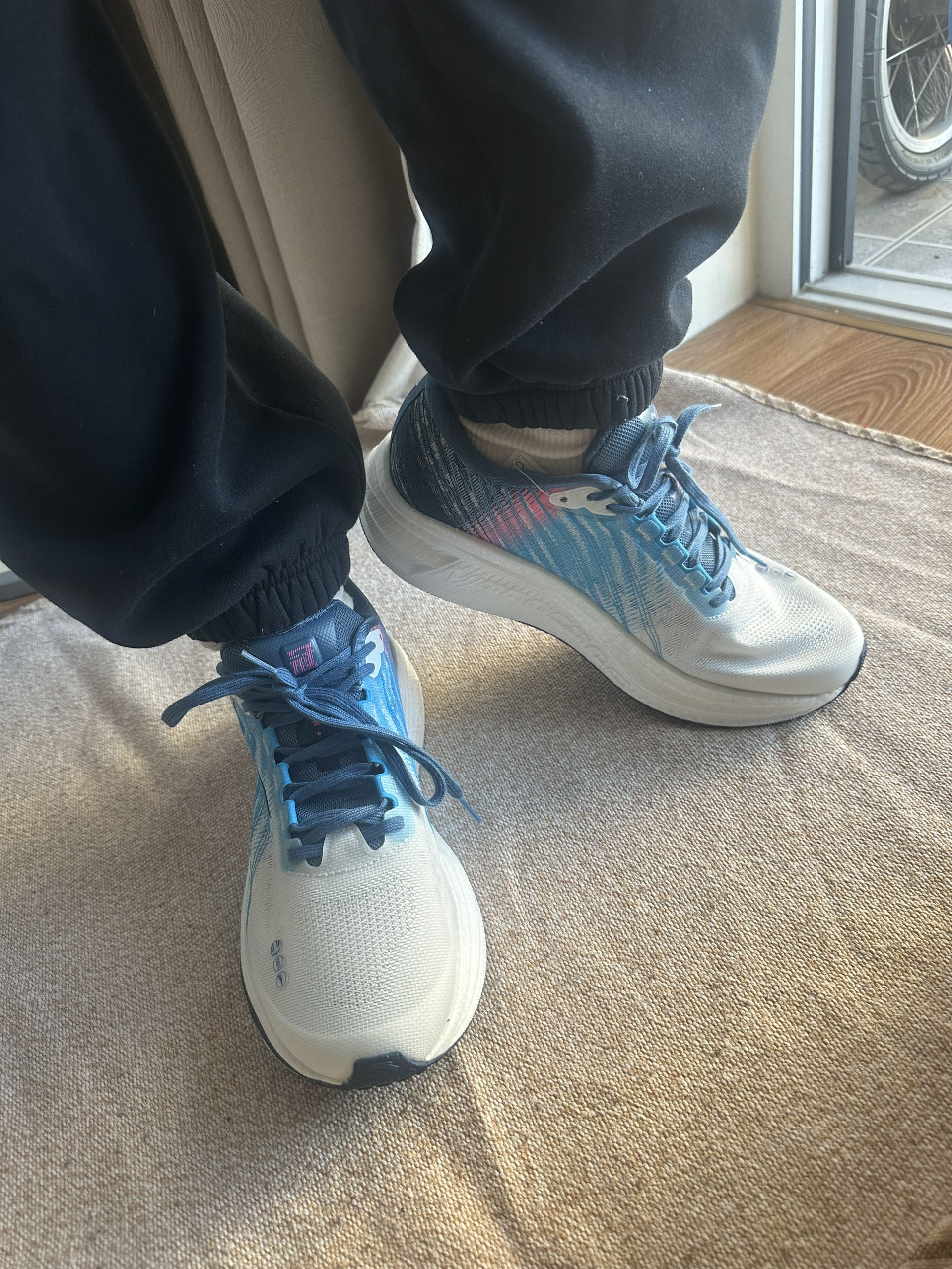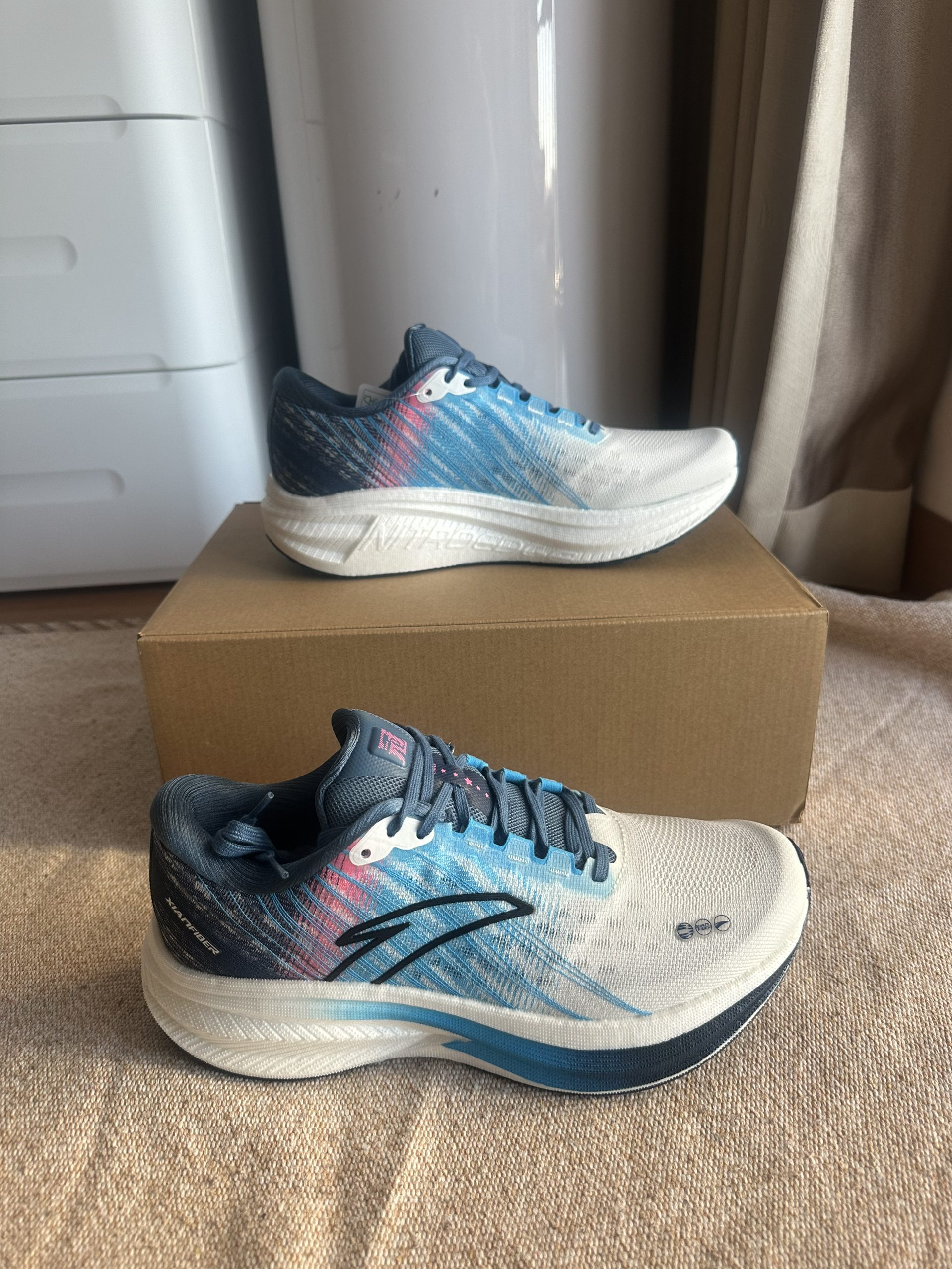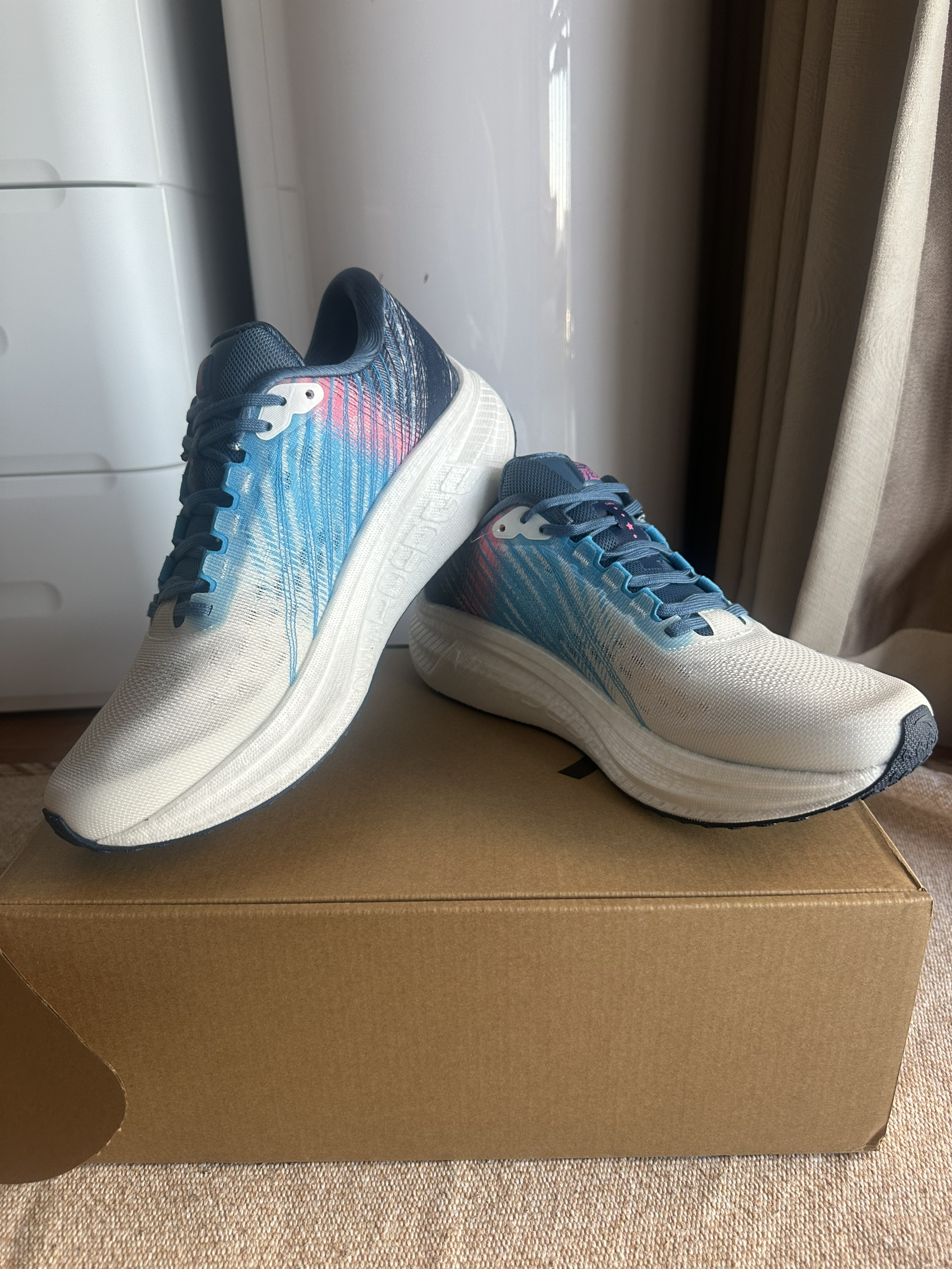 哈喽,今日分享一双安踏跑鞋 是一双竞速训练跑鞋 鞋子配色 白蓝为主 粉色点缀 清爽百搭,潮流炫酷 鞋面采用轻薄透气的TPU绞综打造 全掌氮科技中底 脚感软弹 适合中小体重 中长距离竞速 宽大脚型可以穿,友好