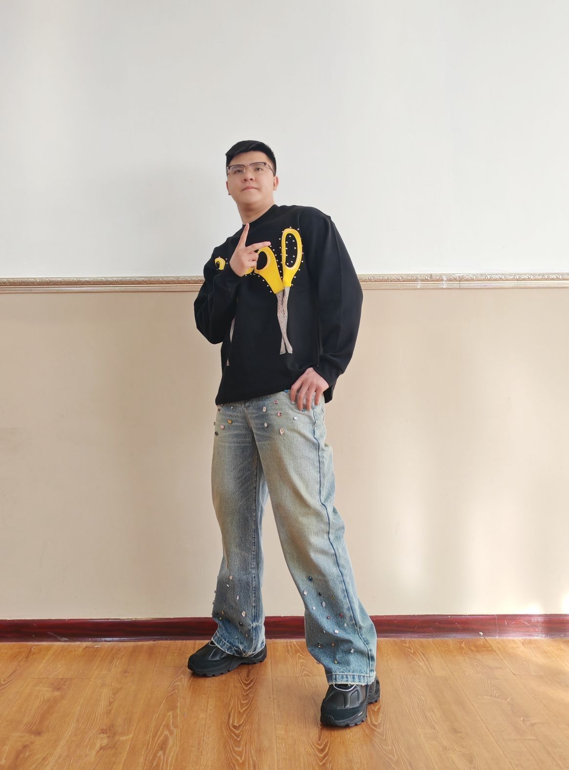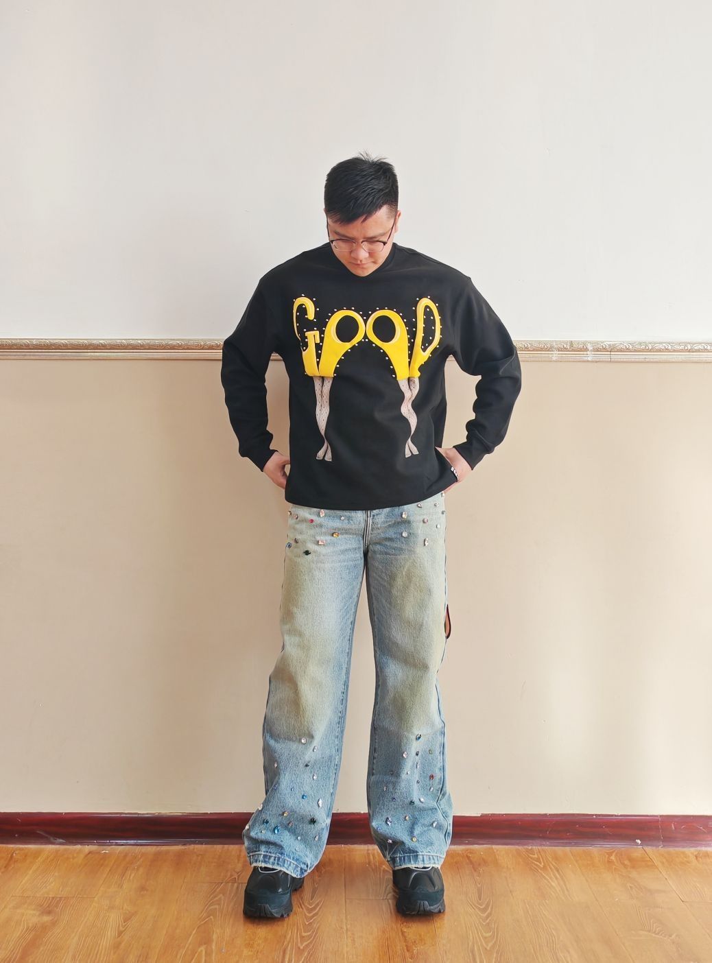 上衣:GOOD 迷人的剪刀圆领体恤剪刀是3D的哦,质感棒棒哒 裤子:GOOD 手工宝石宽松牛仔裤宝石非常漂亮,非常重工,非常精致