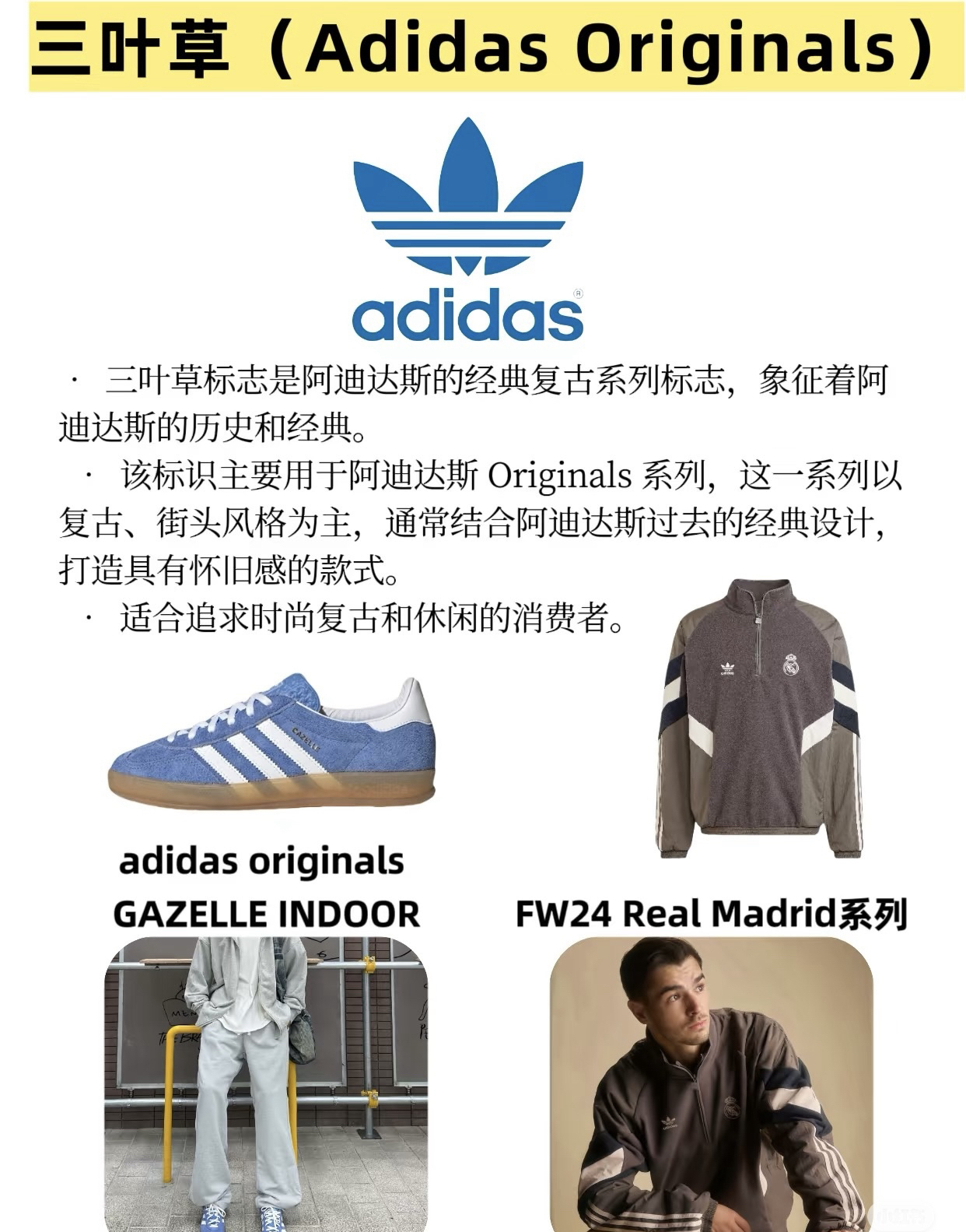 1. 三叶草标志(Adidas Originals):这个标志象征着将三个大陆板块连接在一起,形状如同地球立体三维的平面展开,与世界地图非常相似,代表着延展到全世界的运动力量。这个标志也象征着阿迪达斯品牌的创始人阿迪·达斯勒在运动鞋上所缝的三条纹路。三叶草标志从1972年开始成为阿迪达斯的标志,后来在1996年被专门使用于经典系列Original产品,这个系列选择阿迪达斯历史上最好的产品作为蓝本...