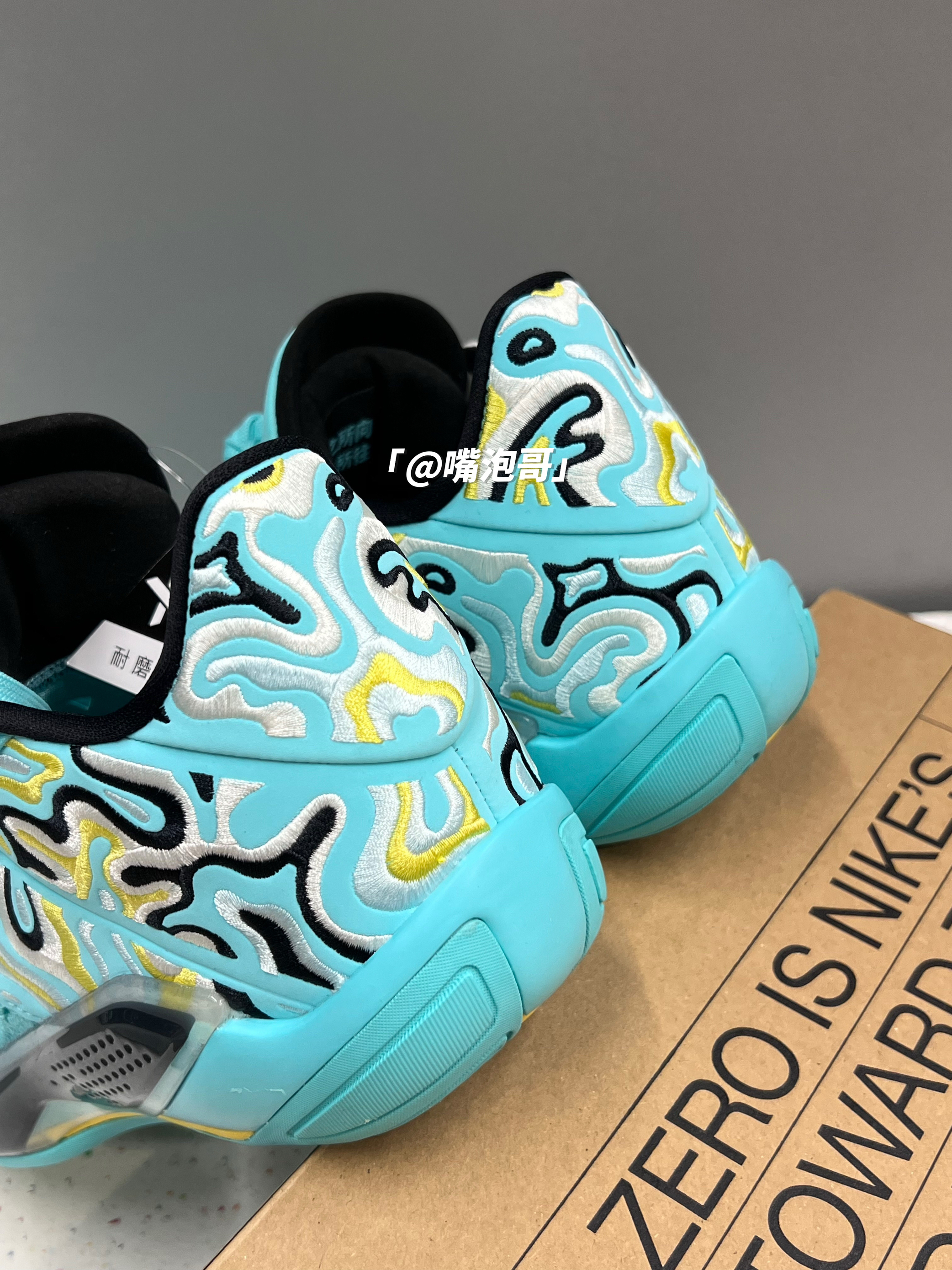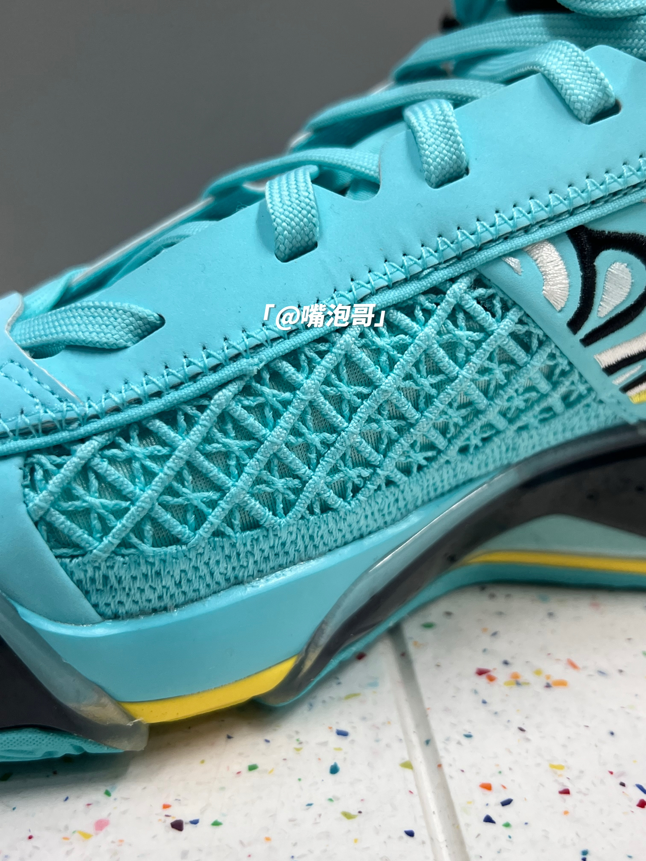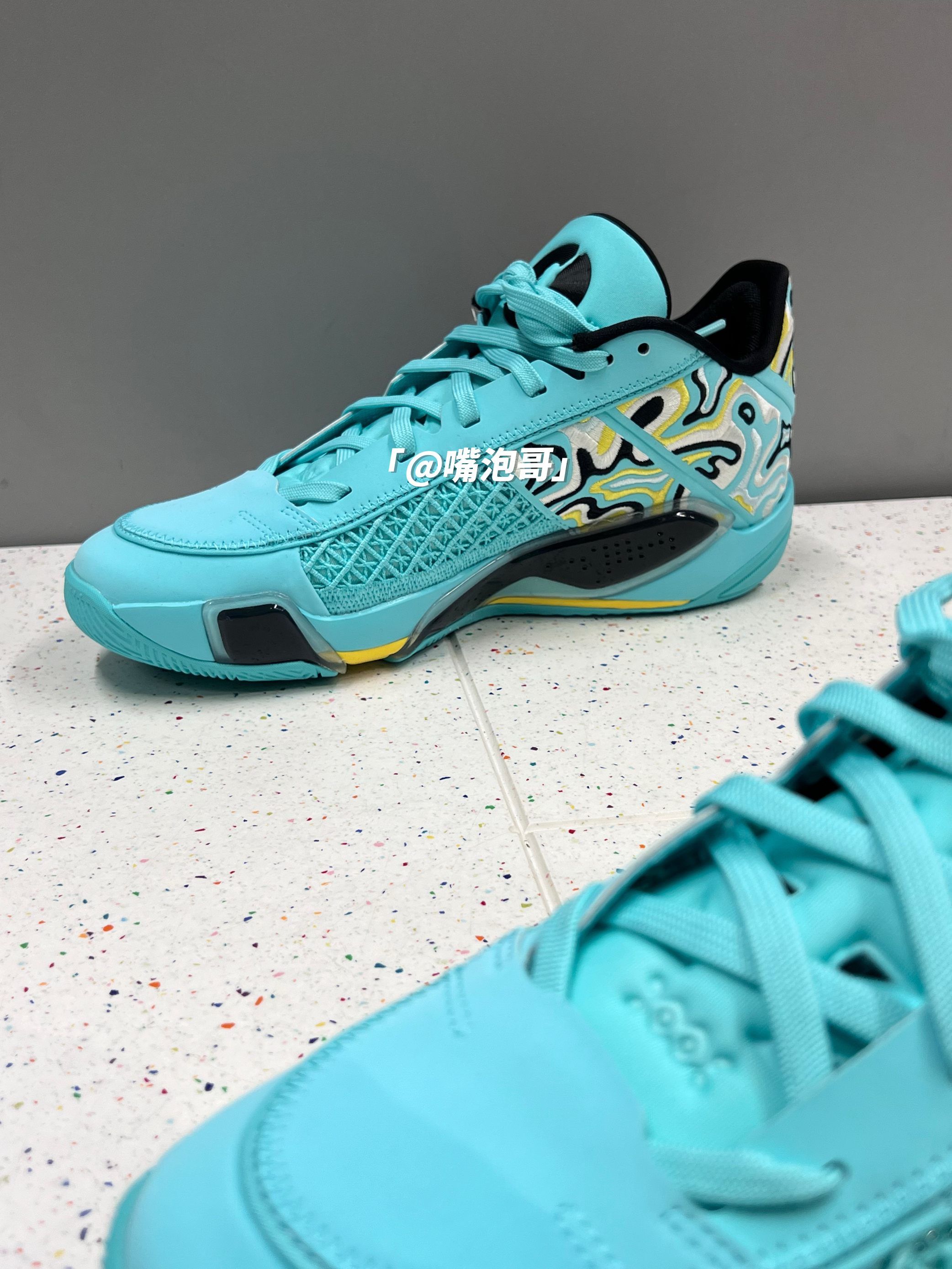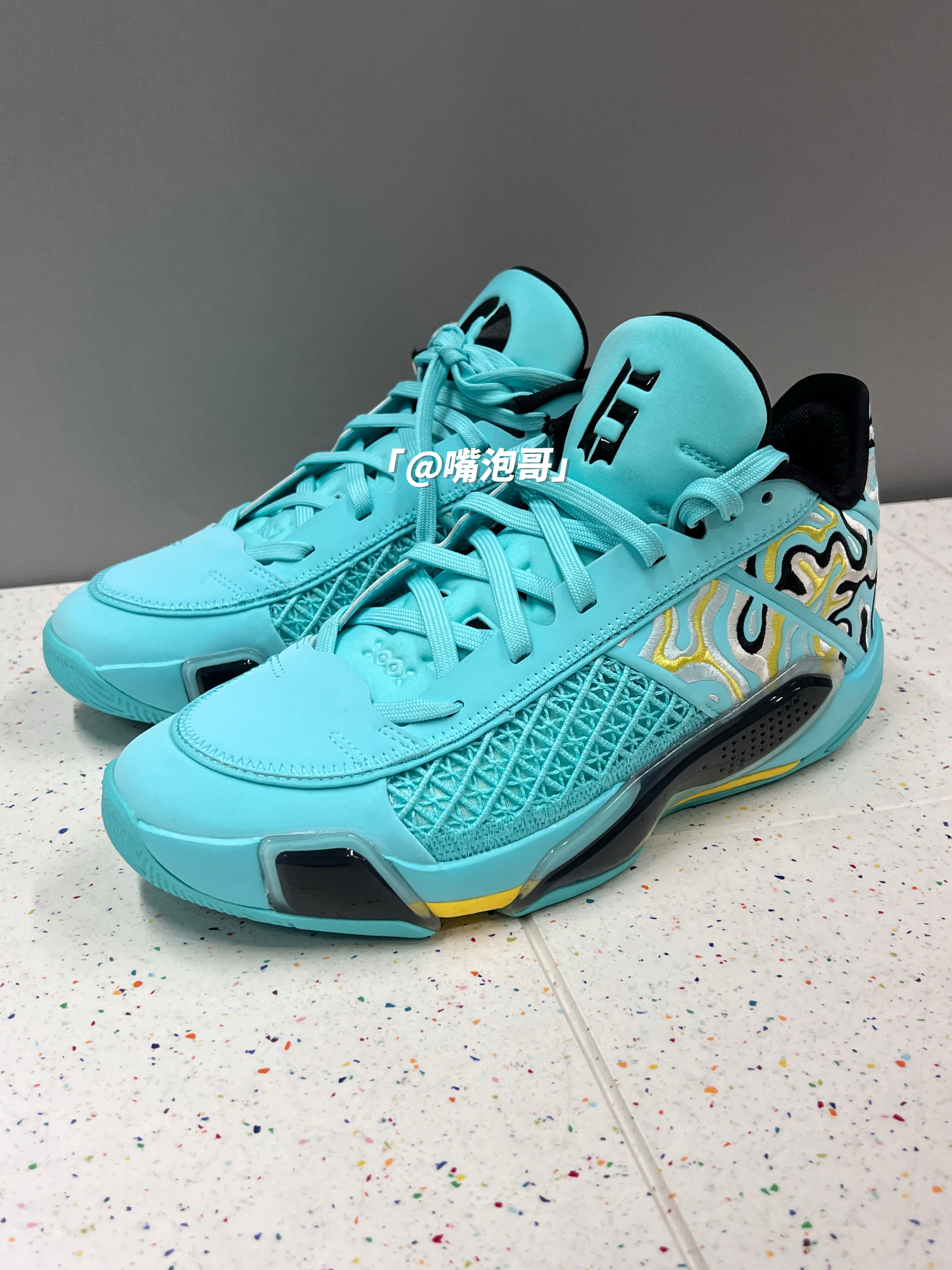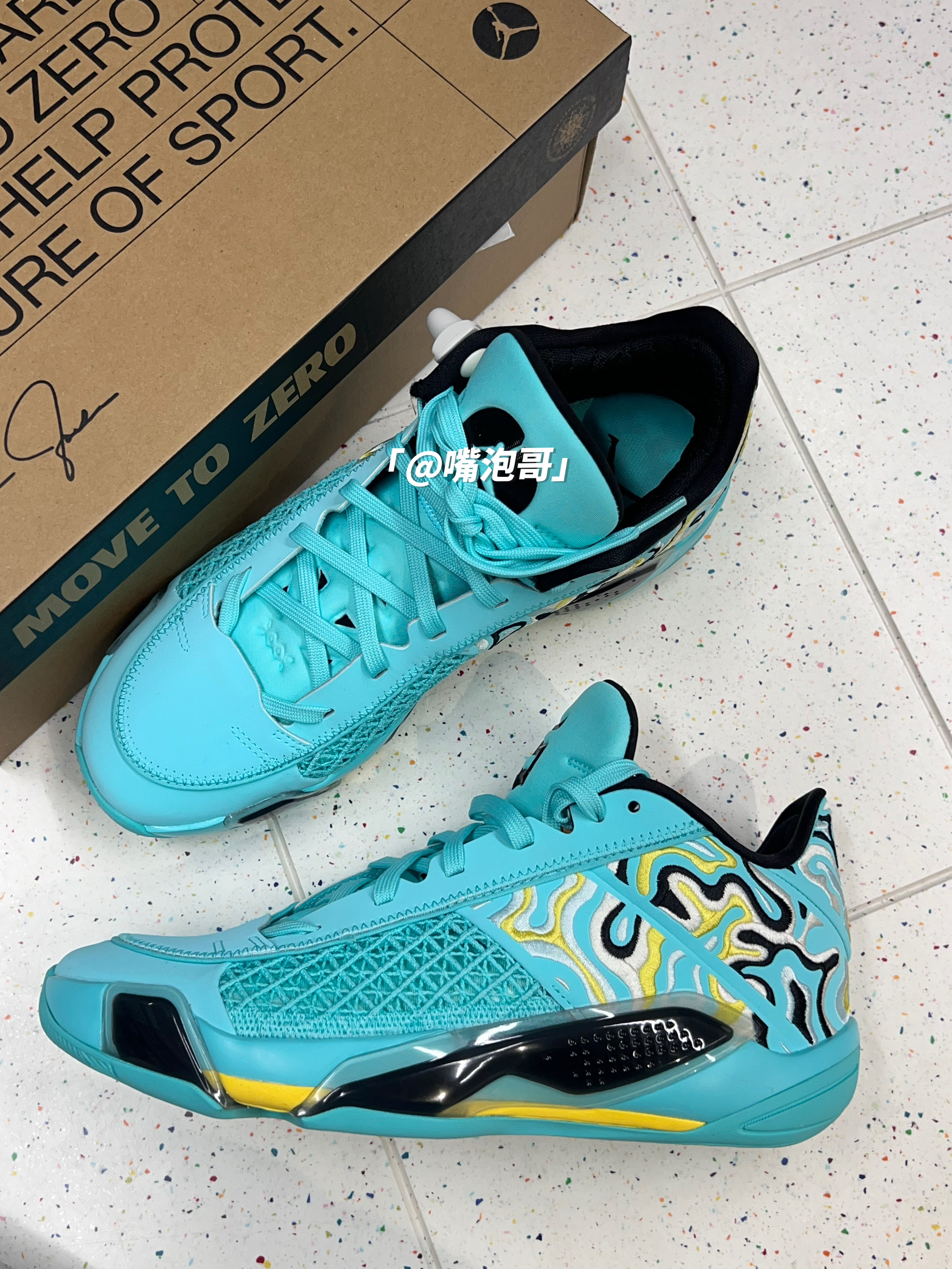 哈喽大家好! 今天和大家来分享一双很显眼的实战球鞋,这双AJ38低帮球鞋,整体造型是流线型的造型,与脚部贴合度很好,穿起来还是很跟脚的,鞋子的外观用了湖水蓝的配色,在运动穿搭中很是显眼,鞋面用了皮革与织物的组合,所以整体的质感很不错,鞋舌与后跟内里进行加厚填充,舒适度蛮不错的,中底是缓震泡棉与气垫的组合,穿鞋打球还是蛮舒服的,底部的防滑做的也不错,日常当做“口粮鞋”是很好的选择。