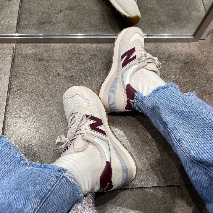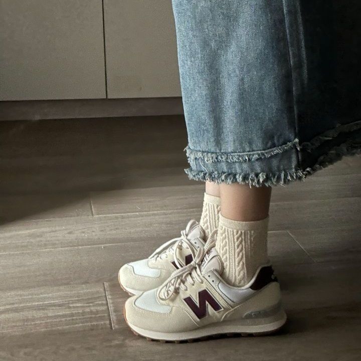 冬日的奶白色和酒红色就是绝配呀 New Balance NB 574 复古 情侣 织物皮革保 暖减震吸汗平衡支撑耐磨透气防滑 低帮跑步鞋 女 款米白色 优点:①颜色特别适合秋冬②脚感很舒服 软弹弹 的③非常好搭配 质感很不错 缺点:①不防滑 下雨天甚穿②不太好打理 穿的时 候要注意哦