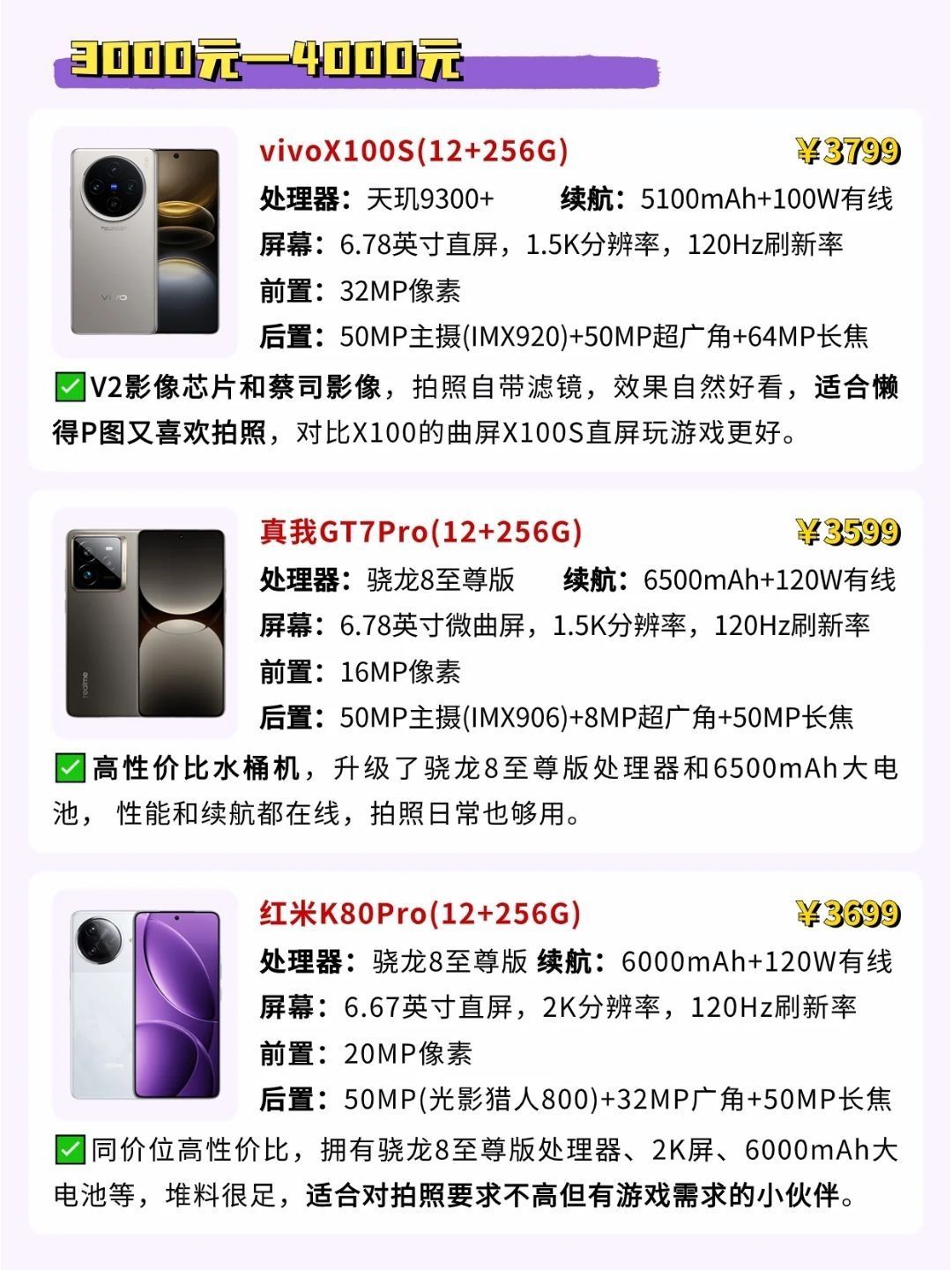 想要拍照好看的建议选📱vivoX100S,不在意拍照只追求游戏体验的话,直接选📱红米K80Pro和真我GT7Pro即可