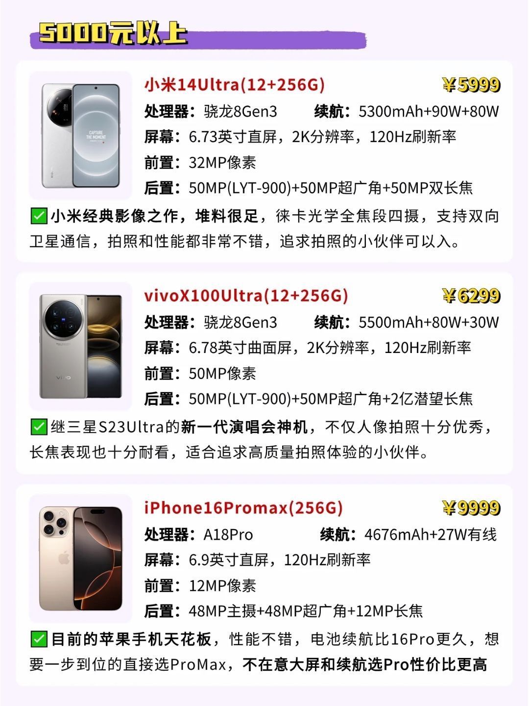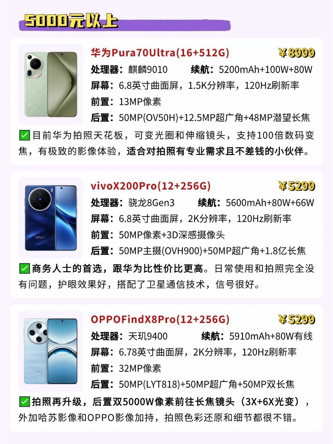 📱vivoX100ultra、X200Pro,OPPOFindX8Pro、FindX7ultra,华为Pura70Ultra、小米14ultra、iPhone16Pro等等都很不错,预算不足又想要配置不错的手机,也可以考虑入二手,性价比会更高一些,特别是这种价格比较高的手机能省的也比较多#手机推荐