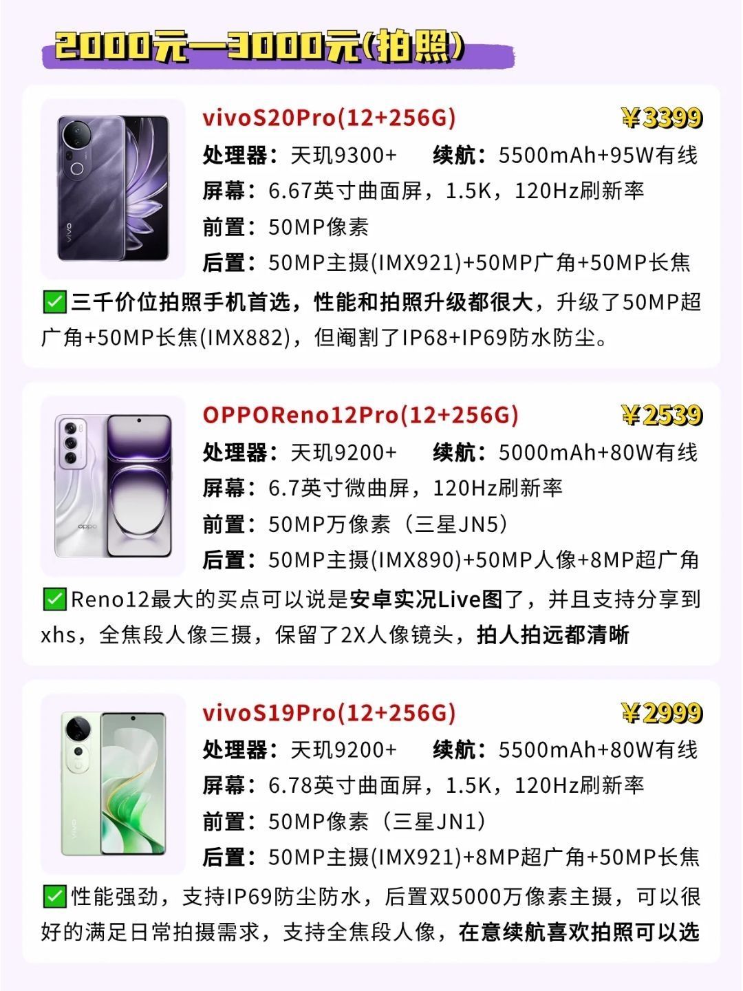 📱拍照:vivoS20Pro、OPPOReno12Pro、vivoS19Pro,这三款都是拍照和性能都不错的,日常玩游戏也没问题,想要拍照效果好的直接选S20Pro