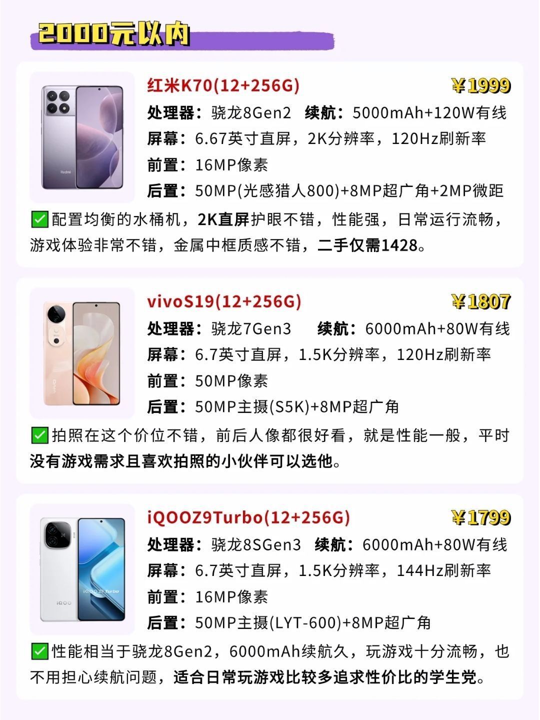 平时有游戏需求可以选📱红米K70、iQOOZ9Turbo,平时拍照比较多对性能要求不是很高可以选📱vivoS19