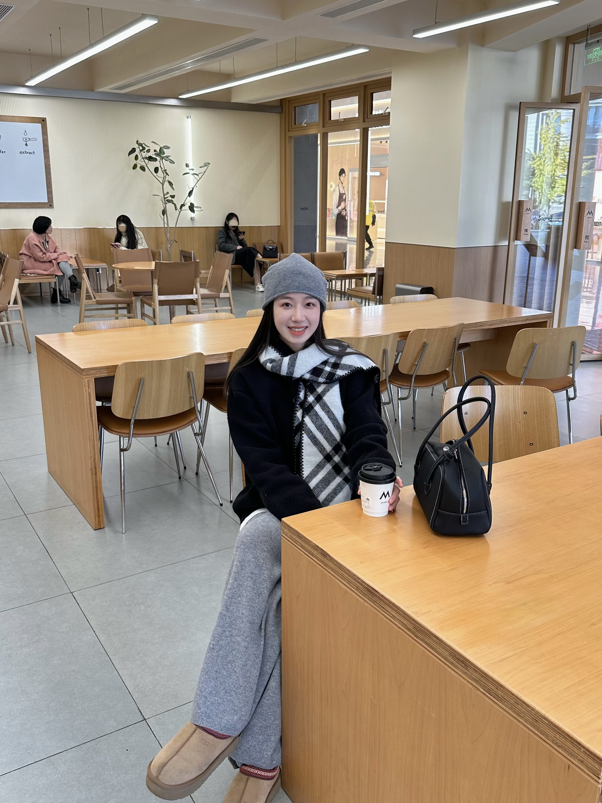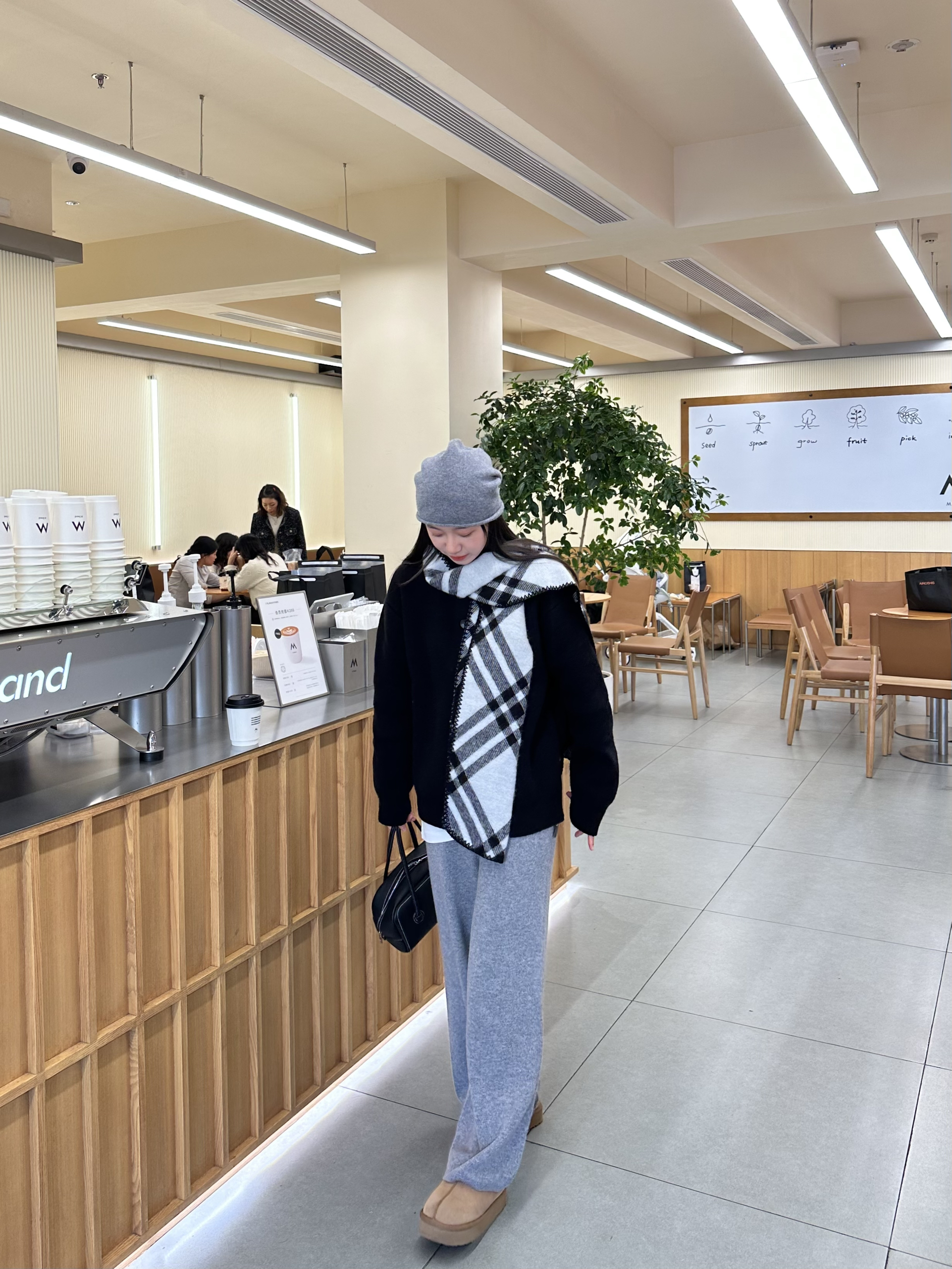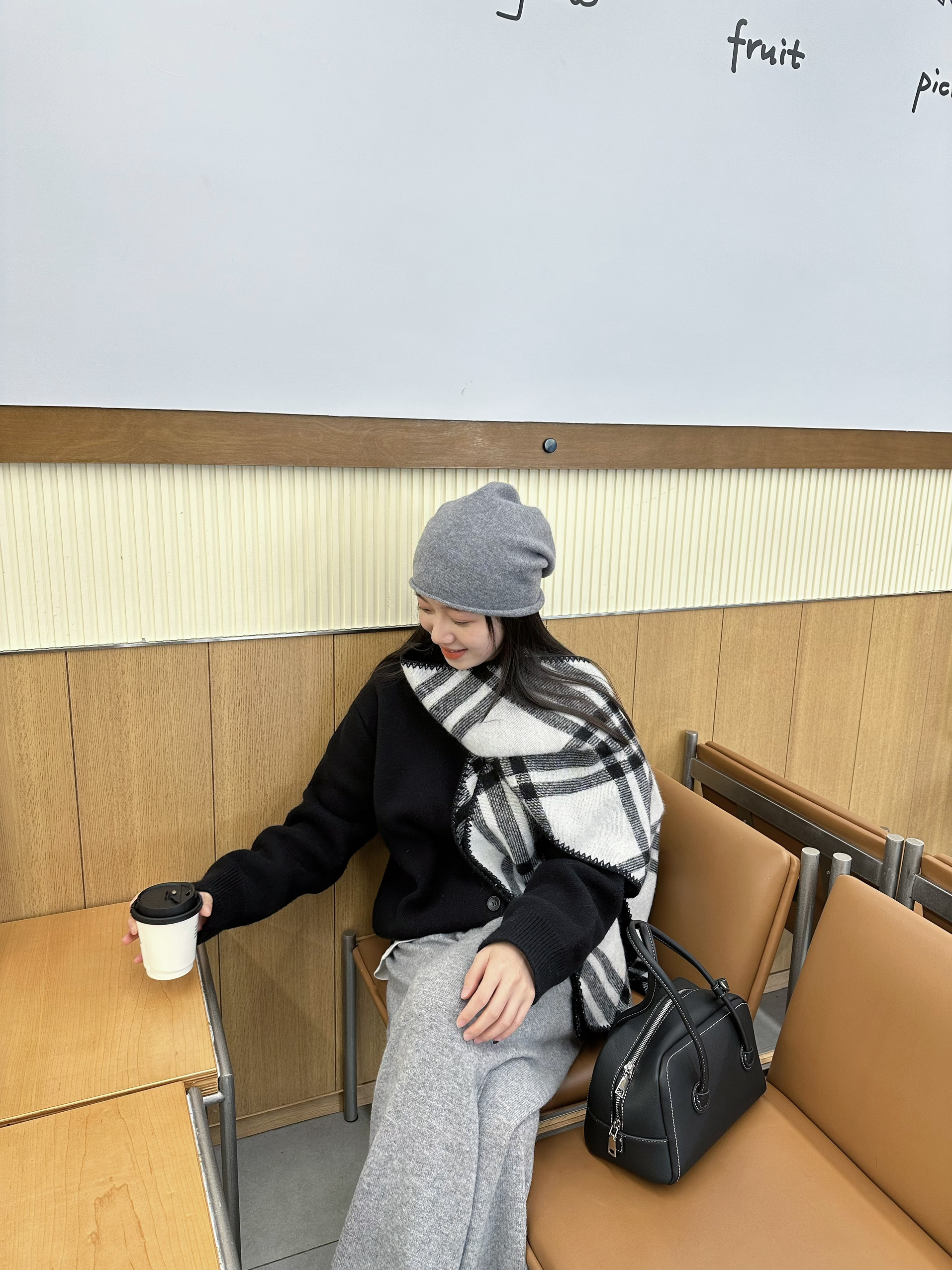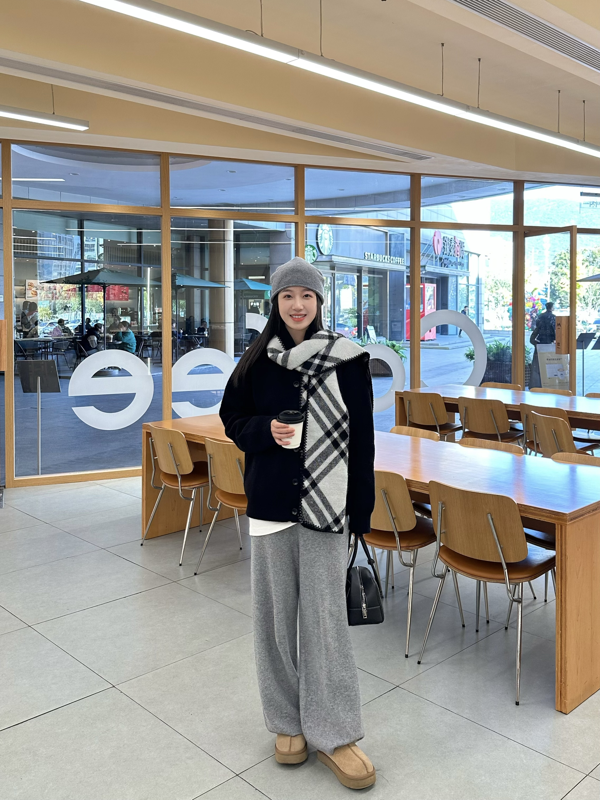 冷帽➕围巾氛围感满满 大大的开衫好有安全感 搭配灰色针织裤好显瘦 黑灰穿搭韩韩的很耐看