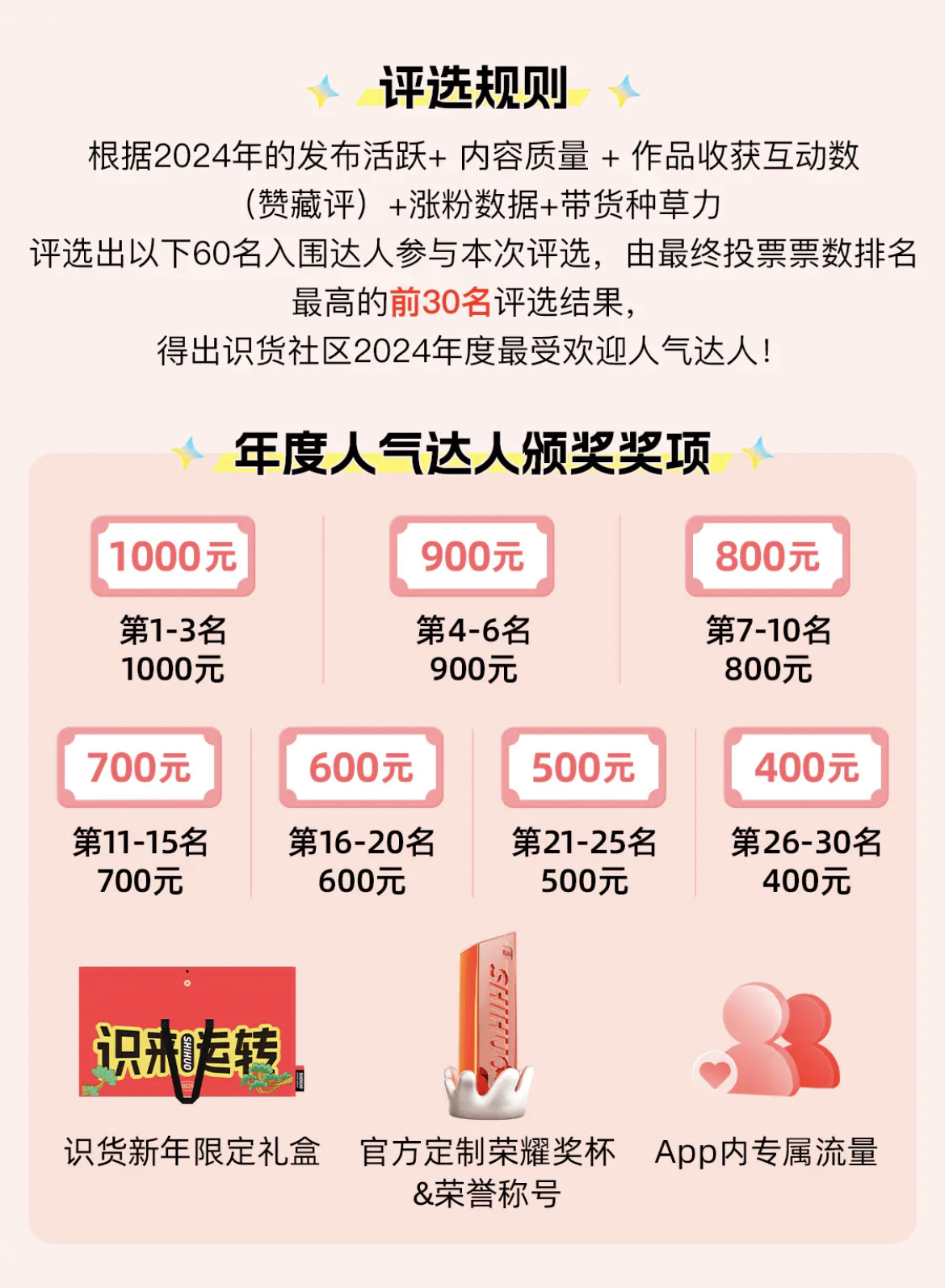 评选投票开启:2024年12月17日—2025年1月6日 评选规则 根据2024年的发布活跃+ 内容质量 + 作品收获互动数(赞藏评)+涨粉数据+带货种草力 评选出以下60名入围达人参与本次评选,由最终投票票数排名最高的前30名评选结果,得出识货社区2024年度最受欢迎人气达人。 颁奖奖项 官方定制年度荣耀奖杯&荣誉称号+识货新年限定礼盒 +最高至千元奖金+app首页专属流量宣发 🎁 每日抽奖赢福...