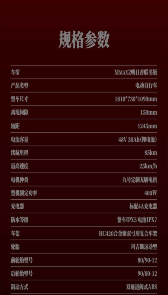 九号机械师二代MMAX2的主要配置参数如下: 电动车类型:电动自行车 整车尺寸:1810×730×1090mm 轴距:1245mm 电池类型:锂电池 电池容量:48V 30Ah 电机类型:九号定制无刷电机 最高时速:25km/h 理论续航:85km 制动系统:双通道阀式ABS 减震系统:31芯前减震,五级可调后减震 轮胎:玛吉斯运动型,前轮胎型号8...