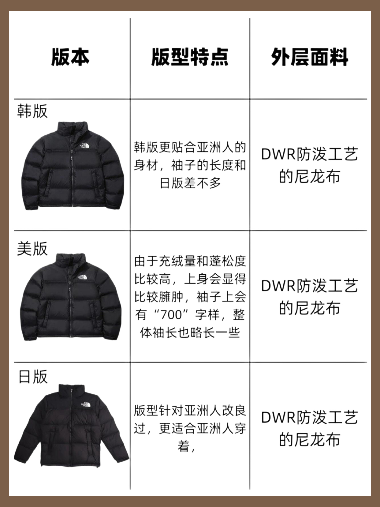 🔥爆款北面1996羽绒服,作为冬季保暖的必备神器,一直以来都备受关注。但是,你知道吗?这款羽绒服其实有三个大版本:韩版、美版、日版,它们之间在保暖性和版型方面可是有着不小的差异哦!👀 1️⃣韩版: • 价格:三个版本中价格最低,性价比超高!💰 • 版型:与日版相近,但更适合亚洲人的身材比例。 • 保暖性:虽然不如美版那么强,但冬天穿也足够暖和啦!不过特别怕冷的小伙伴还是建议选美...