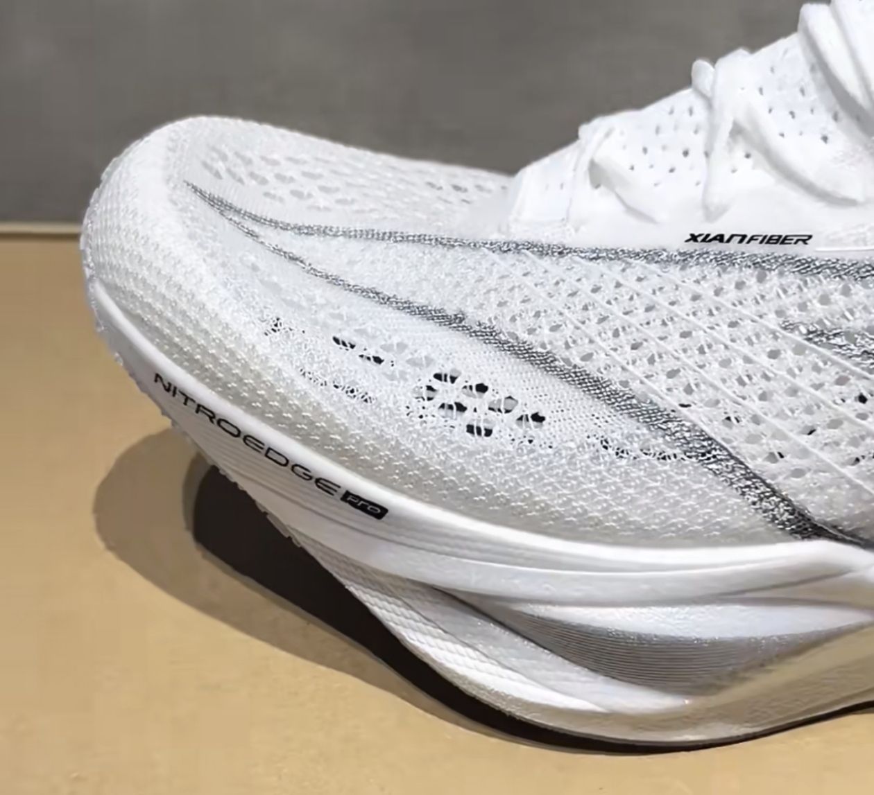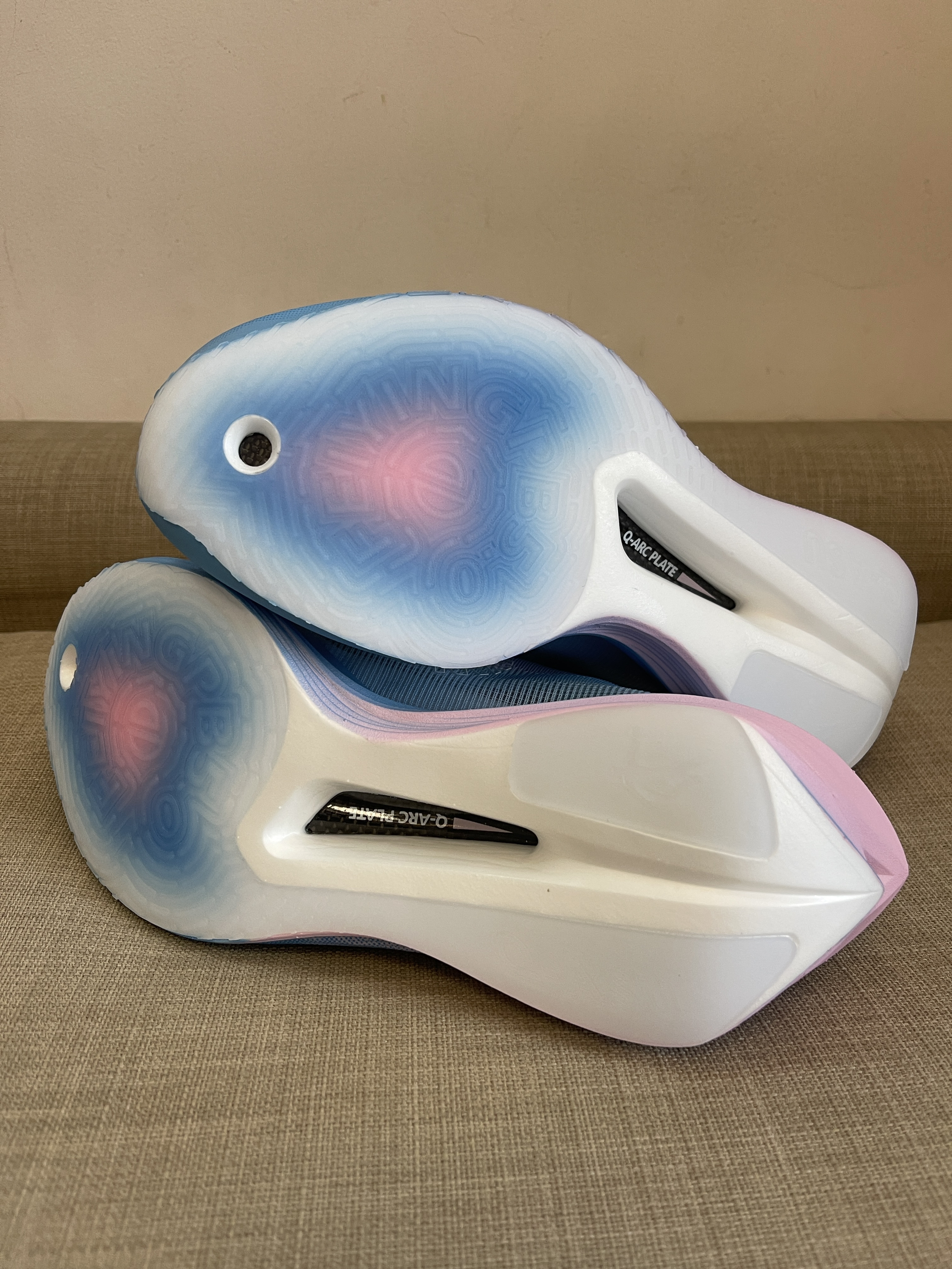 速决6第一眼颜值进步我觉得真的蛮大,而且用料很有意思 外场鞋的设定下并没有疯狂地上塑料热帖而是多层复合织物 还是纹理都很粗实的那种,并且有大面积的反光条,一拼接真的很有“环保版本“的意思 强度也是理所当然地高,实际上脚也没有卡脚情况发生 后跟包围的用料处理也很复杂,收边做得细,没想到在速决6上居然看到了签名鞋的做工.. 而且中底的造型也蛮复杂,EVA框架藏了个LOGO,里头居然是全掌氮科技..鞋垫...