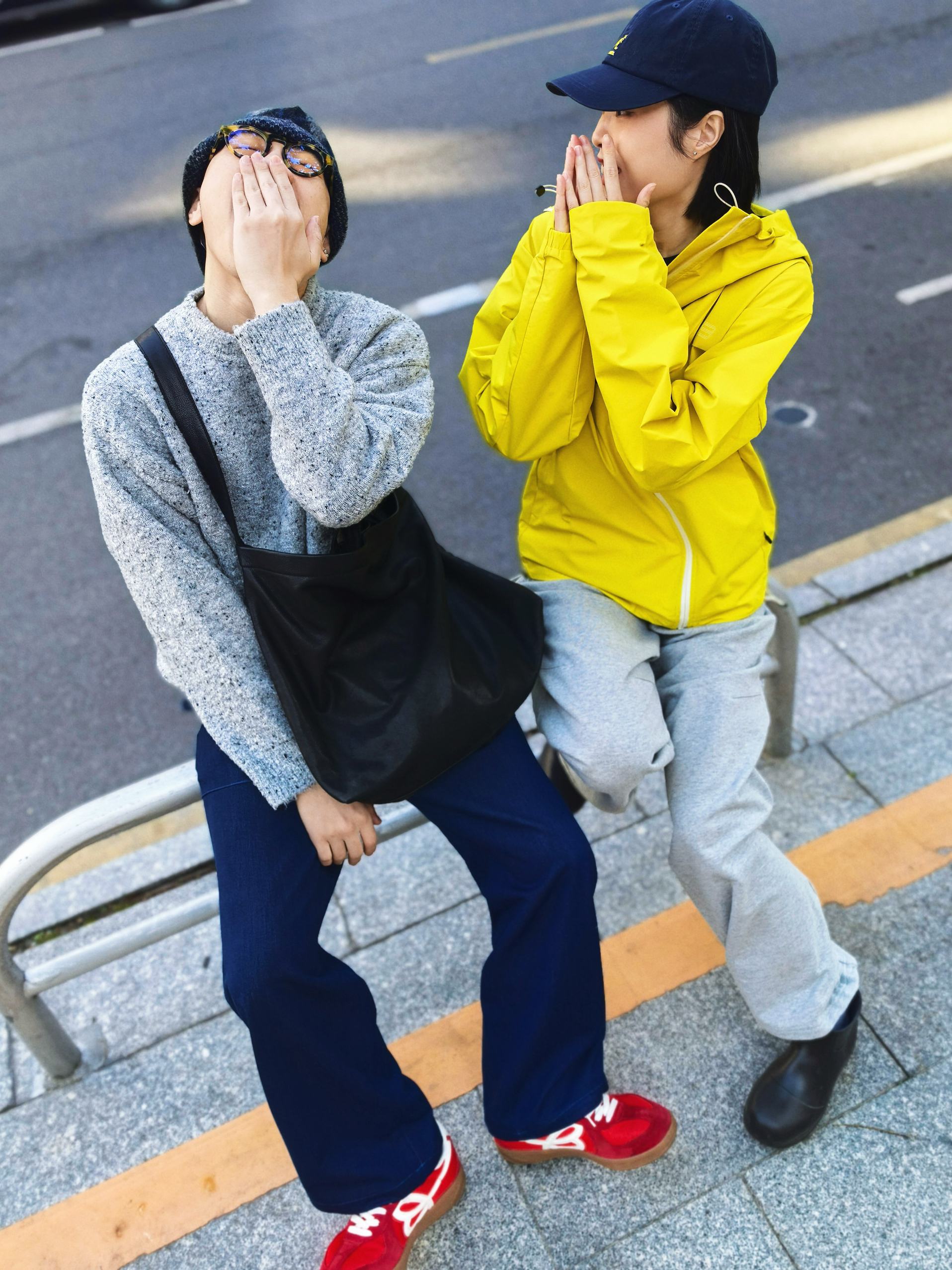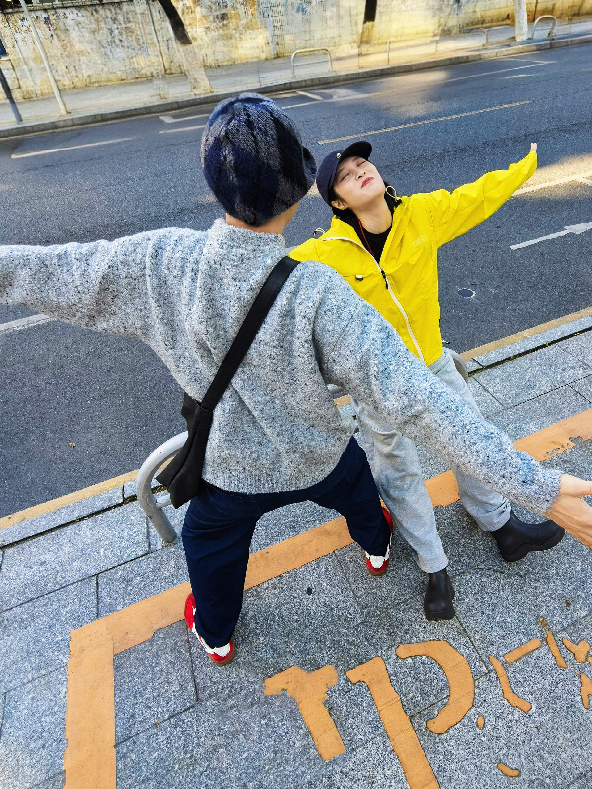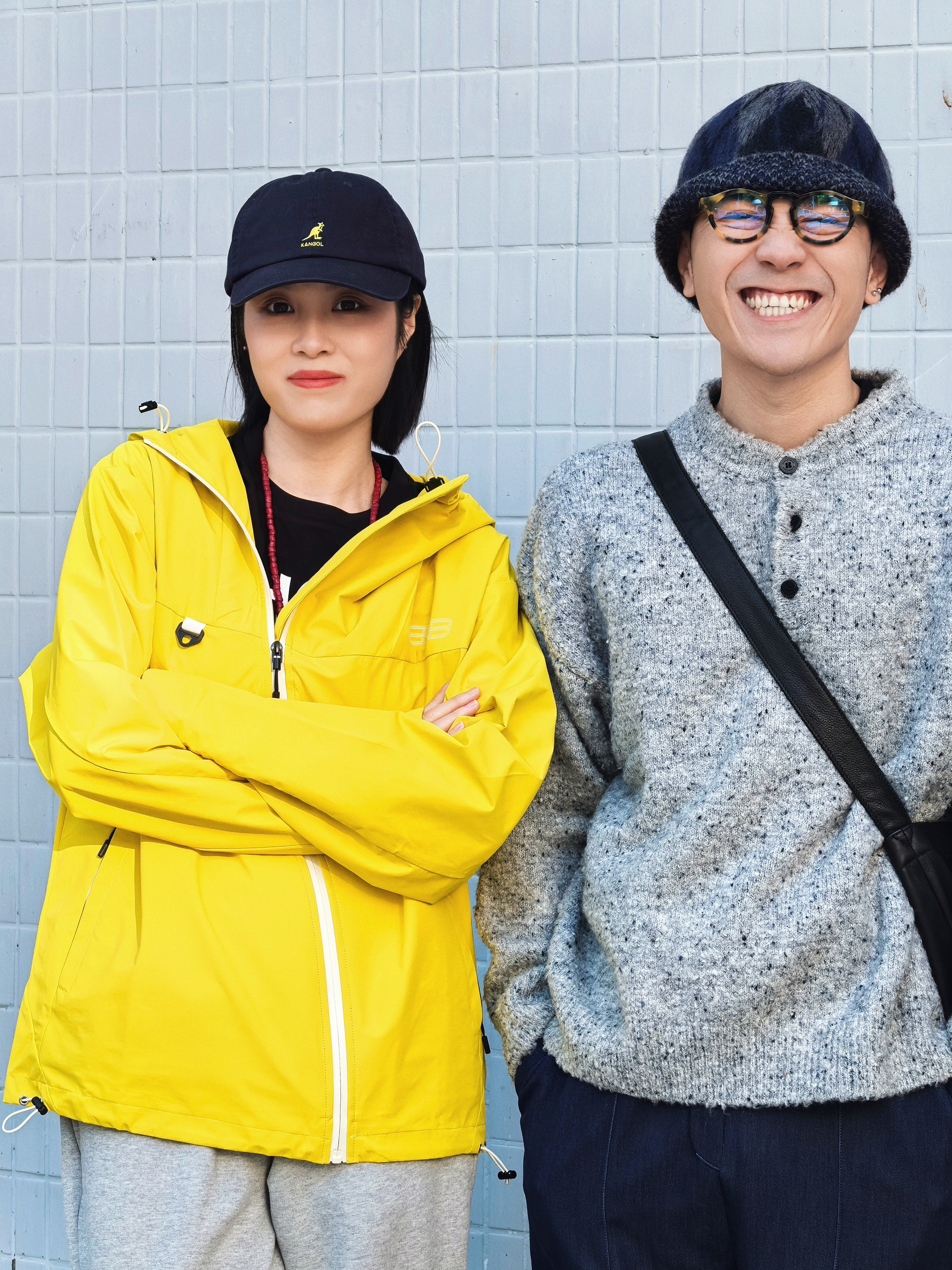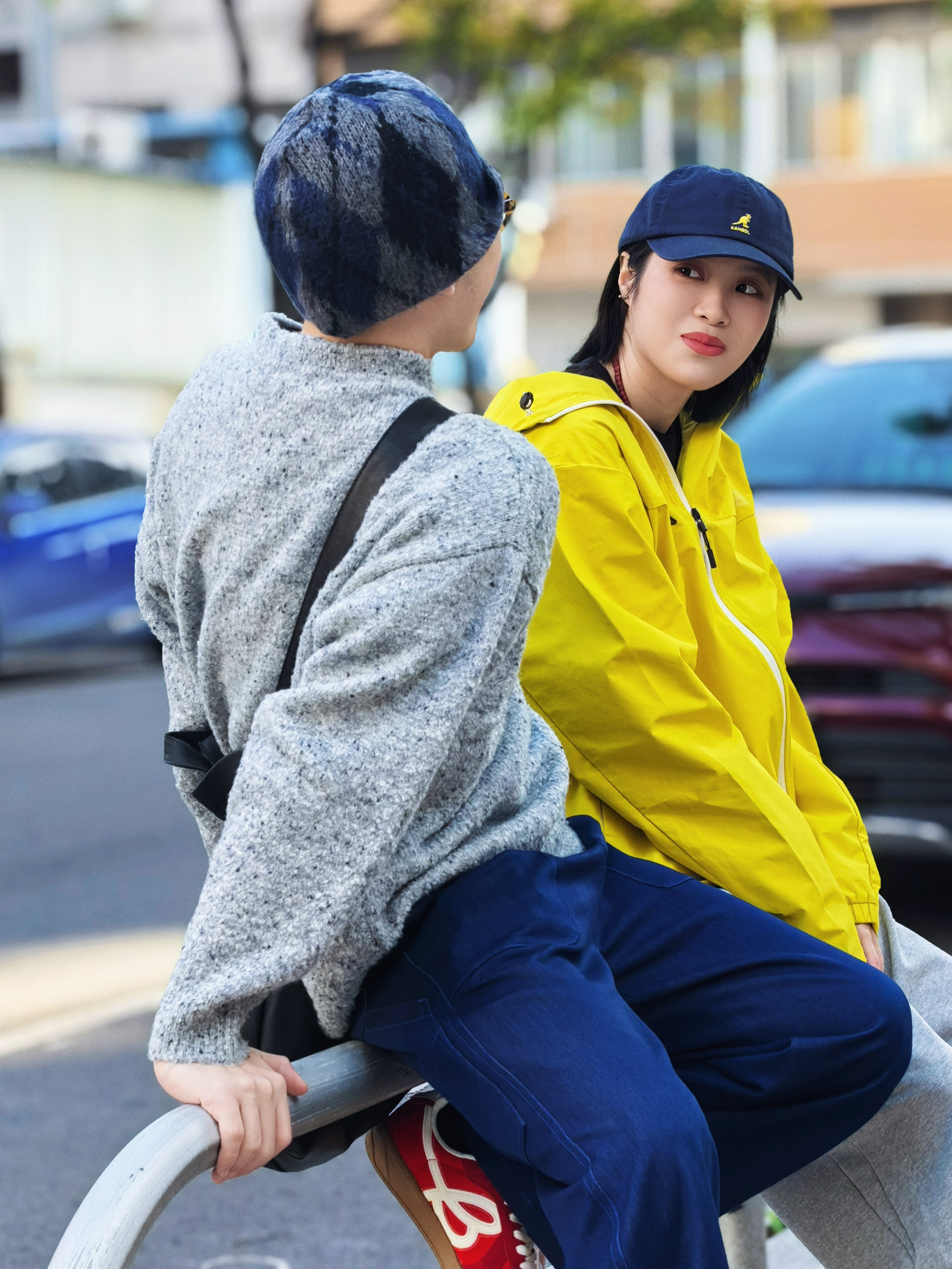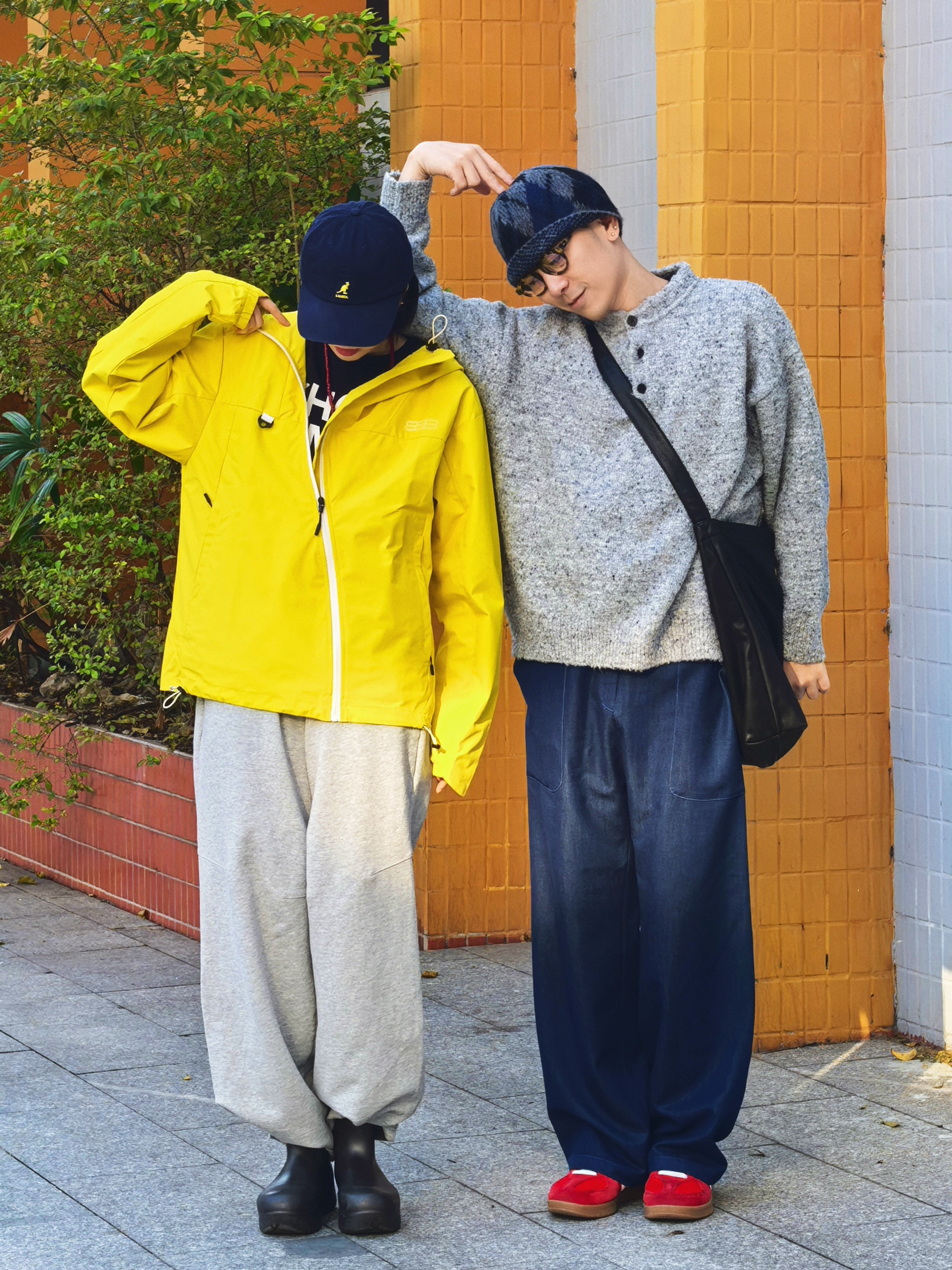 在一起的日子每一个瞬间都是幸福具像化 连穿搭都充满爱💕 - 👧🏻:黄色连帽冲锋衣,搭配浅灰运动裤和黑色雨靴,戴顶深蓝棒球帽,活力又时尚。 👦🏻:深灰针织毛衣,深蓝阔腿裤红色平底鞋和麦麦的冲锋衣相衬,随性又温暖。 - 我们走在一起,日常穿搭都是爱的体现。🥰