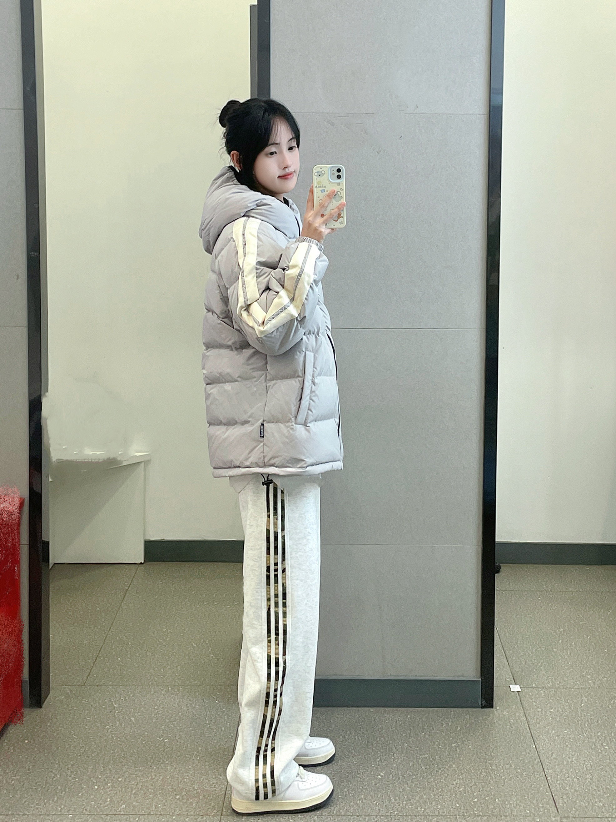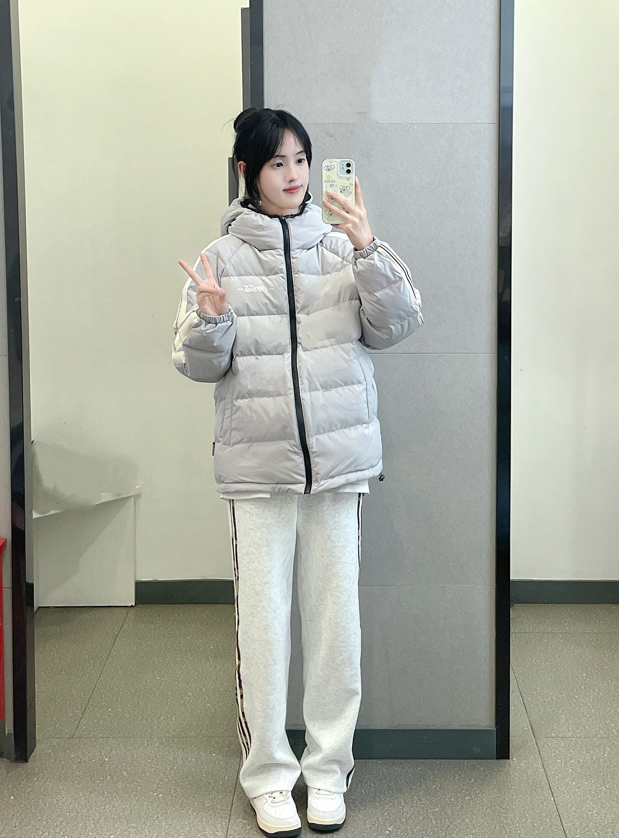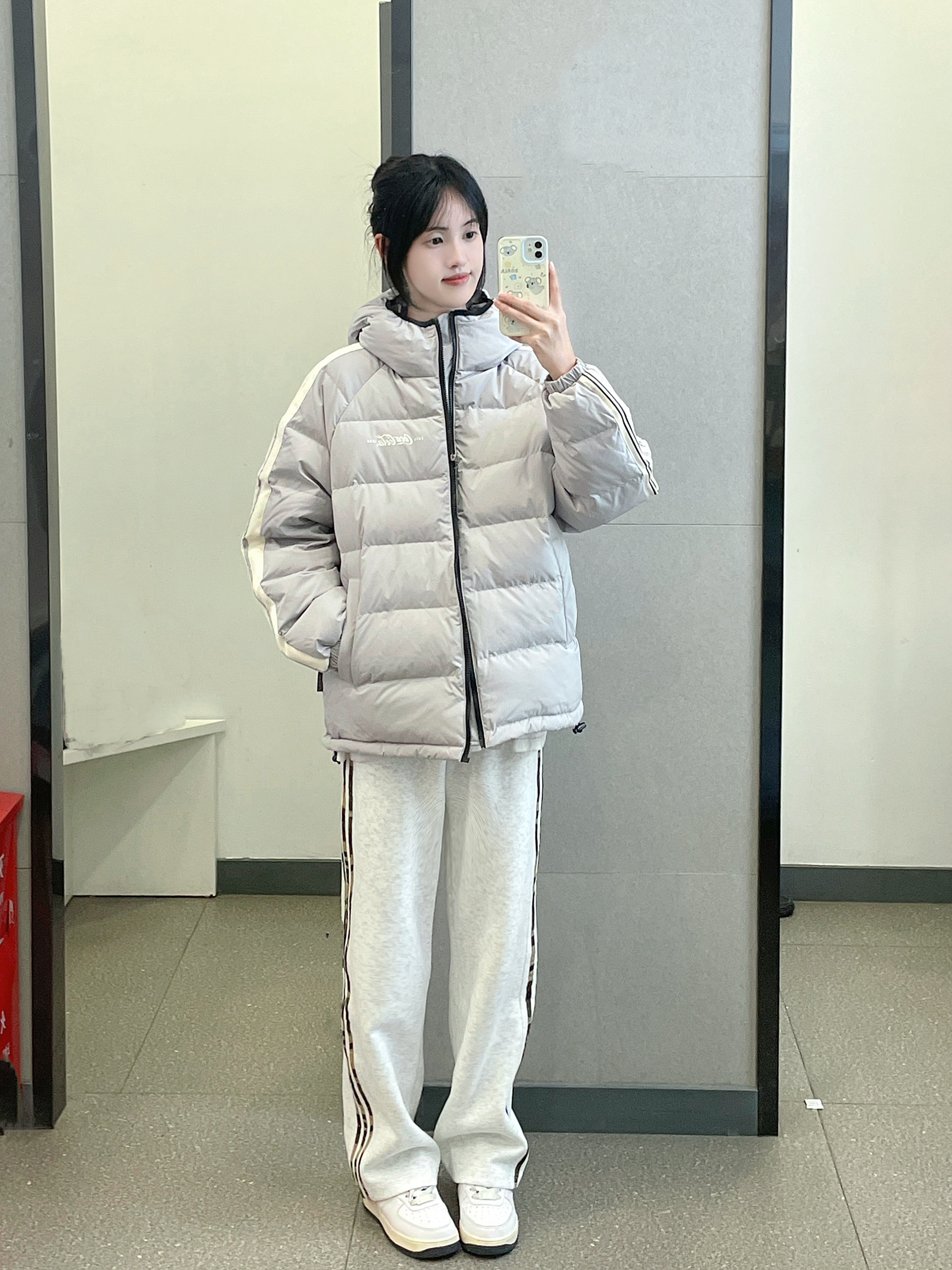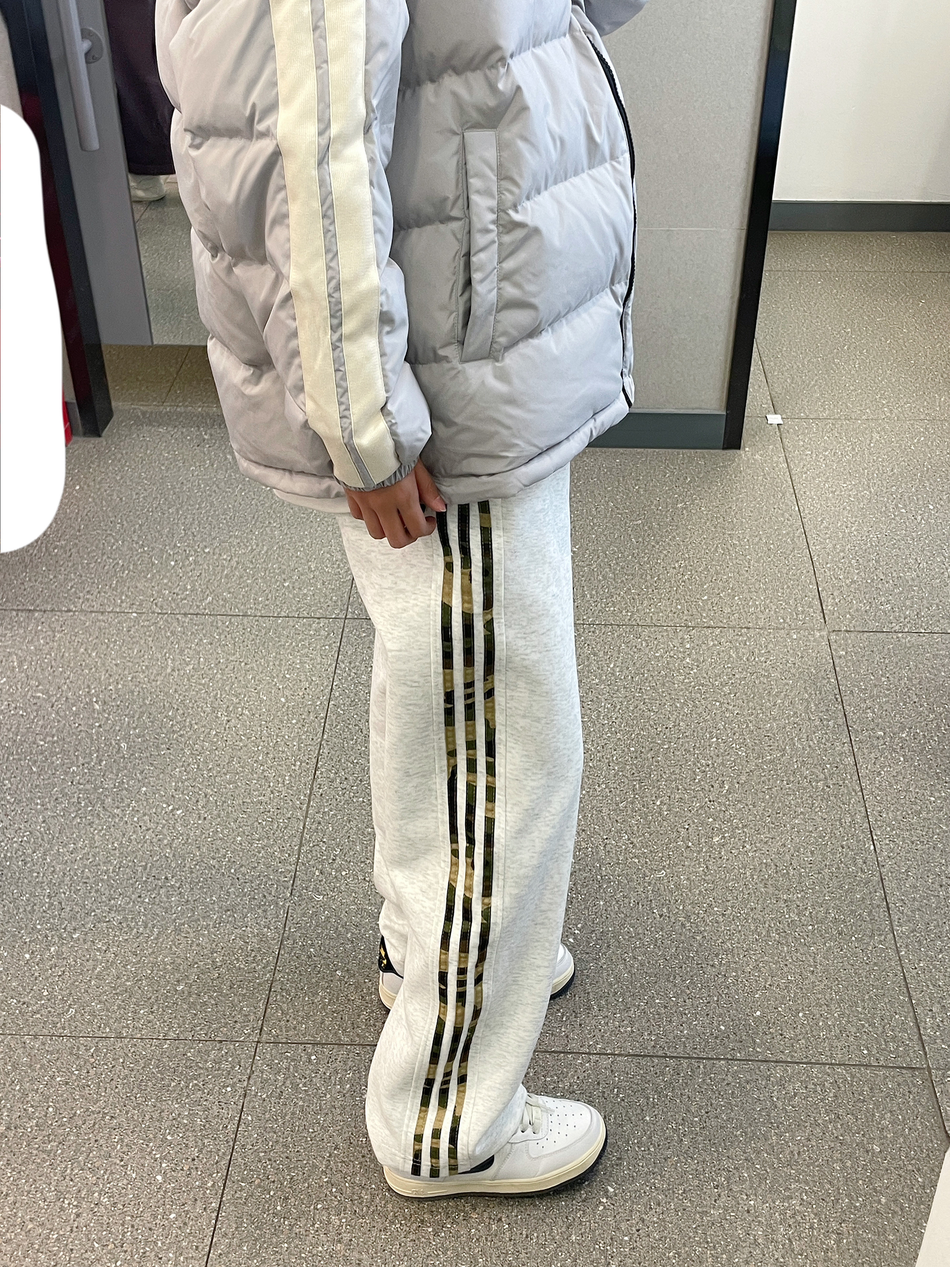 👔 :可口可乐灰色羽绒服 👖 :coldstone花灰色迷彩条纹裤