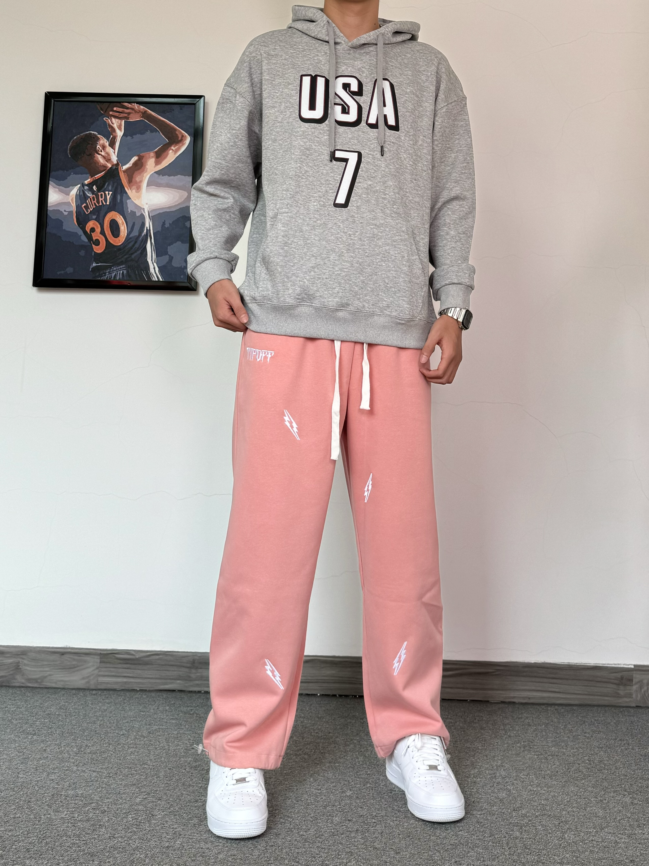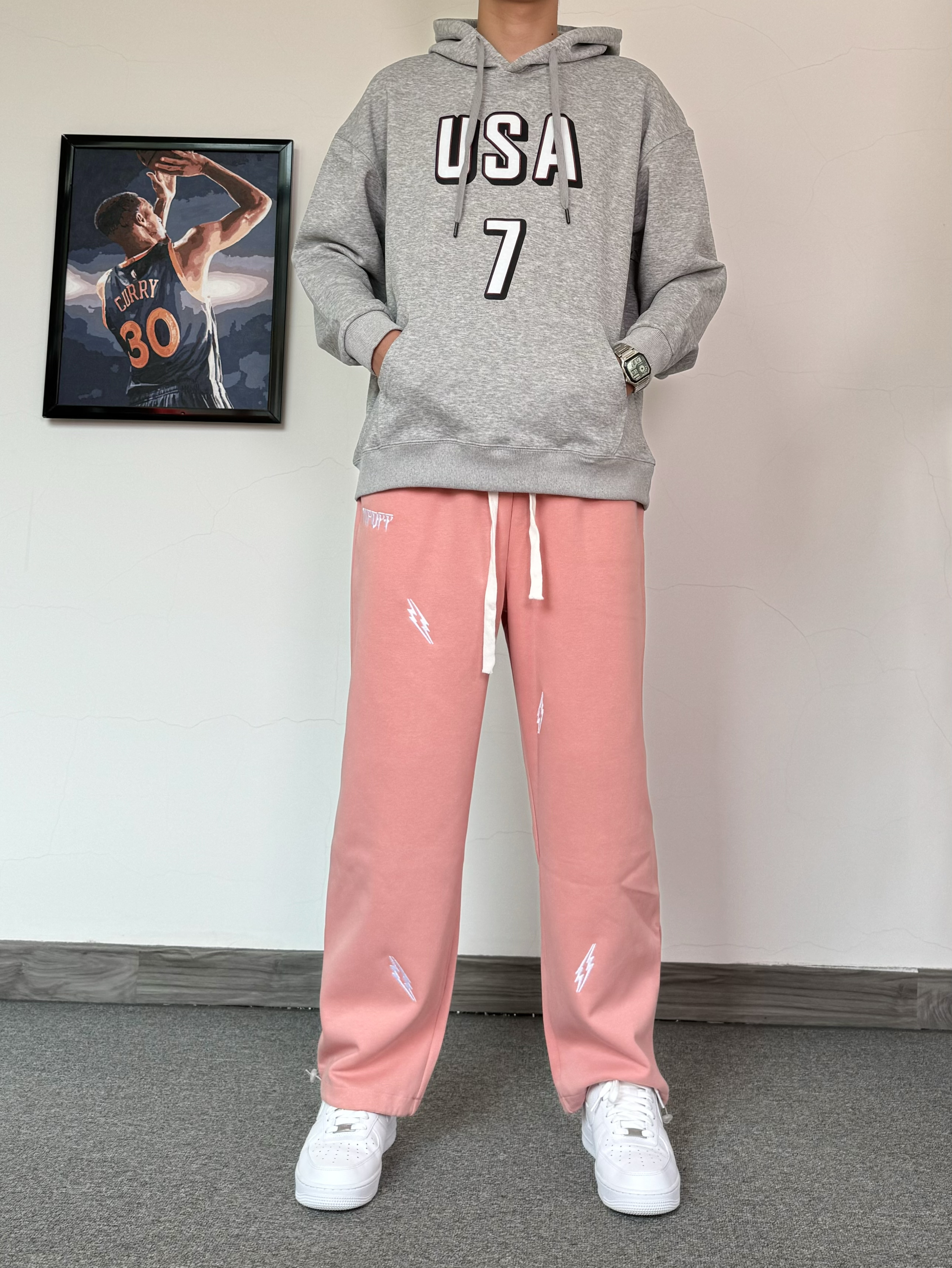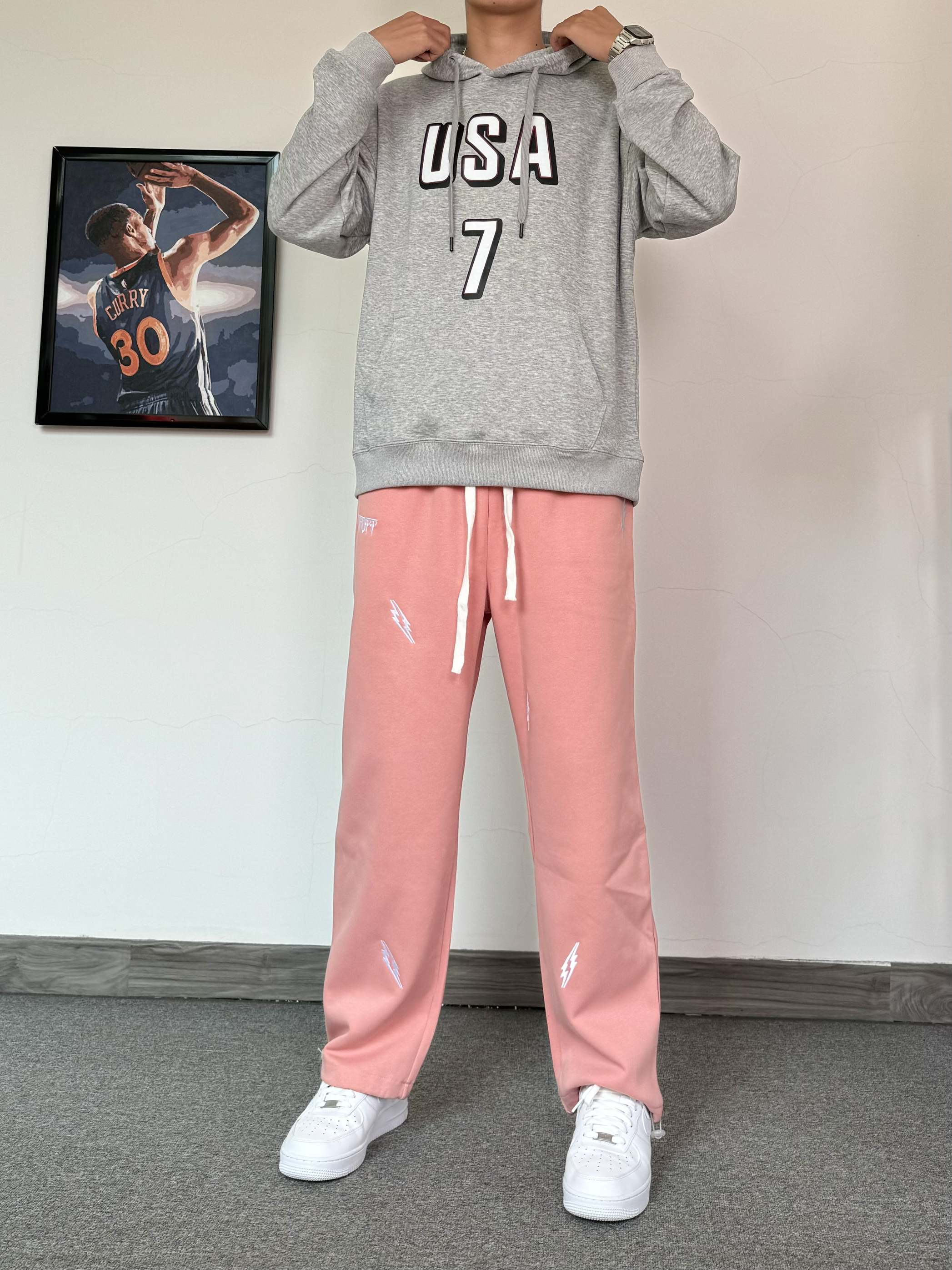 冬日的卫衣穿搭含金量还在上升 基础款字母印花灰色卫衣 搭配粉色闪电⚡️束脚裤 一整个运动感十足 再脚踩纯白色百搭空军 简简单单一套帅气才穿搭