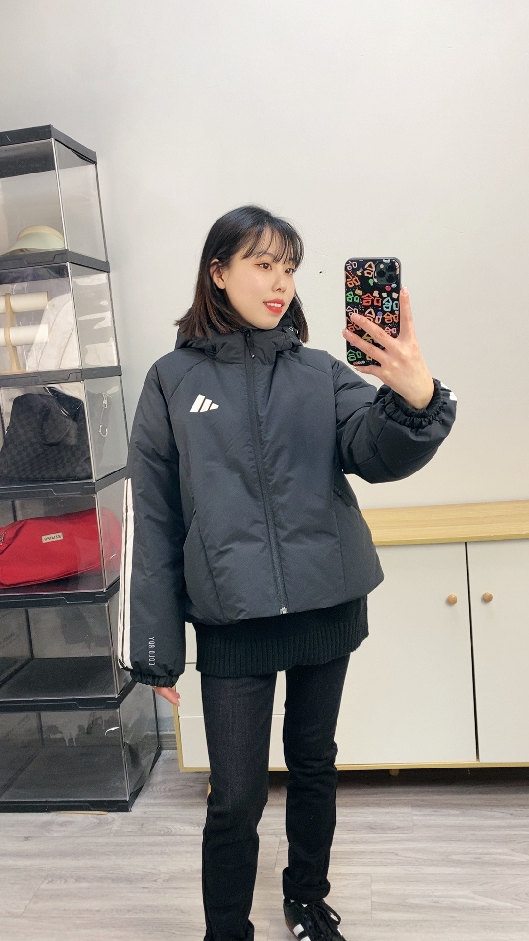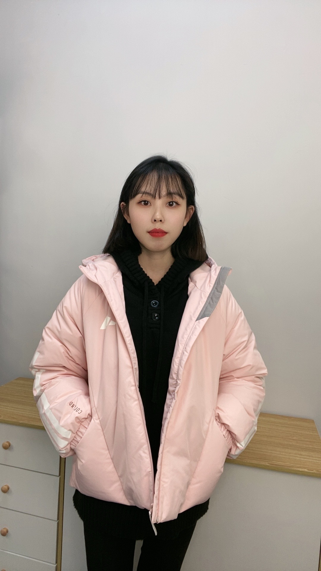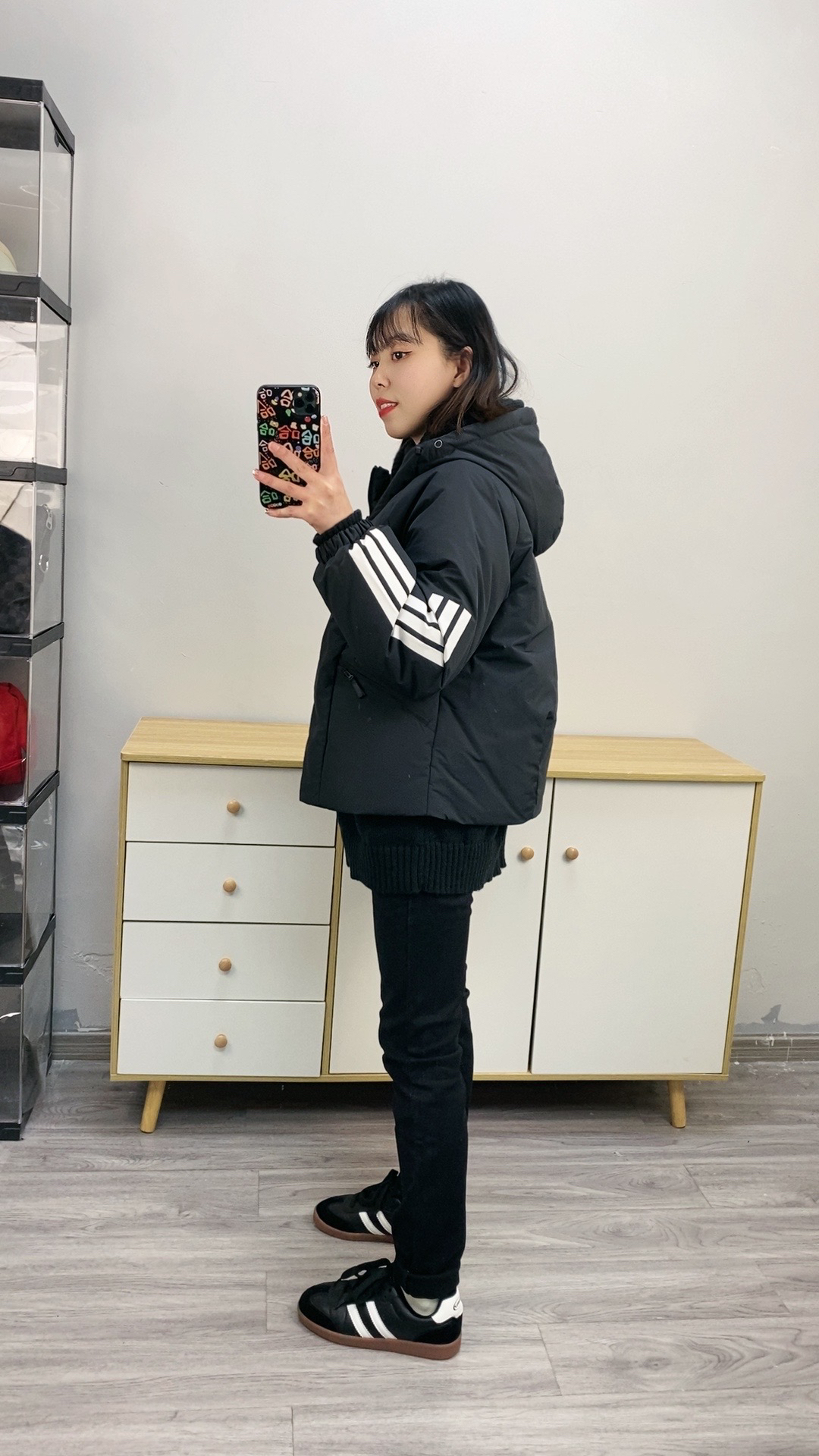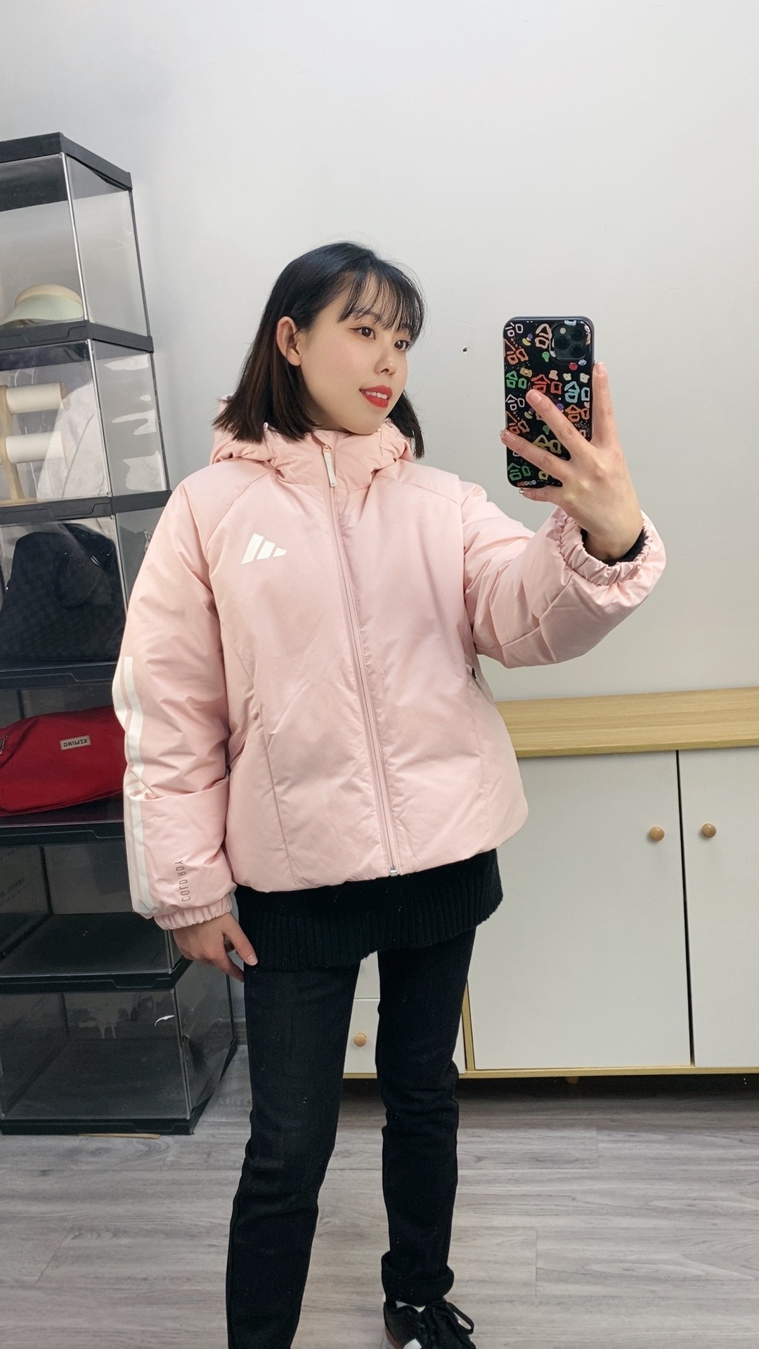 155,86斤,里面穿的中等厚度的毛衣,黑色穿xs码比较合身,粉色穿s码微宽松 面料较厚,防风防水很nice!插肩袖设计不显肩宽,而且它是600蓬的,上身也不会显臃肿 小个子穿个紧身牛仔裤鲨鱼裤之类的还显高显瘦