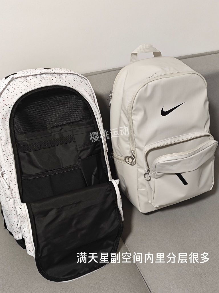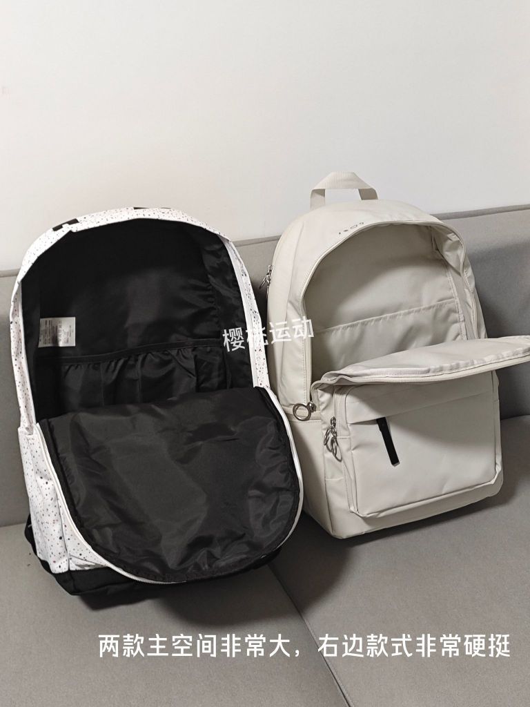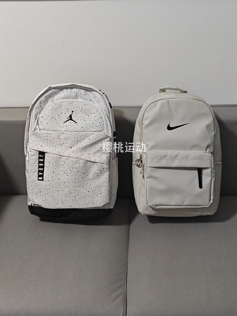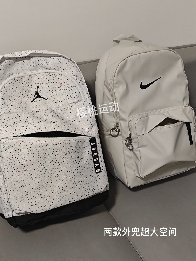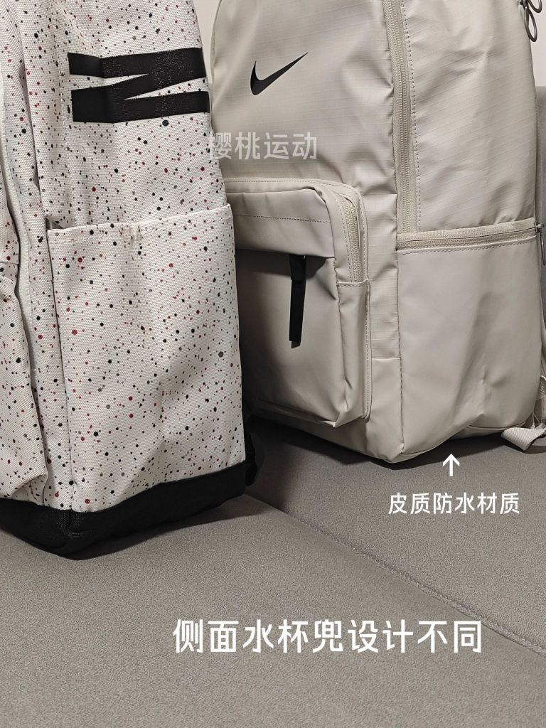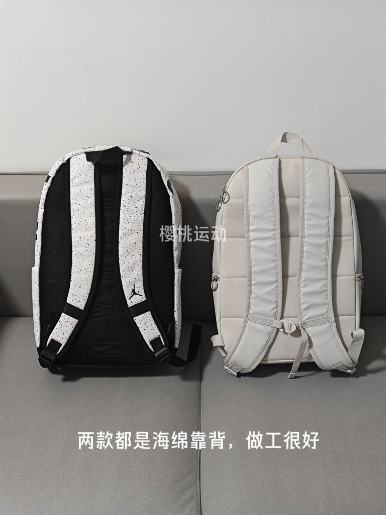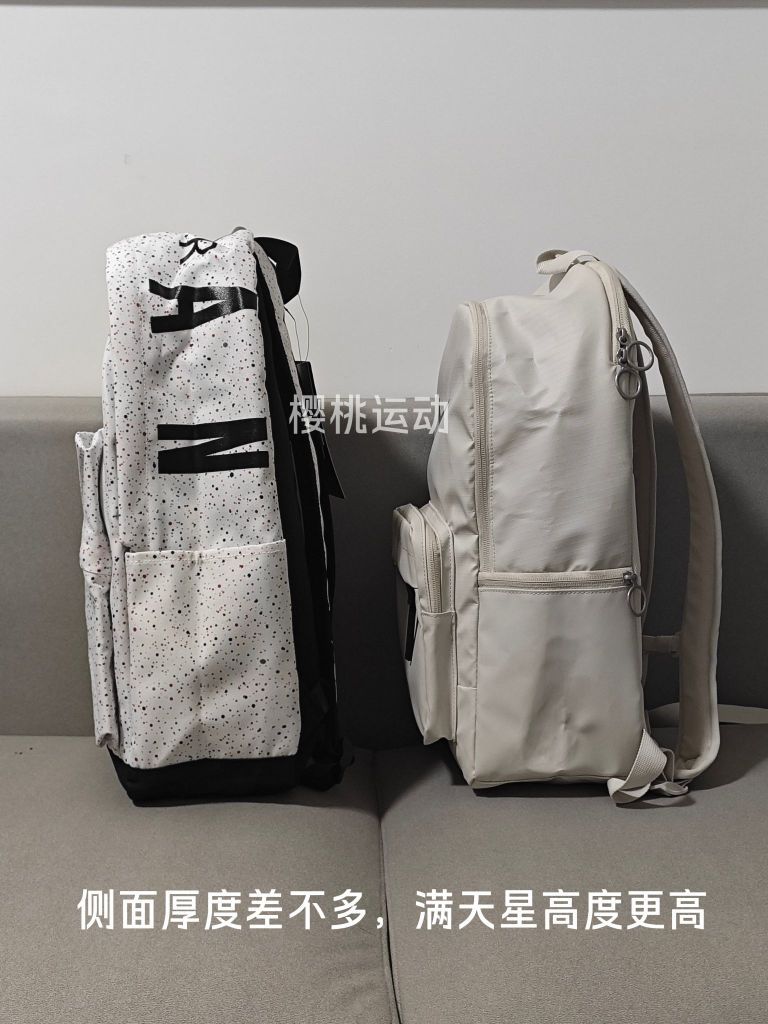 图中左边是Jordan满天星双肩包,右边是Nike浅骨色双肩包 ★容量两款都是属于超级大的双肩包,适合170以上的人群选择,左边比右边还要大一点,但是满天星有中号的缩小版,注意,喜欢的可以考虑 ★右边是皮质防水的材料,质感很好,非常硬挺,左边也是聚酯纤维非常耐磨耐用,总之这两款是非常实用性价比很高的两款 ★所以这两款适合男生,学生党群体,以及经常外出需要大容量的群体选择,颜值和容量都是满分