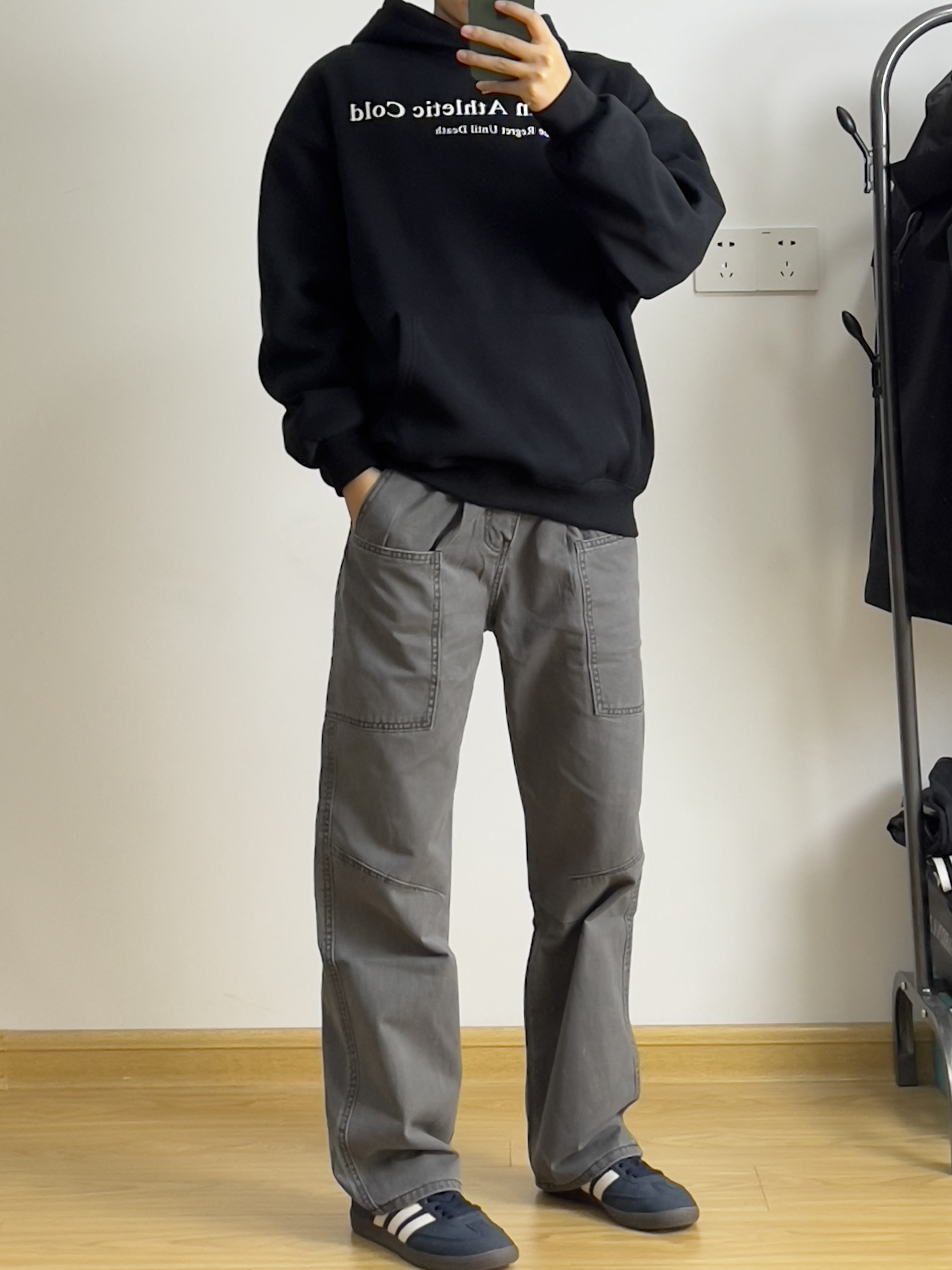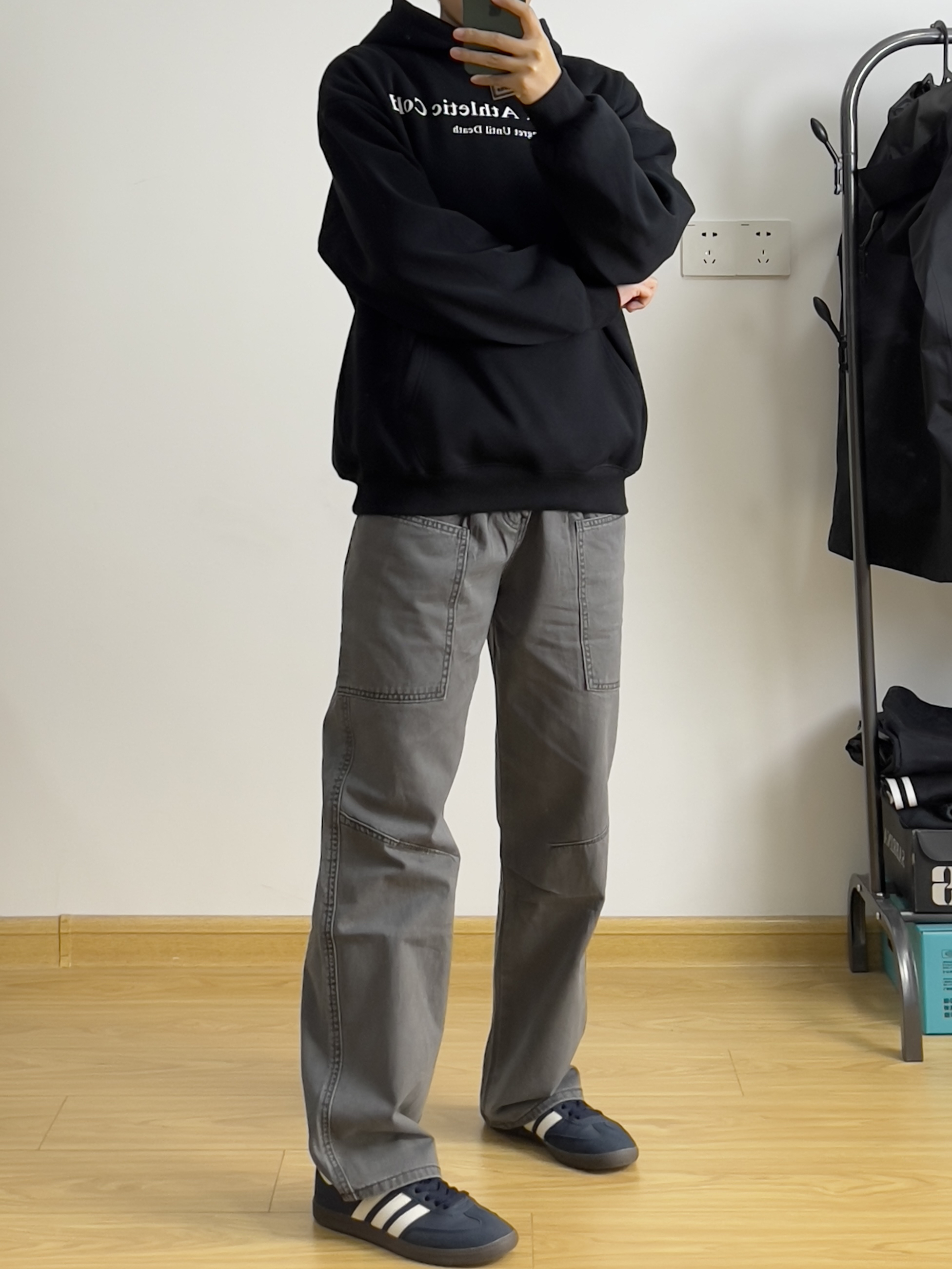 身高|体重:168/95 👔 上衣:黑色标语卫衣真的帅 👖 下装:美式复古工装裤直筒宽松版型很正 灰色百搭耐看 👟 鞋子:阿迪达斯samba