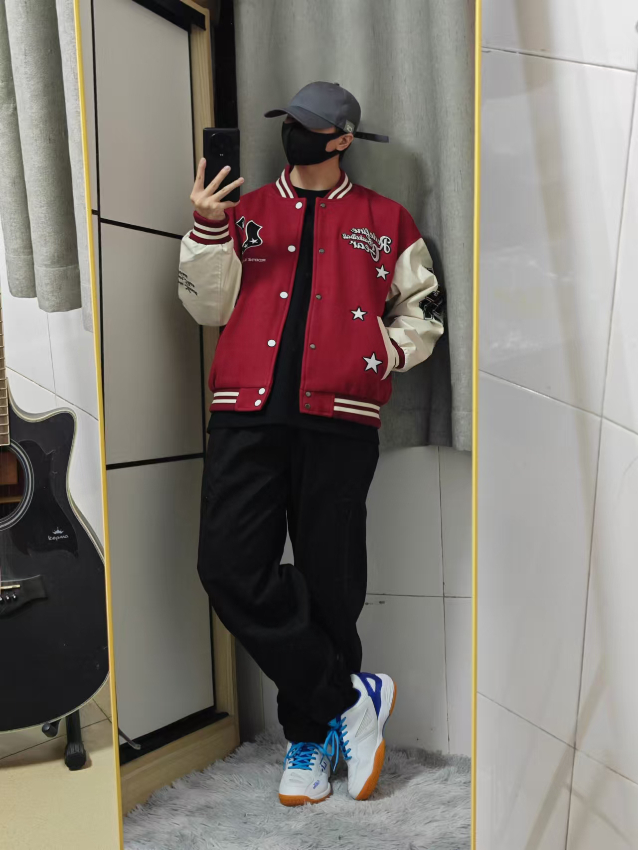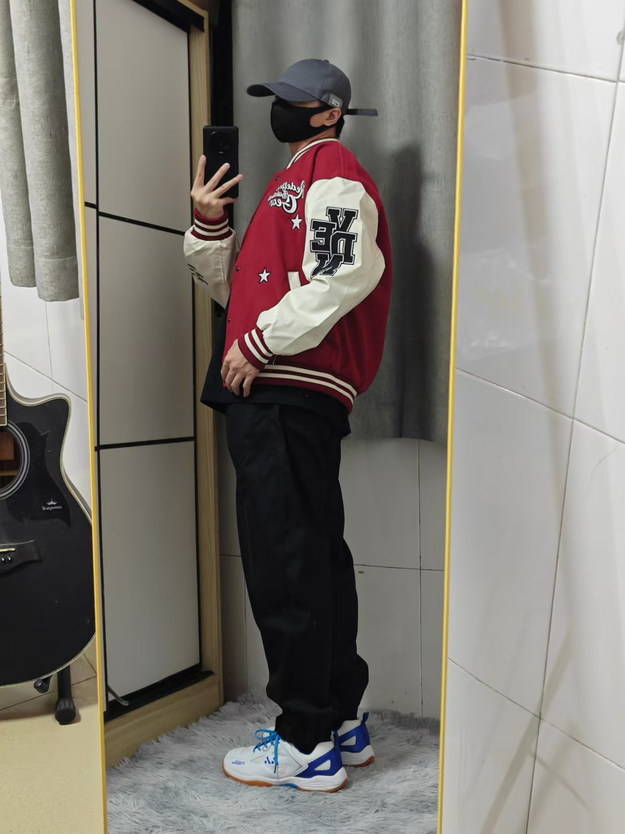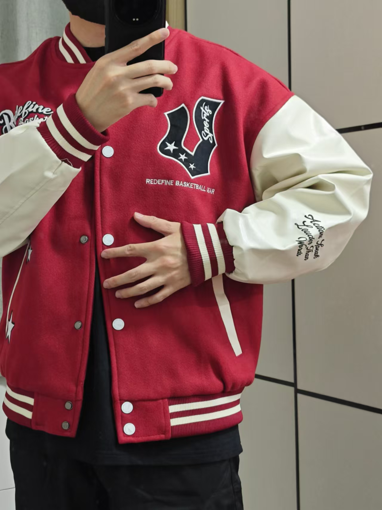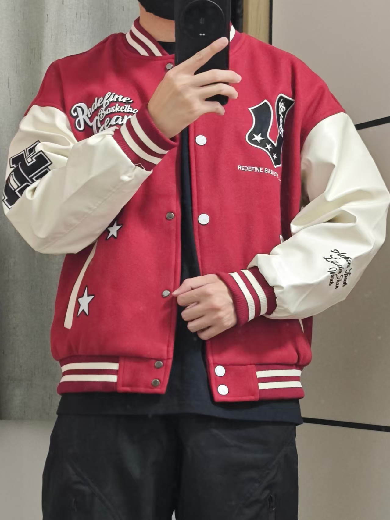 大家好呀! 原来大红色棒球服是这么好看的呀! 到了刚入秋的季节 黑色休闲裤搭配太有feel了白维动 VEIDOORN 家的这一款V它的下摆是偏短款的 所以搭配的话里面可以穿一件稍长的T恤或者卫 衣 都能突显挺不错的层次感来 少年感十足啦 裤子:我选择了这样子一款黑色的休闲直筒裤 黑色搭配红色是什么感觉呢! 你们觉得咋样子这样搭配?