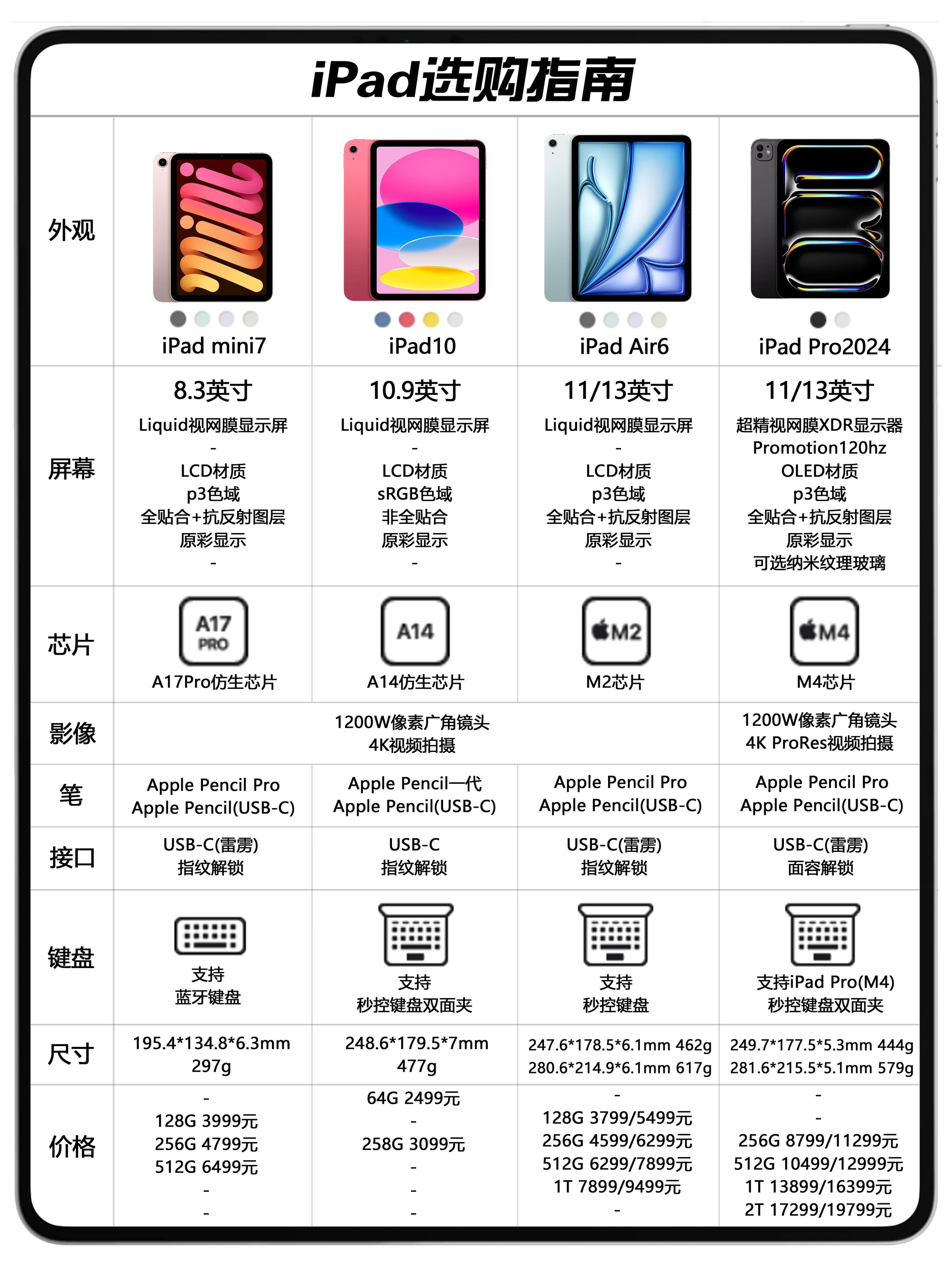 2024年马上结束了,也正逢双十二,给大家整理一下今年的ipad全系列推荐。 推荐的机型有今年发布的ipadmini7,ipadair6,ipadpro2024以及去年发布的ipad10。 1️⃣ipadmini7:这是一款小尺寸的pad,曾经被誉为最强游戏神器,但目前由于CPU性能不太激进了,因此热度降低了不少,但对于有便携需求的用户来说,ipadmini是你唯一的选择!这代CPU升级到了a17...