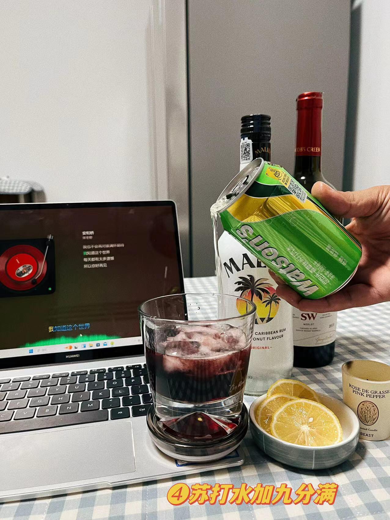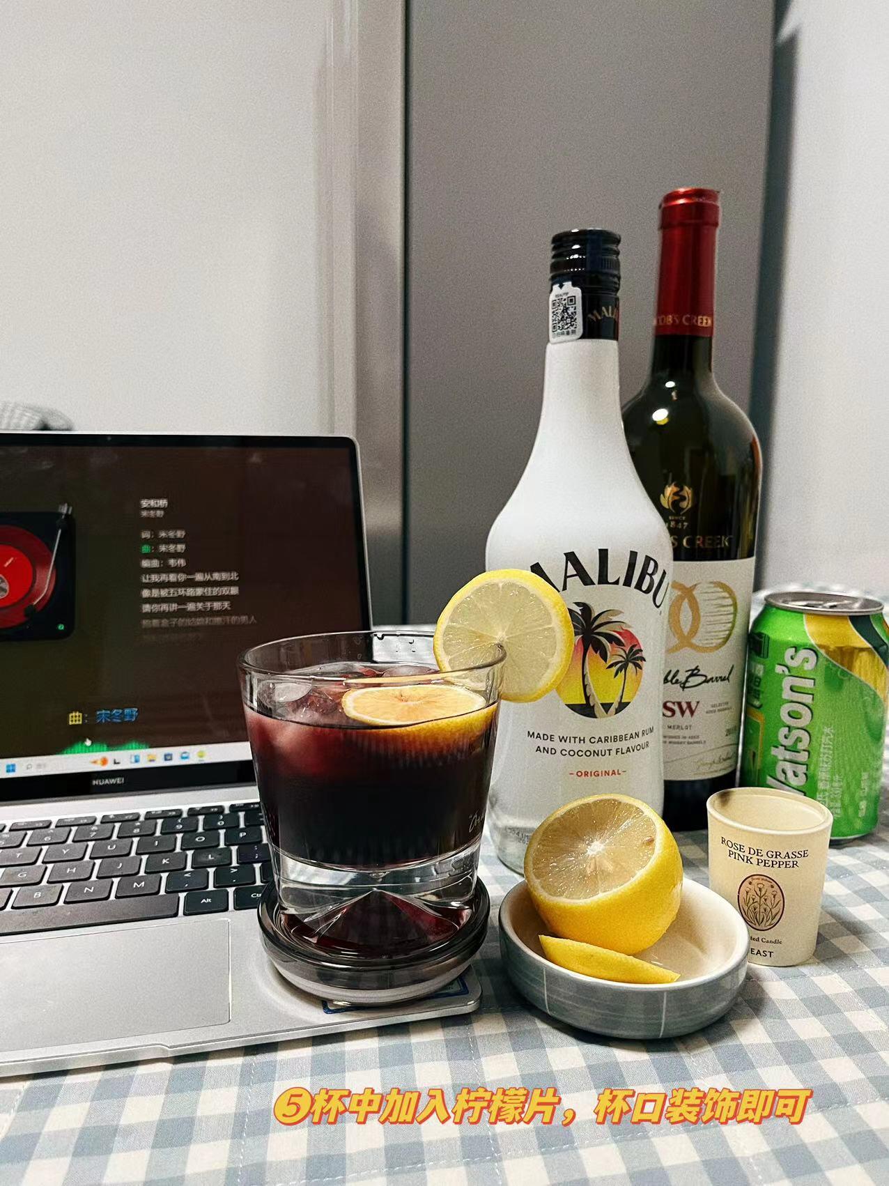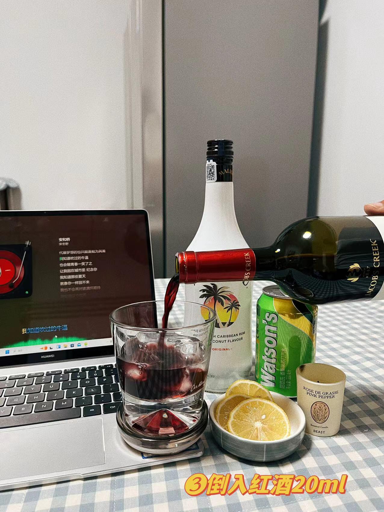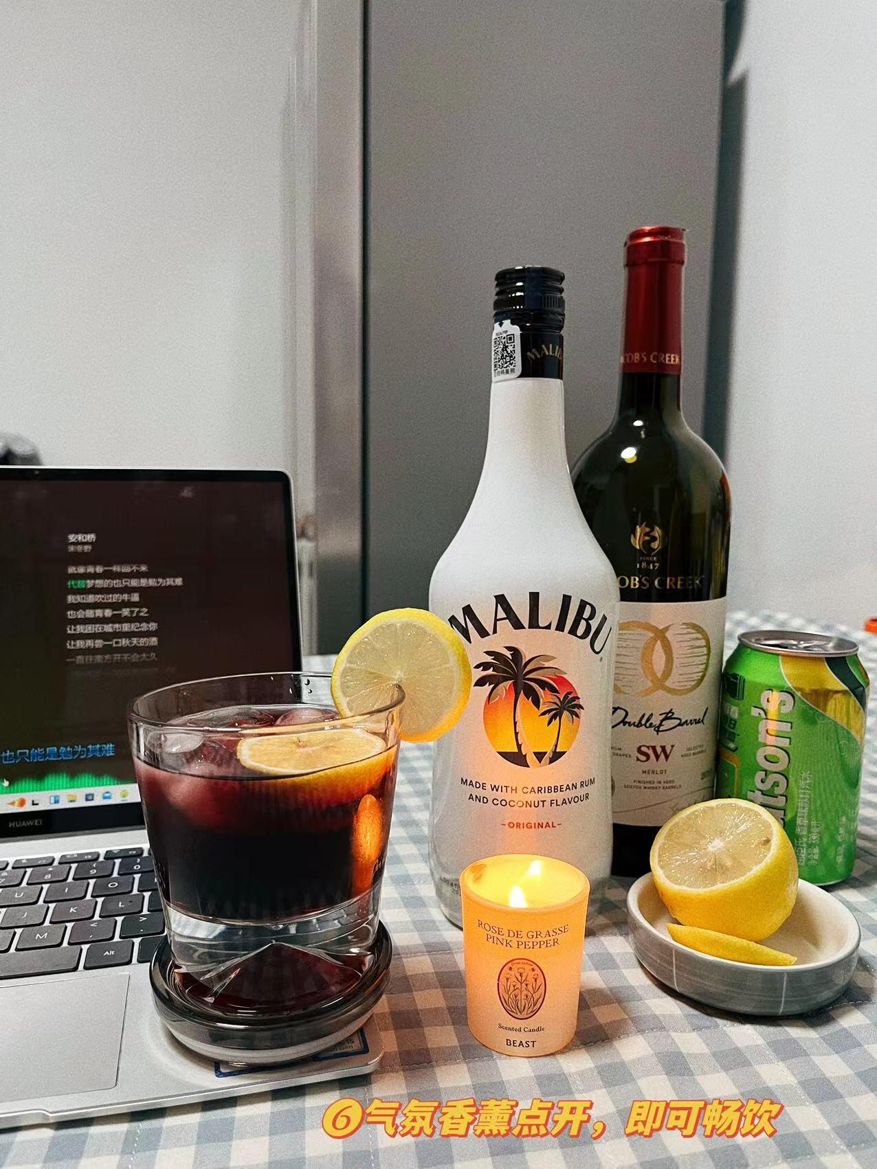 今日易微醺马利宝椰子调酒🏝 《红酒椰椰》 推荐理由:夏日炎炎,有你超甜,下班窝在家里听一首喜欢的歌,调一款有趣的酒,简直不要太惬意,这是一款清爽且随性的鸡尾酒,洋酒加红酒的碰撞组合,新颖且有趣,生活要尽心,也要随心,更要开心,热爱漫无边际,努力去听风的声音,就不必在意风的方向~ 准备材料: 马利宝椰子30毫升 杰卡斯红酒20毫升 冰块🧊香草苏打🍶 香薰🕯柠檬片🍋 制作步骤:取一个好看的玻璃杯,杯中...