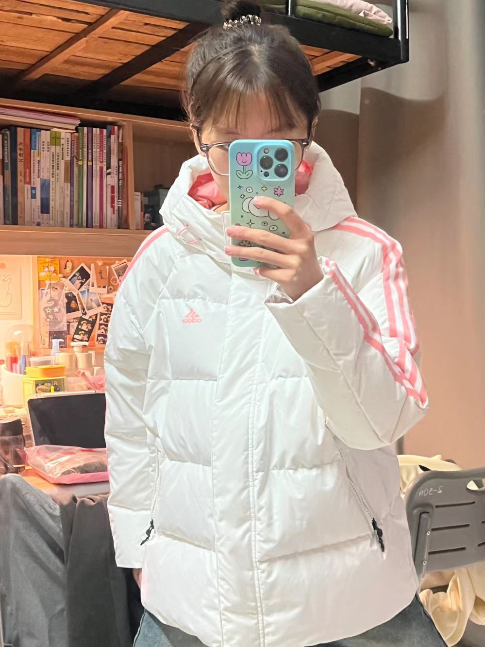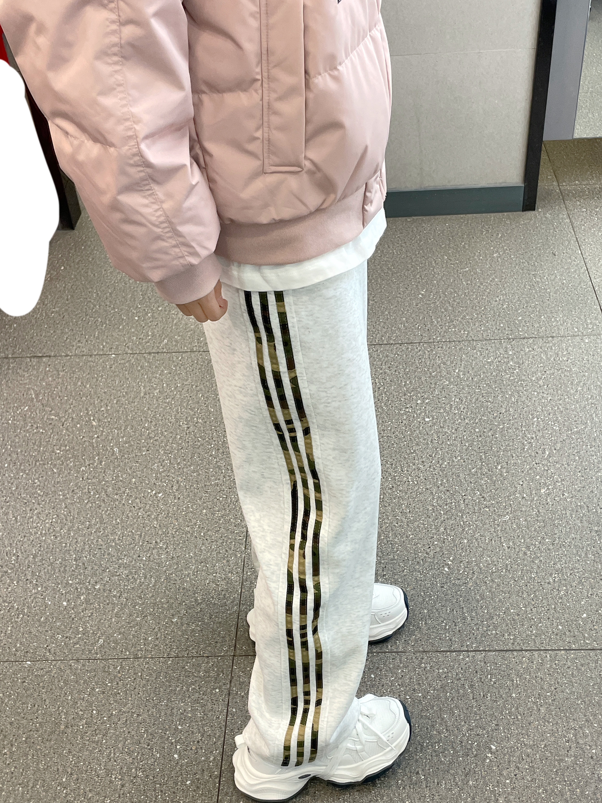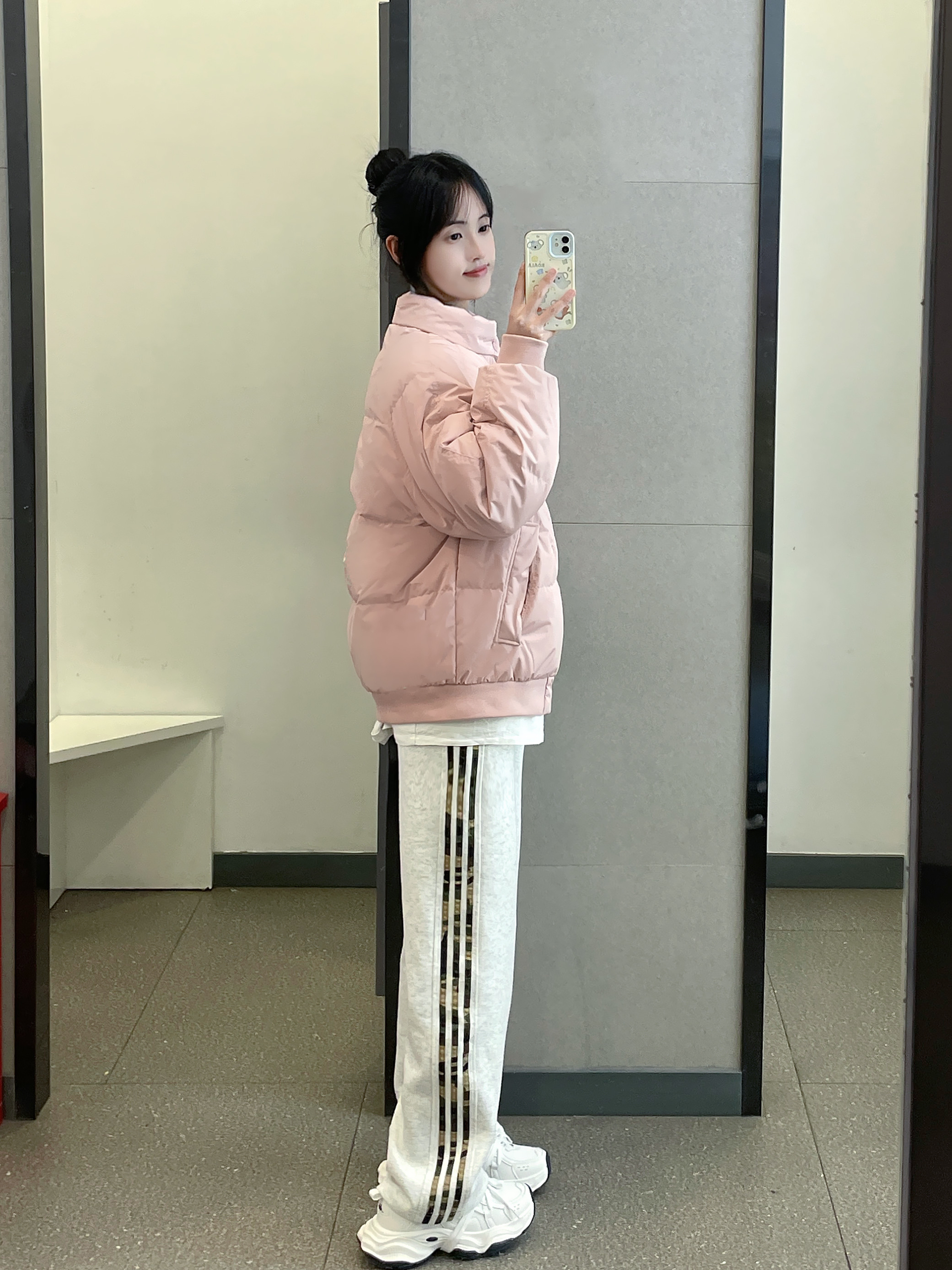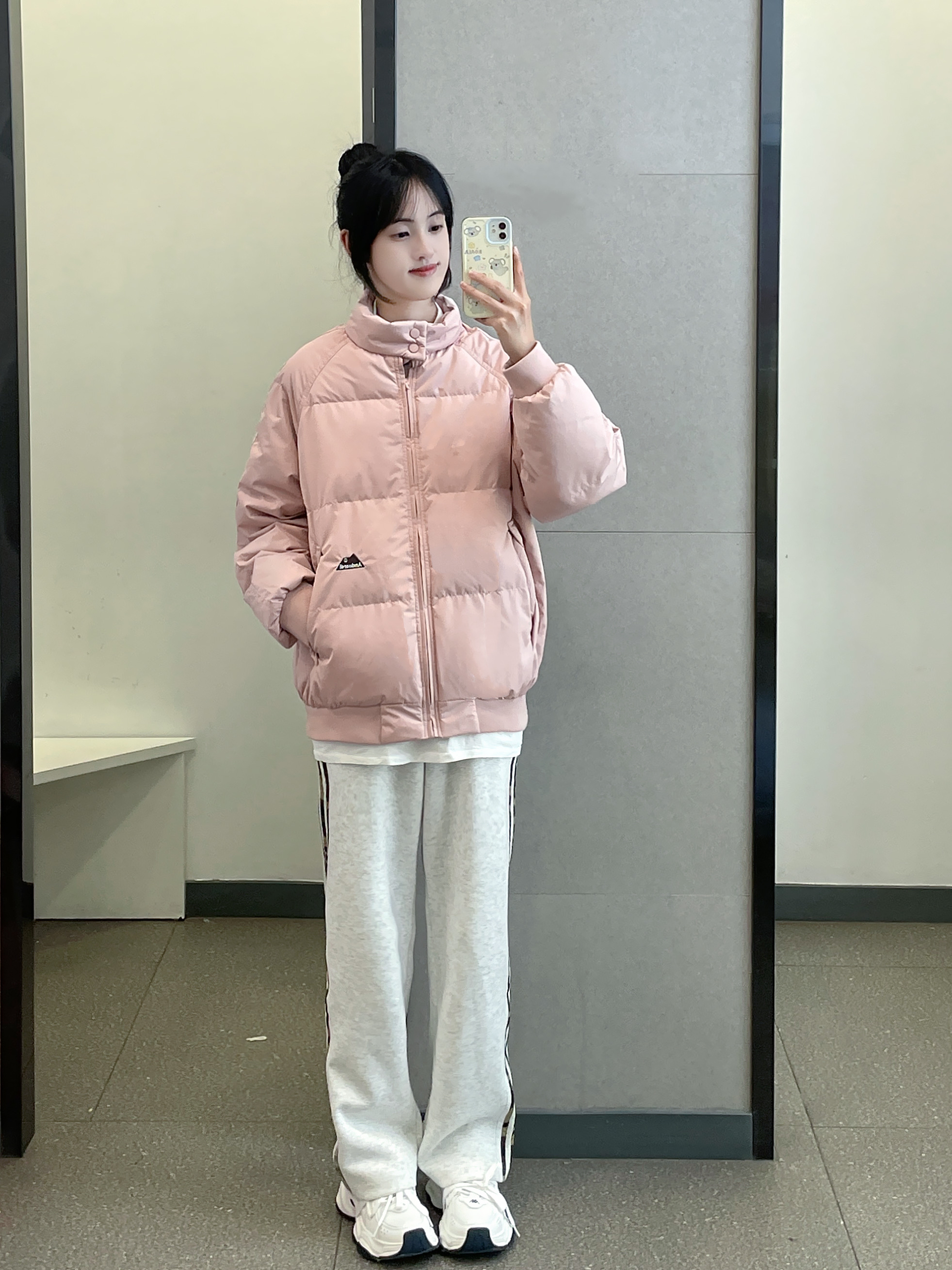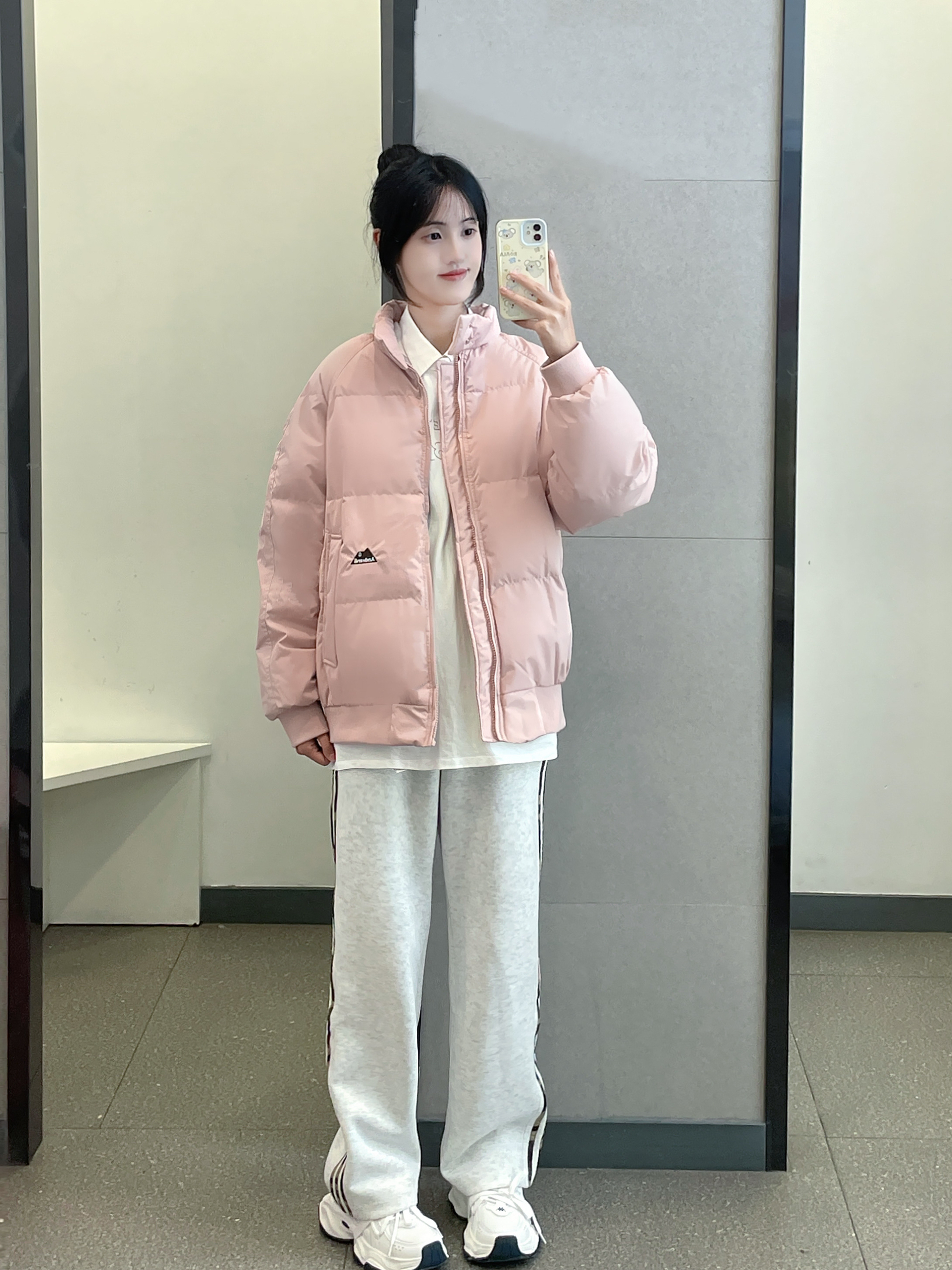 👔 :OWOX粉色羽绒服 👖 :coldstone花灰色条纹裤 👟 :Kapap白色运动鞋
